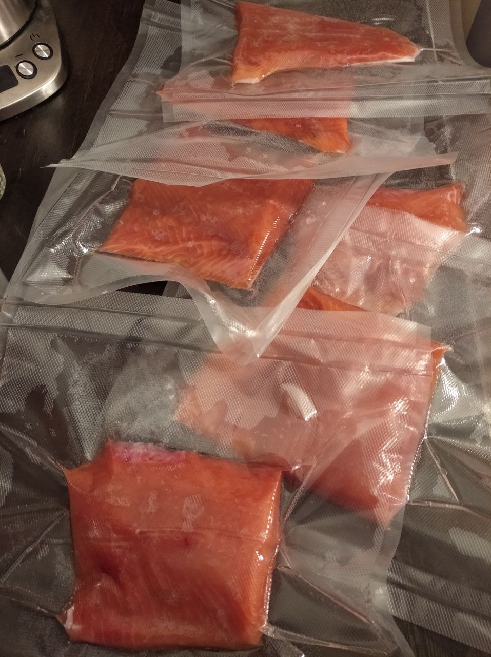 >Насколько я понял, лучше хранить в морозилке либо вакуумировать? Я сразу решил взять вакуум >>630941 , и солить прямо в нем, считаю это вообще лучший вариант. Рыба солится в своем тузлуке, поэтому получается полусухой посол, и рыба получается сочная. Храниться в вакуумных пакетах теоретически она может до месяца, но я дольше 10 дней не хранил. Ну и удобно, когда каждый 200г кусок в отдельном пакете, вскрываешь один, а остальные продолжают герметично лежать и ждать своего часа. Вообще норм вакууматор можно взять за 5к, зато с ним значительно удобнее, если хочешь регулярно солить рыбов.