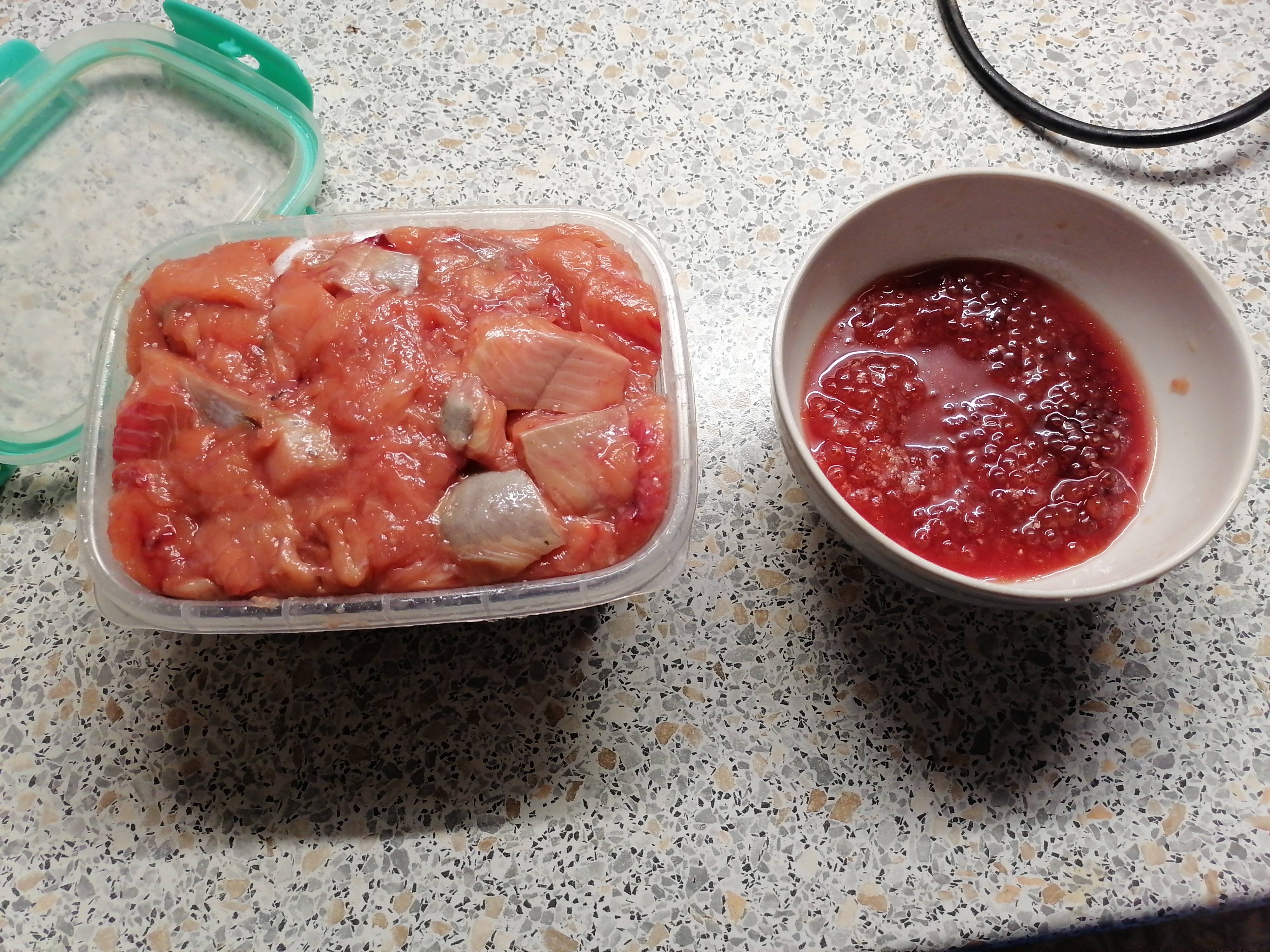 >>634339 Засолил с каменной солью и медом из чабреца. Увеличил дозировку смеси до 4% соли и 2% меда. В прошлый раз, когда солил кижуча, один кусок был не с сахаром, а с медом, и он мне особенно понравился. А по дозировке - показалось, что классические 3% и 1.5% - маловато. Правда рыба не до конца разморозилась, 24 часа при +2 для неразделанной рыбы оказалось маловато. Но завтра работаю, и выбора не было, пришлось сегодня. Разделывать килограммового лосося конечно то еще "удовольствие", особенно срезать ребра, где слой жирка на животе крайне тонкий, учитывая крайне нежное мяско. Если остальные гольцы будут попадаться такие же небольшие, вероятно буду резать и солить стейками, а полноразмерных пацанов, типа кижучей, филеровать как обычно.