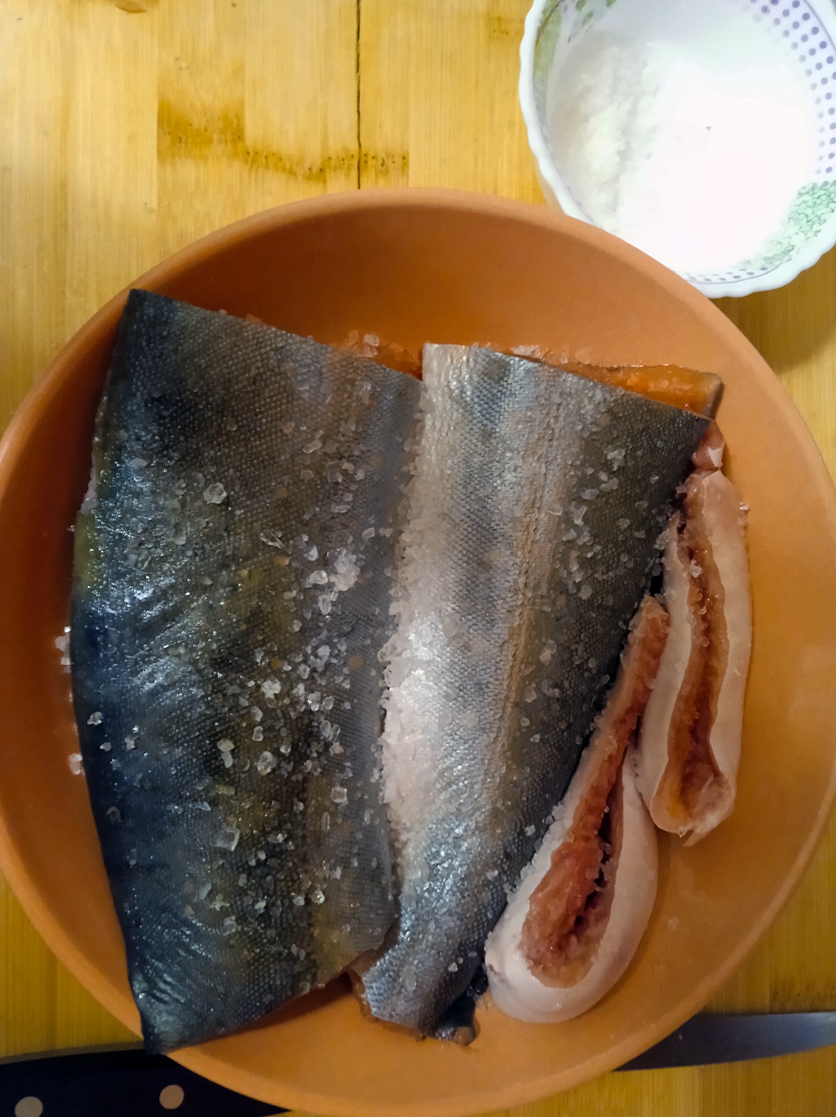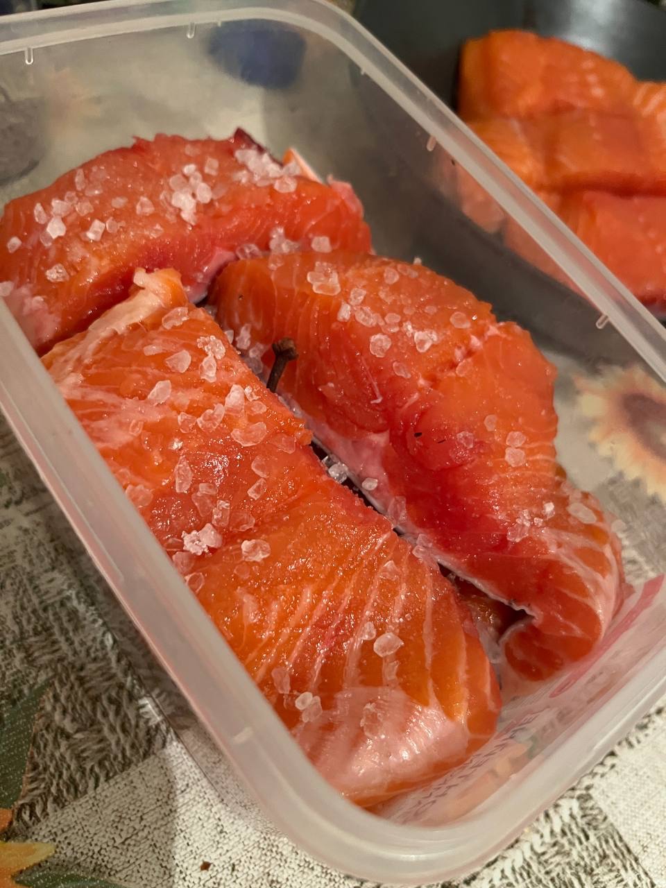 Годы шли, а я вдруг понял, что я по прежнему регулярно запекаю скумбриевича, и никак не развиваюсь в кулинарном плане, и не готовлю из рыбы ничего другого. Больше всего тянуло к слабосоленой красной рыбе, потому что на планете нет ничего вкуснее, особенно если она жирная. Изучив рынок, оказалось, что лучший выбор - дальневосточный (тихоокеанский) лосось, разумеется, дикий. Царица лососей - Чавыча, дворяне - кижуч и нерка, купцов представляют голец, кета и горбуша. Семга и форель на рынках практически все с ферм, поэтому они не рассматривались. Первой жертвой стал кижуч - сочный, спелый, двухкилограммовый. Приступаем к делу! Чтобы сохранить текстуру и вкус мяса, разморозил за сутки на верхней полке холодильника при +4. С помощью обратной стороны ножа, соскоблил слизь с тела рыбы, чешую убирать не стал, ибо не вижу необходимости. Тщательно протер пацана снаружи и изнутри бумажными полотенцами, поскольку потрошеную рыбу мыть нельзя, особенно перед засолкой, во первых мясо впитает влагу и станет рыхлым, во вторых быстрее начнет портиться. Полотенец потребовалось много, периодически протирал рыбу, доску и нож в процессе разделки. Разделав на филе, подготовил посолочную смесь. Соль только каменная/поваренная, не йодированная, морская тоже не подойдет, ведь в ней, помимо хлорида натрия, содержится йод, кальций, и другие микроэлементы, которые сделают наружный слой мяса жестким, а йод и вовсе обжигает мякоть. Помол соли должен быть только крупный, идеально - помол №3, где размер кристаллов от 2 до 5мм. Соль мелкого помола мгновенно растворится, пересолив и сделав жестким наружный слой мяса, и недосолив глубинные слои, поэтому только крупная каменная соль. Взял еще пакет помол№4, но там уже адски большие куски до 15мм, это как то перебор. Сахар - второй ингредиент, необходимый при посоле. Дозировка слишком мала, чтобы сделать хотя бы намек на сладость, но достаточна, чтобы не дать рыбе пересолиться и задеревенеть, а также чтобы немного усилить вкус рыбы. Говорят, что с медом вкуснее, поэтому один кусок я сделал с добавлением меда, в качестве теста. Получилось 6 кусков от 190 до 280гр, а значит для каждого куска нужно было рассчитать дозировку, ну это дело пары минут. Солить на глазок, "как получится", не стал. Дозировка стандартная: соль - 3% от веса филе, сахар или мед - 1.5%. Соль и сахар перемешиваются, и кусок обваливается в смеси со всех сторон. В случае с медом - сначала кусок натирается медом, затем обваливается в соли. Вакуумирование. Если нет вакууматора, можно положить рыбу в блюдо, укутав пищевой пленкой, и убрать в холодильник на 1-2 суток, дольше лучше не надо, из за негерметичности. Но я хочу, чтобы рыба дольше хранилась, как минимум неделю, поэтому решил завакуумировать куски филе. В процессе посола, из рыбы начинает выделяться жидкость - тузлук. Существует два способа, сухой и полусухой: при сухом тузлук периодически сливается, хотя бы раз в 12 часов, при полусухом рыба солится в своем же тузлуке. Я выбрал второй способ, тем более, что в вакууме не будет кислорода, и тузлук сможет прожить гораздо дольше, не начав портиться. Последний оставшийся вопрос - срок посола. Буду пробовать от 2х до 5 суток, каждый день поочередно вскрывая пакеты, чтобы понять, какой же вариант лучше. Пересолиться даже при 5 дневном варианте филе вряд ли сможет, из за небольшой дозировки посол