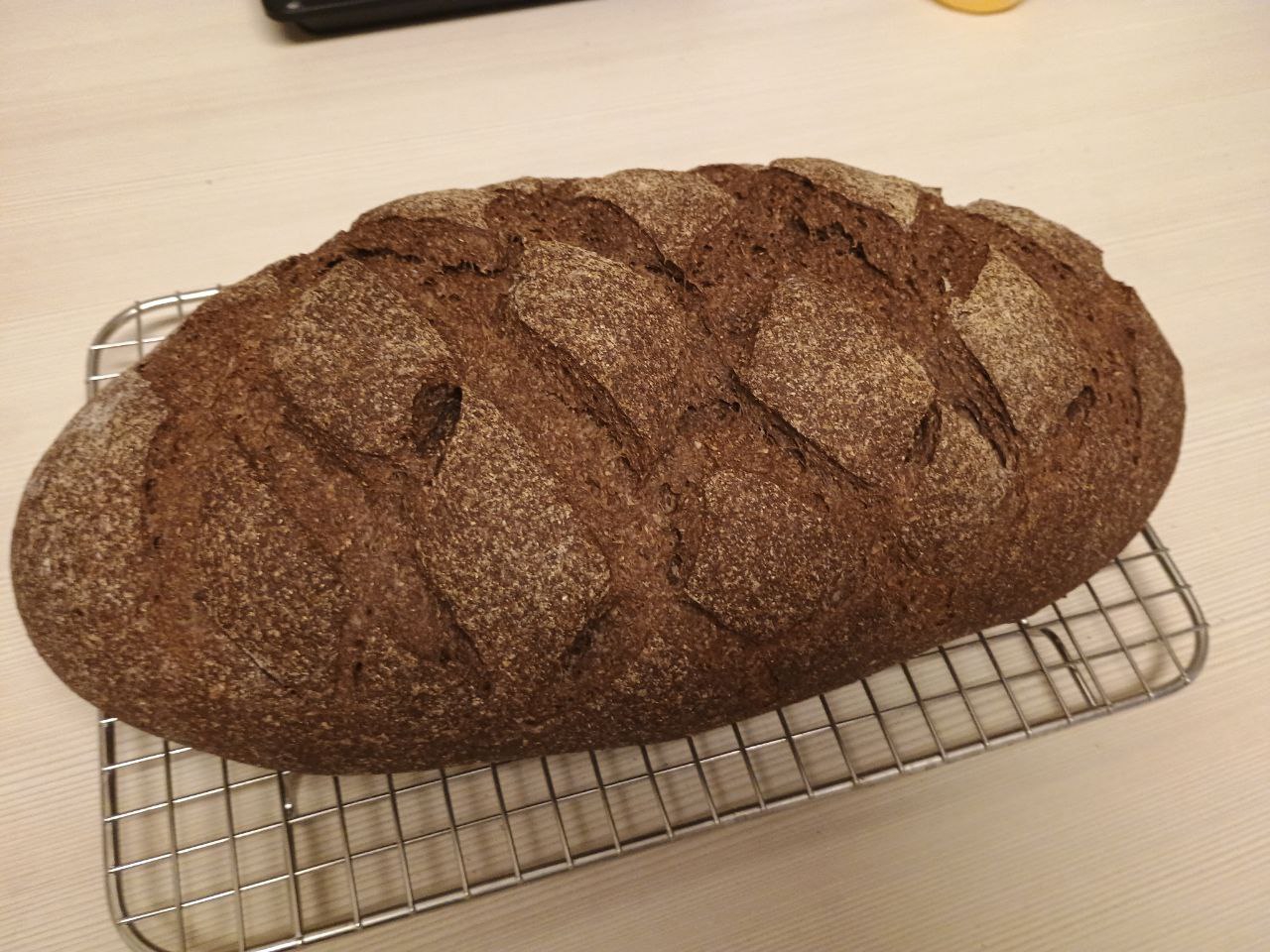 >>750994 У меня примерно так же сегодня вышел по виду, только нарезов побольше навалял. Опять не выдержал, пока не остыл стал наворачивать с маслом, вроде очень годно. Теперь завёрнутый лежит в пакете, доходит. Будет мягче корка.