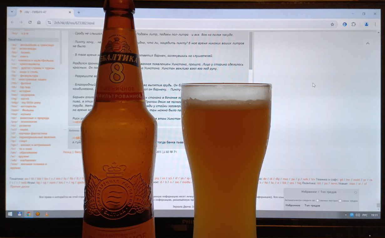 >>674422 Вот такое в Севастополе. Реально сугубо наше местечковое, продается на разлив только в принадлежащих пивоварне точках, которые одновременно и разливайки, и бары. Как по мне, в нем слишком много солодовости и недостаточно хмеля, то есть называют себя крафтом, а на деле варят нечто сравнительно усредненное, чтобы быдло не возмущалось, что, дескать, слишком горько или сухо. Но я люблю, особенно осенью, иногда поехать за город и несколько часов попить их пшеничку или рядовой лагер, слушая в наушниках музыку и наблюдая из окна на проезжающим мимо транспортом. Все-таки посидеть в баре — другой экспириенс (даже если ты один), чем квасить дома под говносериальчик. В среднем цена пол-литрового бокала около 100 рублей.