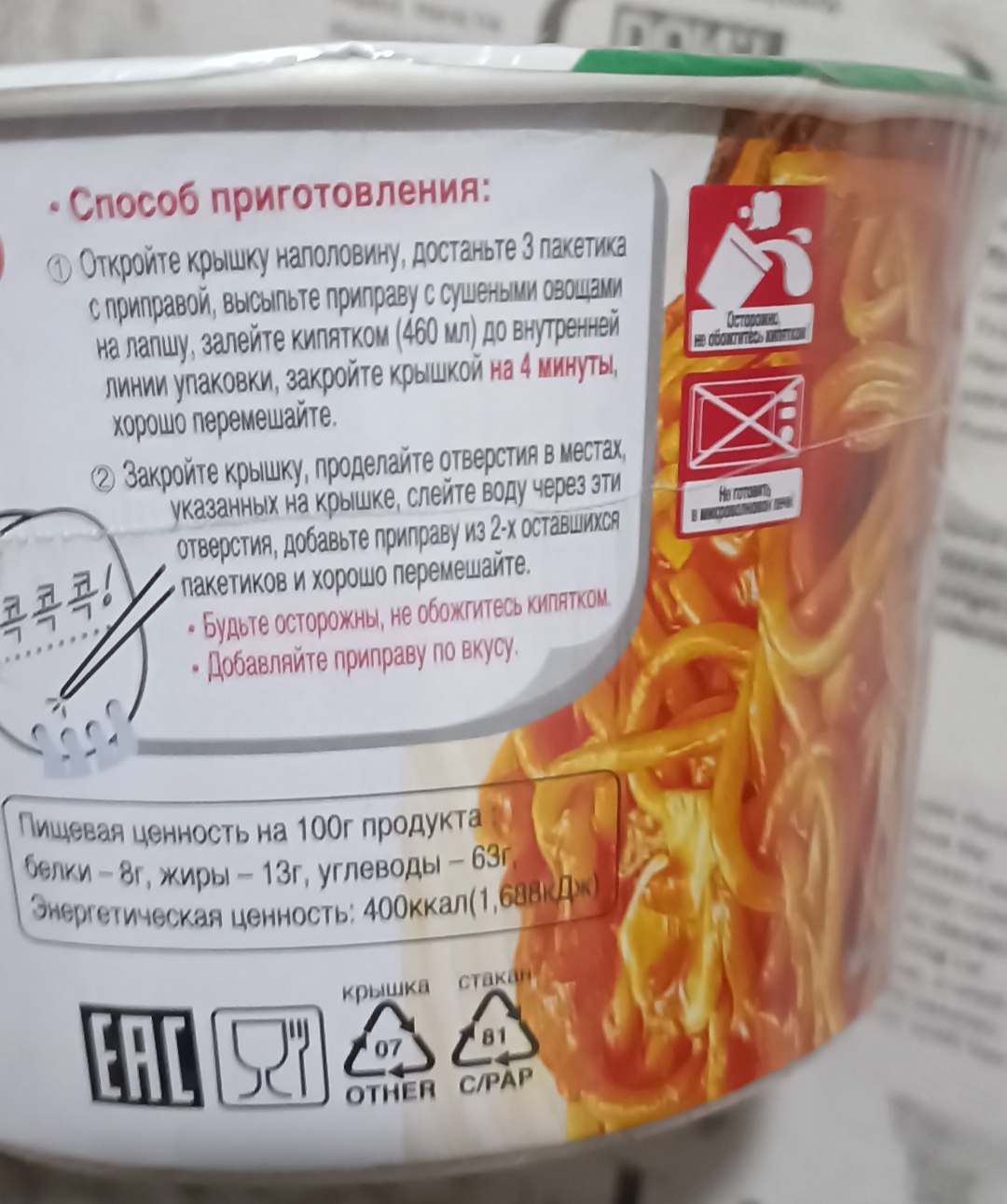 Упаковка приятная, всё очень грамотно и красиво переведено на русский, но понятно, что продукт недорогой. Стоит 90 рублей в универсаме на углу, вычесть доставку, налоги и прочее, и для лапши в стакане или миске останется всего ничего. Но стакан качественный, сложно собранный, плотный.