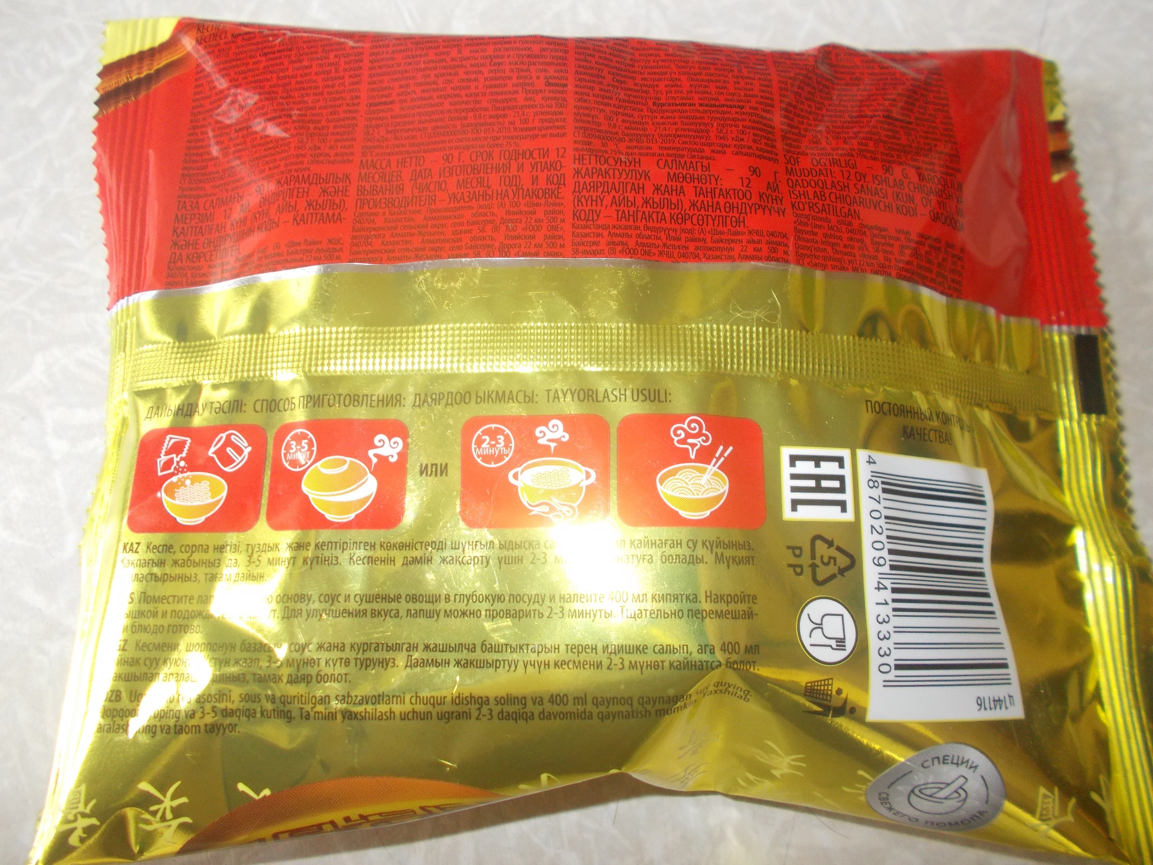 Пачка стандартная, но сзади всё переведено на английский, русский и киргизский. Оставили и бабулю, которая где-то там чем-то знаменита. Вот как хорошо вы будете выглядеть в 25, если будете питаться нашей лапшой! Почти как корейские айдолки!