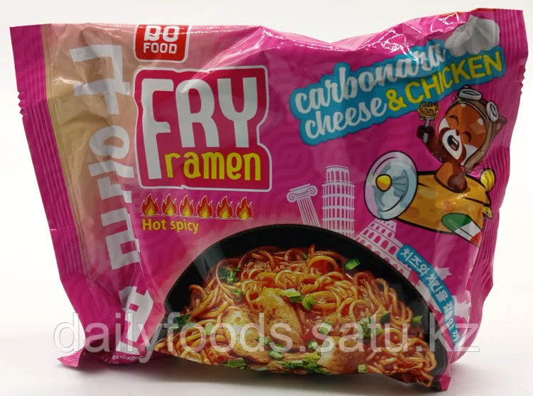Стоит заметно дороже, потому что в комплекте более-менее целые кусочки овощей и жевательные кругляшочки с рисунком (сами найдёте в интернете, как они правильно называются). Понятно, что только это того не стоит. Зато в комплекте маслянистая паста с довольно натуральными свойствами. Лапша не слишком толстая, и варится всего две минуты, видимо, взяли ту, на которую соус лучше налипает. Воды после слива всё равно лучше оставлять самое минимальное количество, не занимаясь никаким подсчётом ложек.
