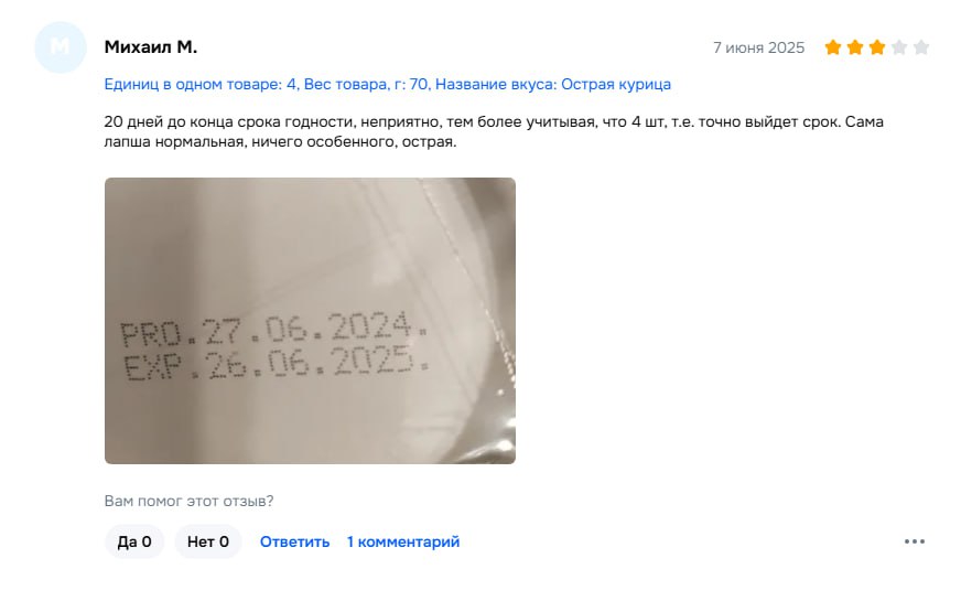 >>735611 Неа, локальная уфимская мелкосеть Лукошко. Там как обычные продукты, так и выбрасывают время от времени околопросрок со складов по оч вкусным ценам, особенно много азиатских, иранских и армянских товаров. Конкретно этому осталось почти два месяца до просрока, набрал себе запас. Тащемта, на озоне буквально такой же хуйней занимаются барыги, только они за него просят по 200 рэ/штука, пикрил из отзывов на такой же бульдак.