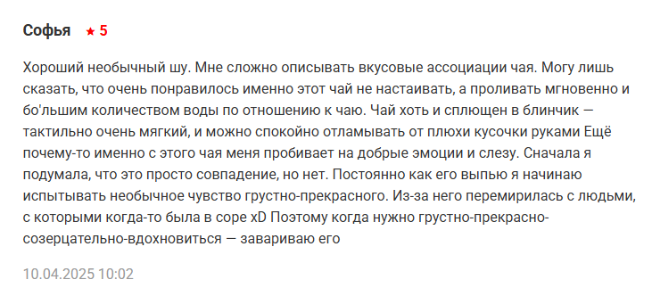 Может кто посоветует на вб (именно на нем) 100гр яркий шенчик рублей за 500-700, похожий на точи сягуань 13-14 года? С дымком, а лучше еще с винными/грибными оттенками, мне как раз сягуань 2013 винный пару раз попадался. Пик2 брал. Похож, но походу рядом с благовониями хранился, в целом ниче особенного