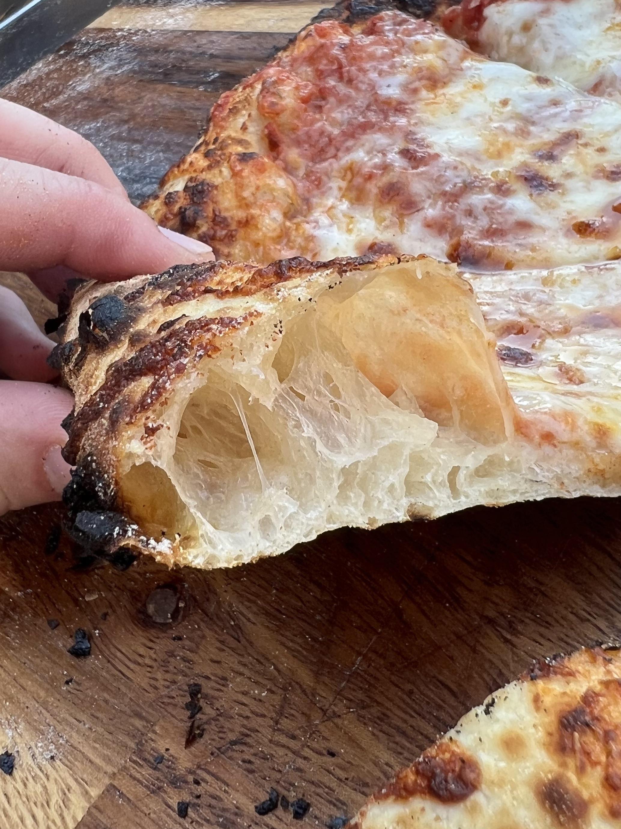 72 не выдержал, 60 часов расстойки Выпекал 300с 3,5 минуты Возможно надо 4 минуты держать Тесто вкусное, эластичное, тонкое Но чуть-чуть не хватает хрусткой корочки