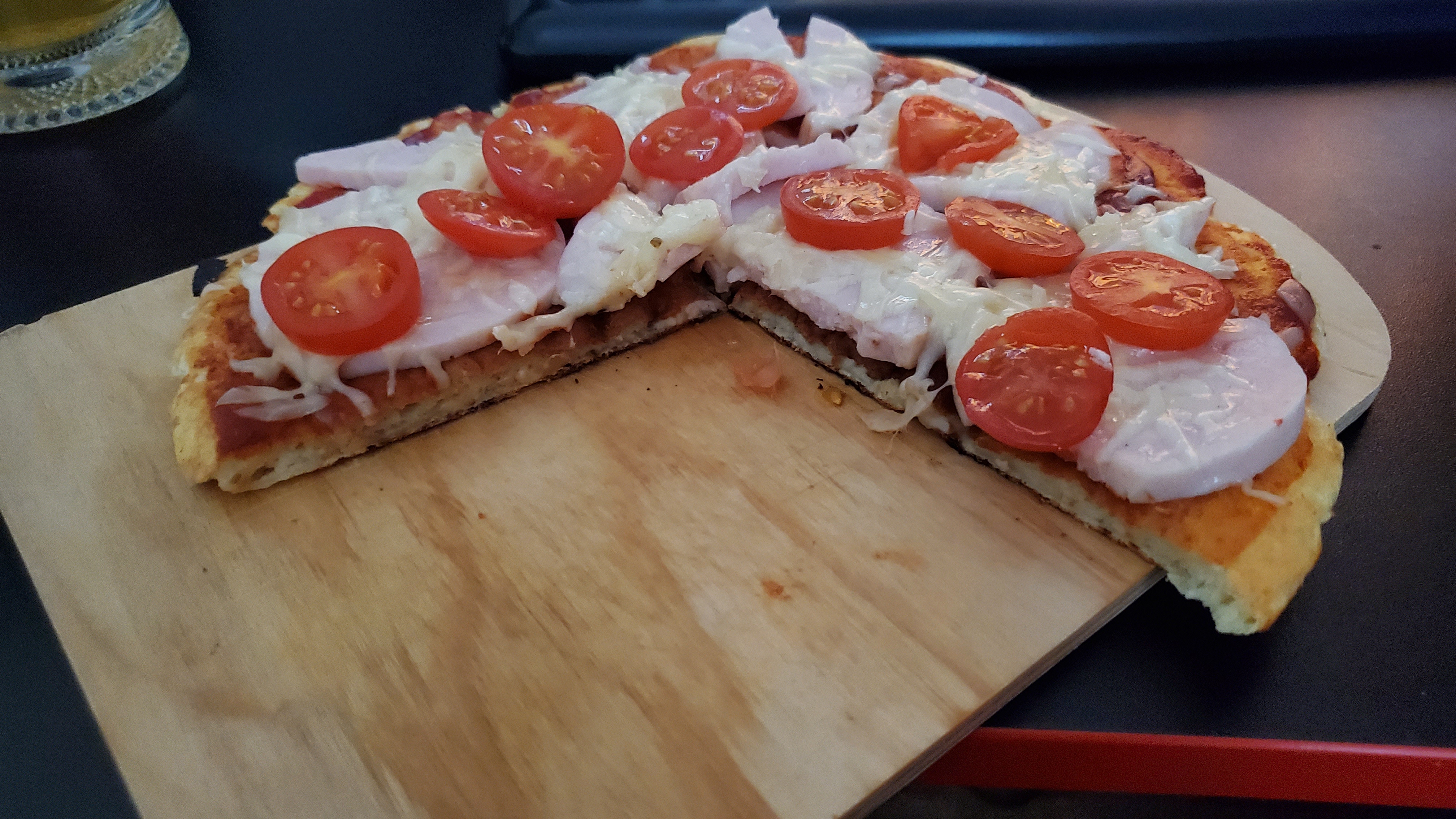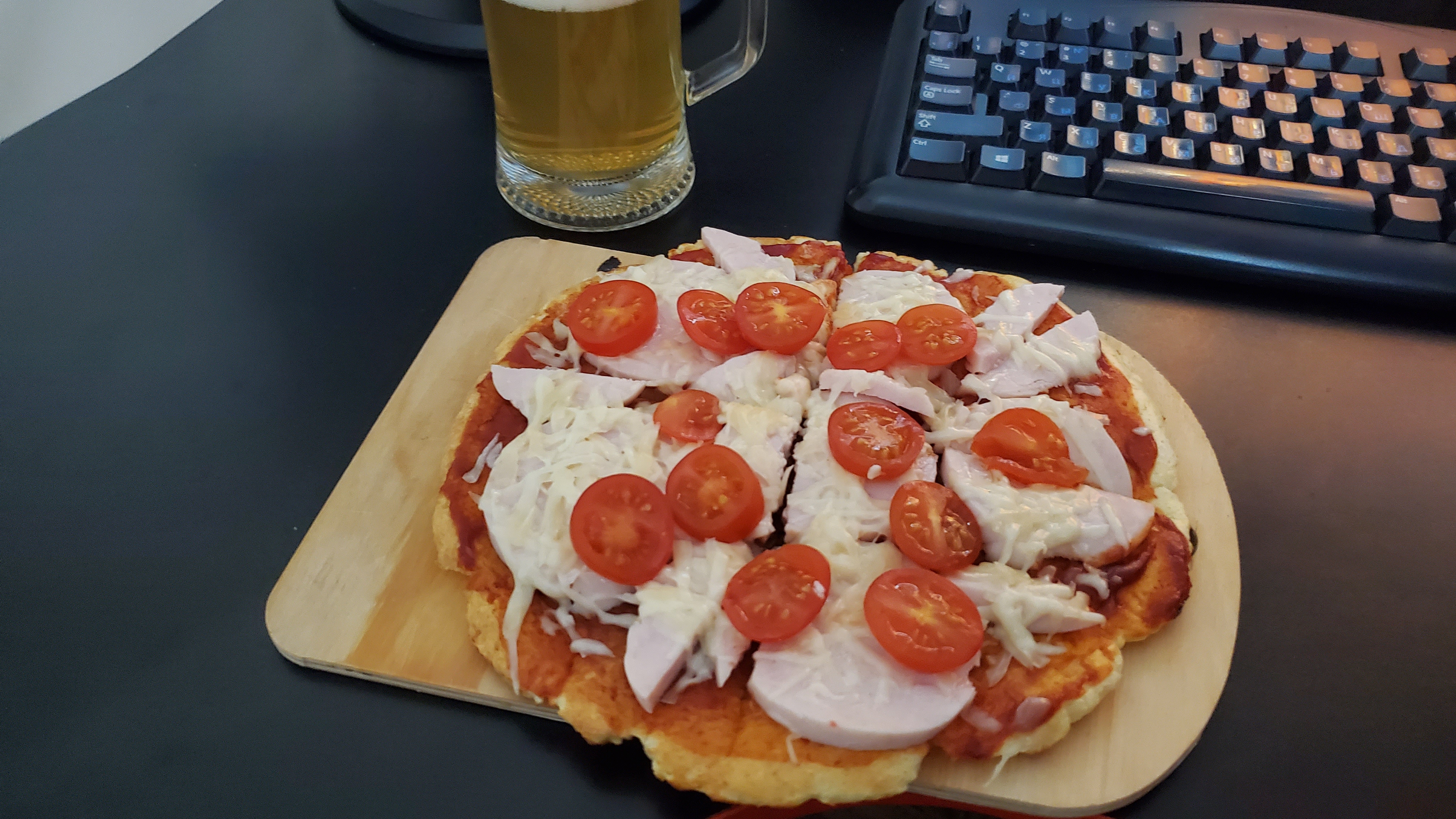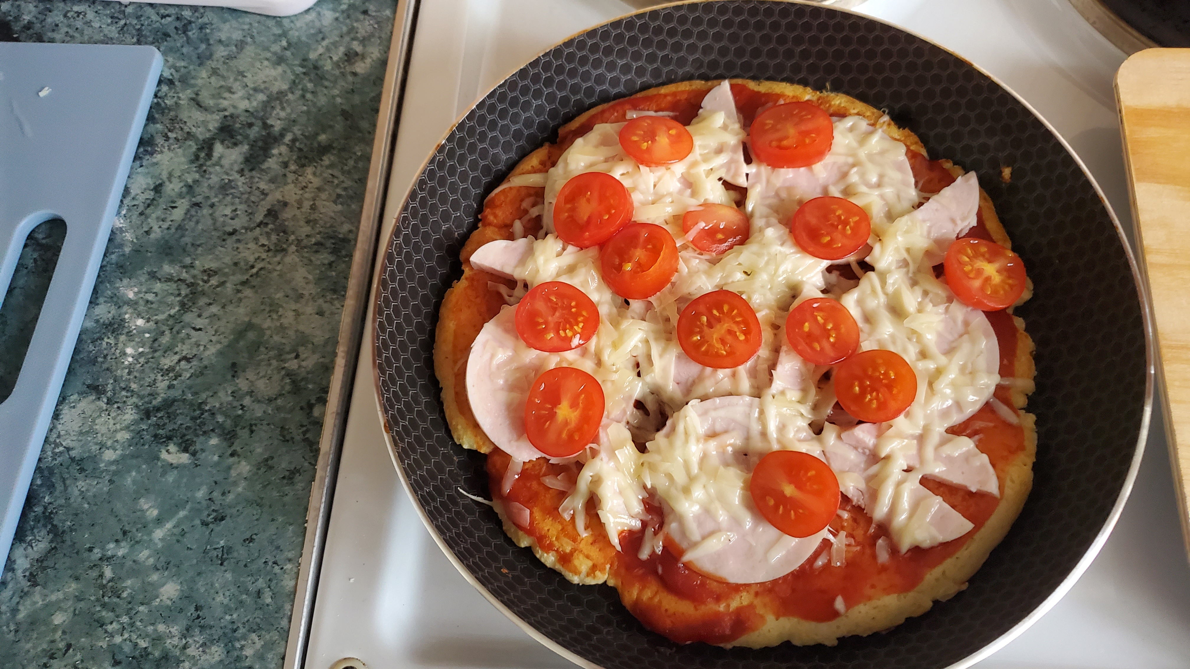 Сап, пиццач. Сделал пиццу на тесте из творога как в интернетах - ахуенно получилось. Быстро, вкусно, полезно. Получилось примерно 55-60 граммов белка на пиццу. Выпекал на сковородке.