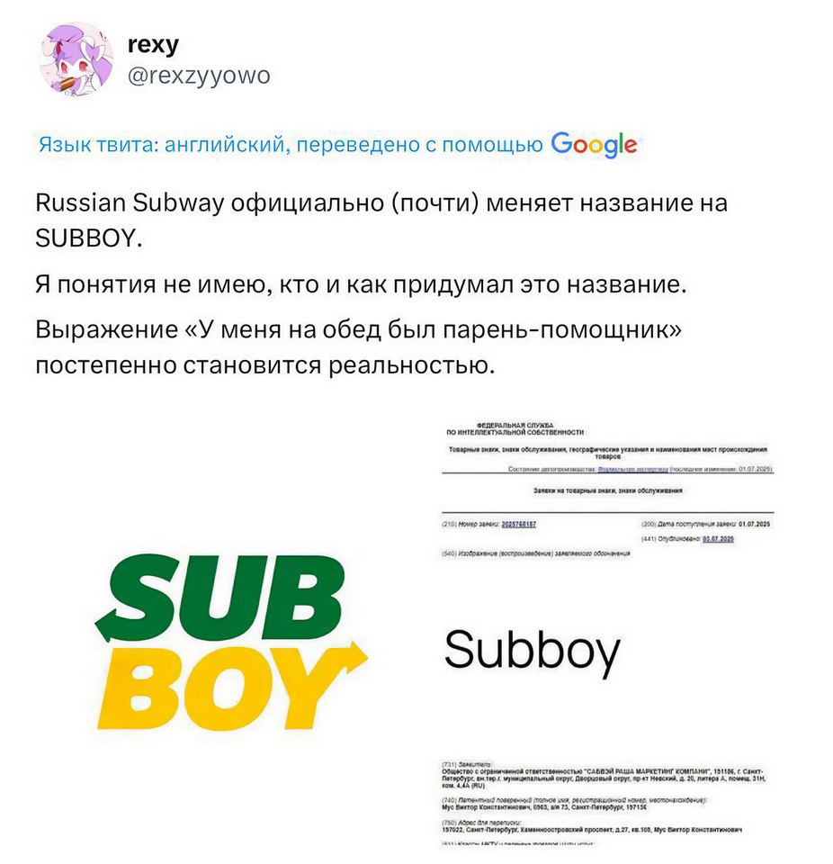 >>733401 Скоро вместо привычного Subway в России может появиться Subboy. Правообладатель бренда фастфуд-сети на территории РФ готовится к ребрендингу: юрлицо, представляющее интересы компании, подало заявку на регистрацию нового товарного знака Subboy.