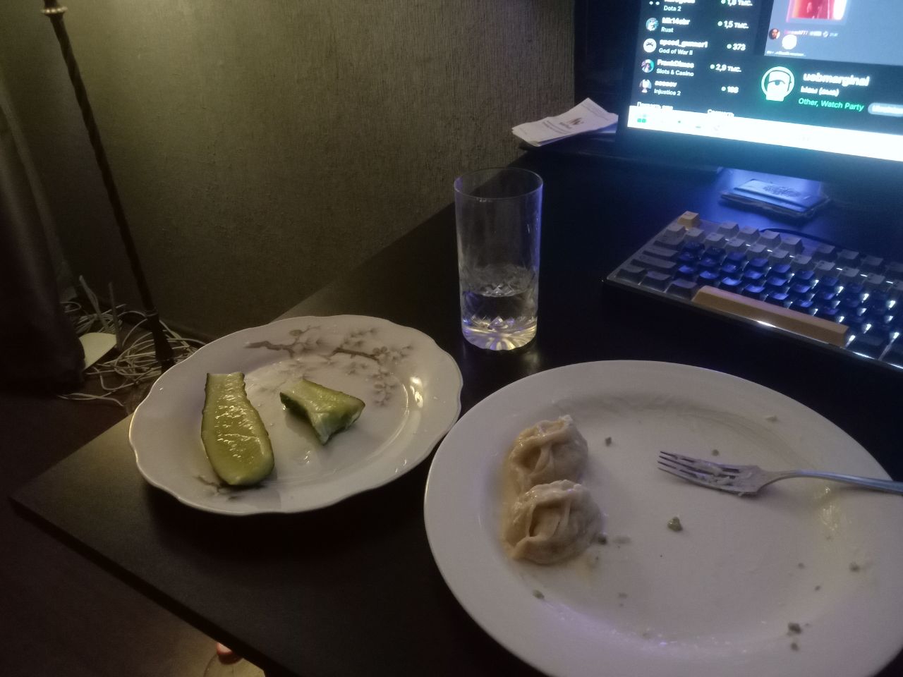 Насмотрелся я на эти ваши >>731124 индюшачьи ноги и взял пару голеней. Потушил в МСК 20 минут на бульоне от предыдущей курицы, который уже месяц лежал в морозилке, затем подснял шкуру сделал надрезы и упихал туда немного аджики, натянул как смог кожу обратно, но херово размазал аджику по поверхности. Духовка на 25-200 подсушила это всё, однако молодой необкатанный картофель вышел то полусырым-полузасушенным, можно смело отдать его голодающим В качестве отвлекающего манёвра тушеные овощи с кинцой и зеленым луком, тут всё отлично я постоянно готовлю такое к рису. Понимаю что это всё в сочетании с недопитой в прошлые выходные прокаченной до 0.375 чекухой водки сведёт меня в могилу лет на 5 раньше, но ничего не смог с собой поделать