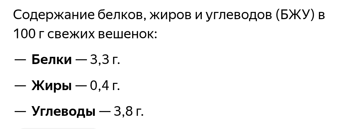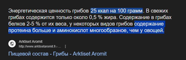 >>738204 Ну присутствуют но они плохо насыщают, их скорее для вкуса жрут >>738218 Так ты посмотри сколько там белка, около 5 грамм на 100гр грибов, то есть хуйня)