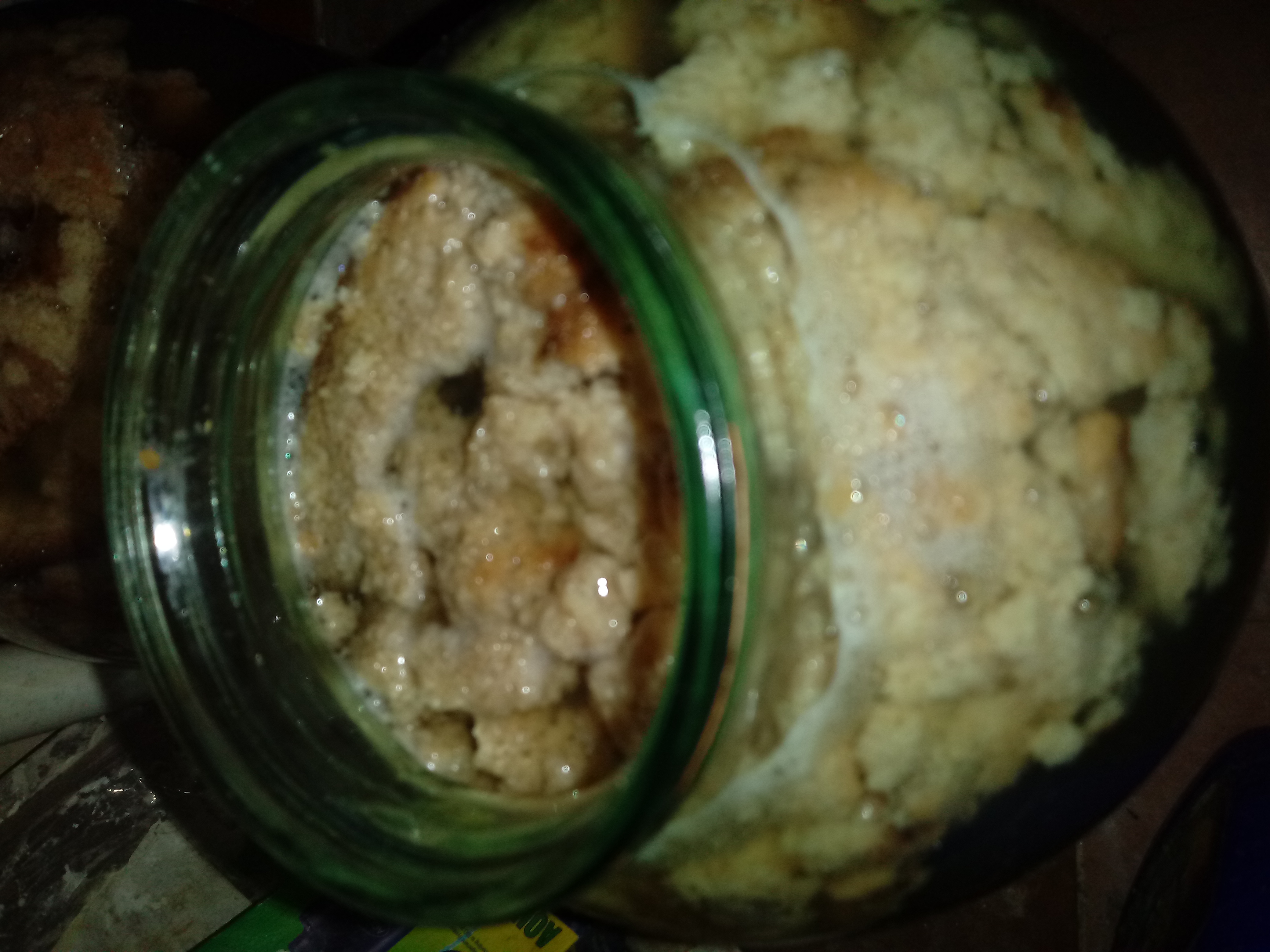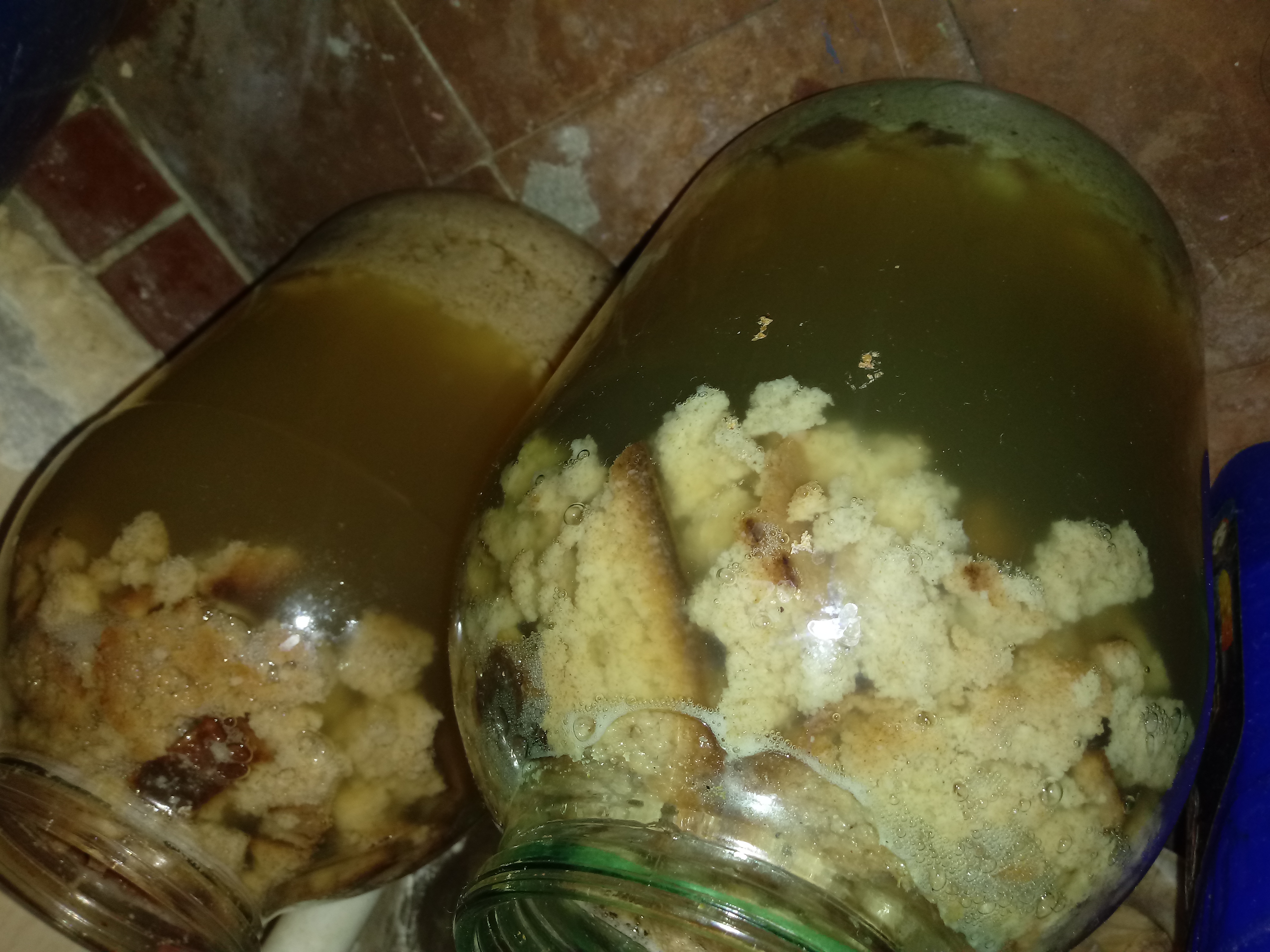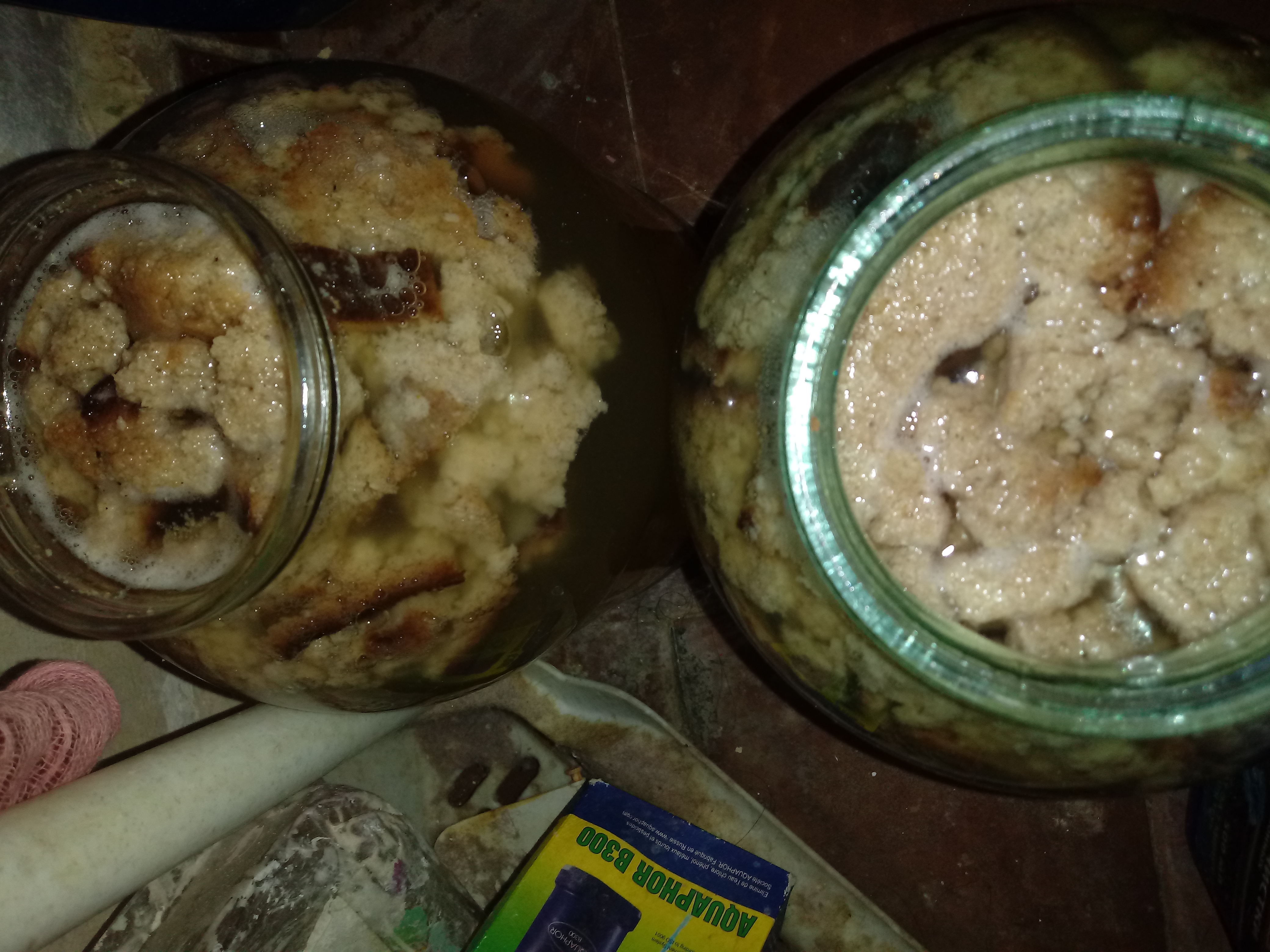 Но делать сука неделю . Терпел долго. Но зато щас получу супер окрошку. Первый тест выдал немного запах алкоголя, но второй раз на моей закваске (она на фото в банке) будет без него.. Пью с удовольствием. По бабкам вышло: хлеб 450 г ржаной с Семишагофа стоил 29 рублей. и сахар. ну изюм пришлось купить еще белый, 65 р большой пакет там же. ВСЁ. Дрожи еще 10р сухие.