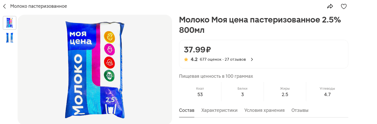 Творог с массовой долей жира 9 % под торговой маркой «Красная цена» произведен ООО «Производственная компания «Обнинские молочные продукты» в России. Образец был приобретен в ООО «Агроаспект» по адресу: г. Москва, ул. Маршала Бирюзова, д. 20, к. 1; ООО «Агроторг», магазин «Пятерочка», по адресу: г. Москва, пр-т Мира, д. 75. По результатам лабораторных испытаний данный товар признан потенциально небезопасным, поскольку в нем выявлены нарушения обязательных требований законодательства. В данном товаре был выявлен следующий недостаток: в составе творога была обнаружена клетчатка, не указанная на упаковке. Однако внесение ее в состав не является нарушением. В твороге не было обнаружено в количествах, опасных для здоровья, нитритов, тяжелых металлов и радионуклидов (в том числе стронция и цезия), однако обнаружен антибиотик тетрациклиновой группы (тетрациклин) в количестве, не превышающем допустимое. Творог не содержит патогенных микроорганизмов, а также бактерий группы кишечной палочки и золотистого стафилококка и дрожжей. Однако количество плесеней в составе превышает допустимые нормы. Употребление такого творога может негативно влиять на здоровье