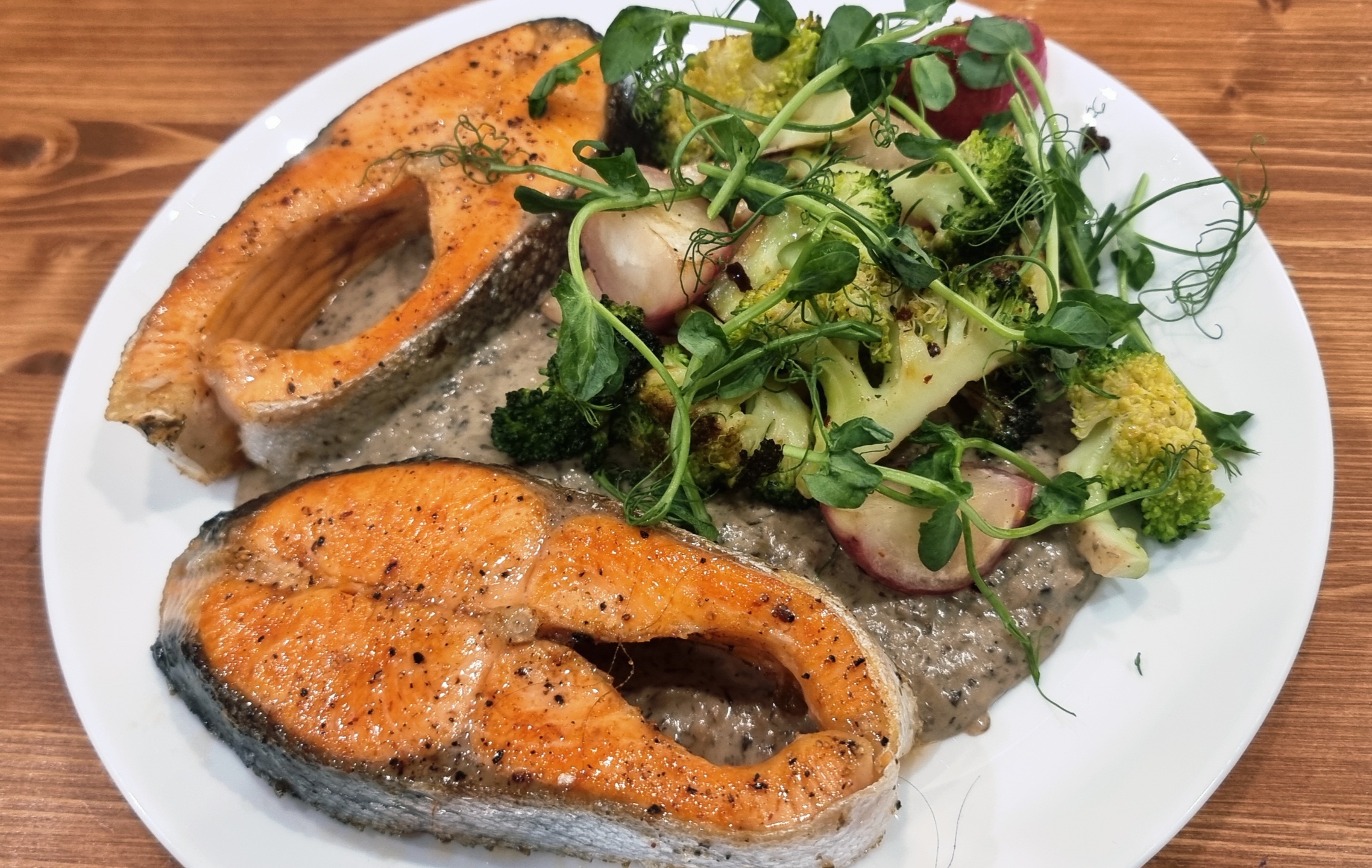 Ужин: перемороженная ртутная форель из вкусвилл, перемороженные свежие редиска и брокколи в перемороженном грибом соусе. Ах, там ещё микрозелени гороха. Все из вкусвилл. Хорошего вечера.