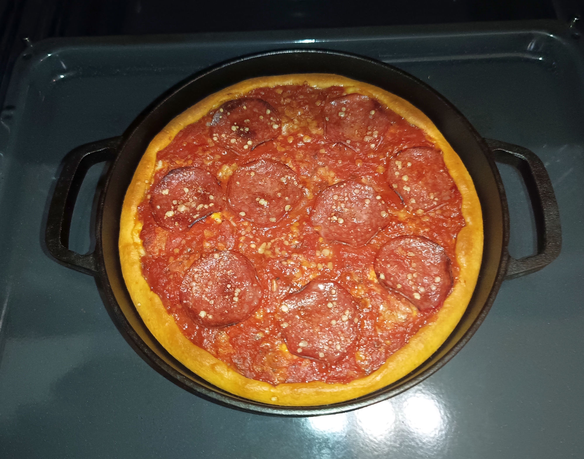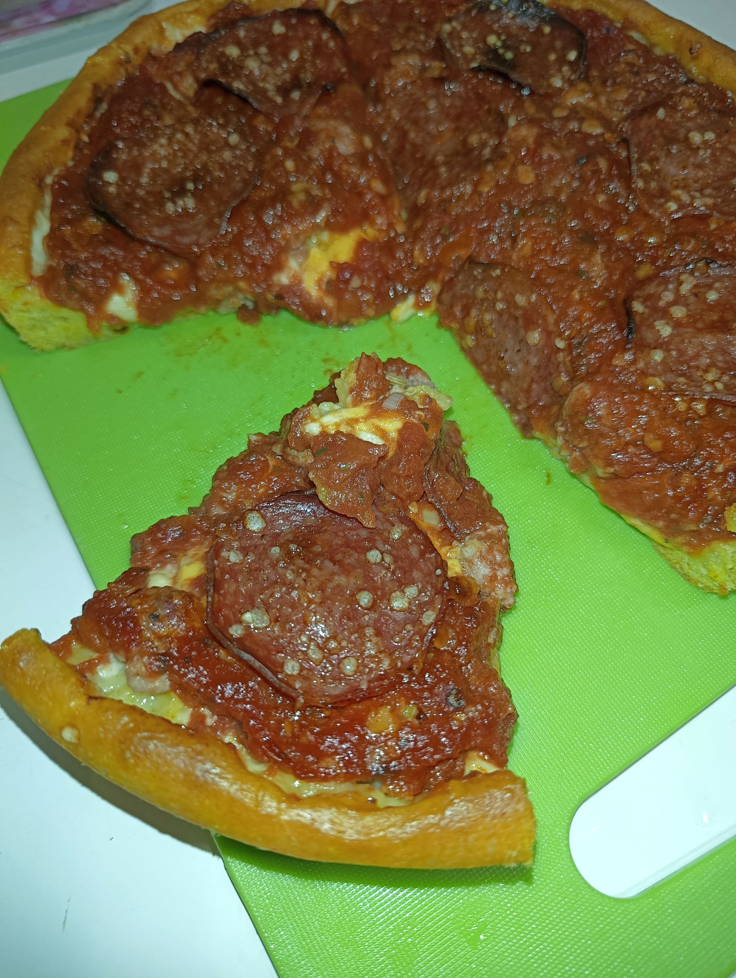 Трапеза чикагского горожанина. В дохлый пиццатред не хочу, там мамкины пицаёлы на свои пузыри дрочут и вообще, Chicago-style Deep Dish ето не пицца. Надо в следующий раз не жмотить сыр, жахнуть 2х200г.