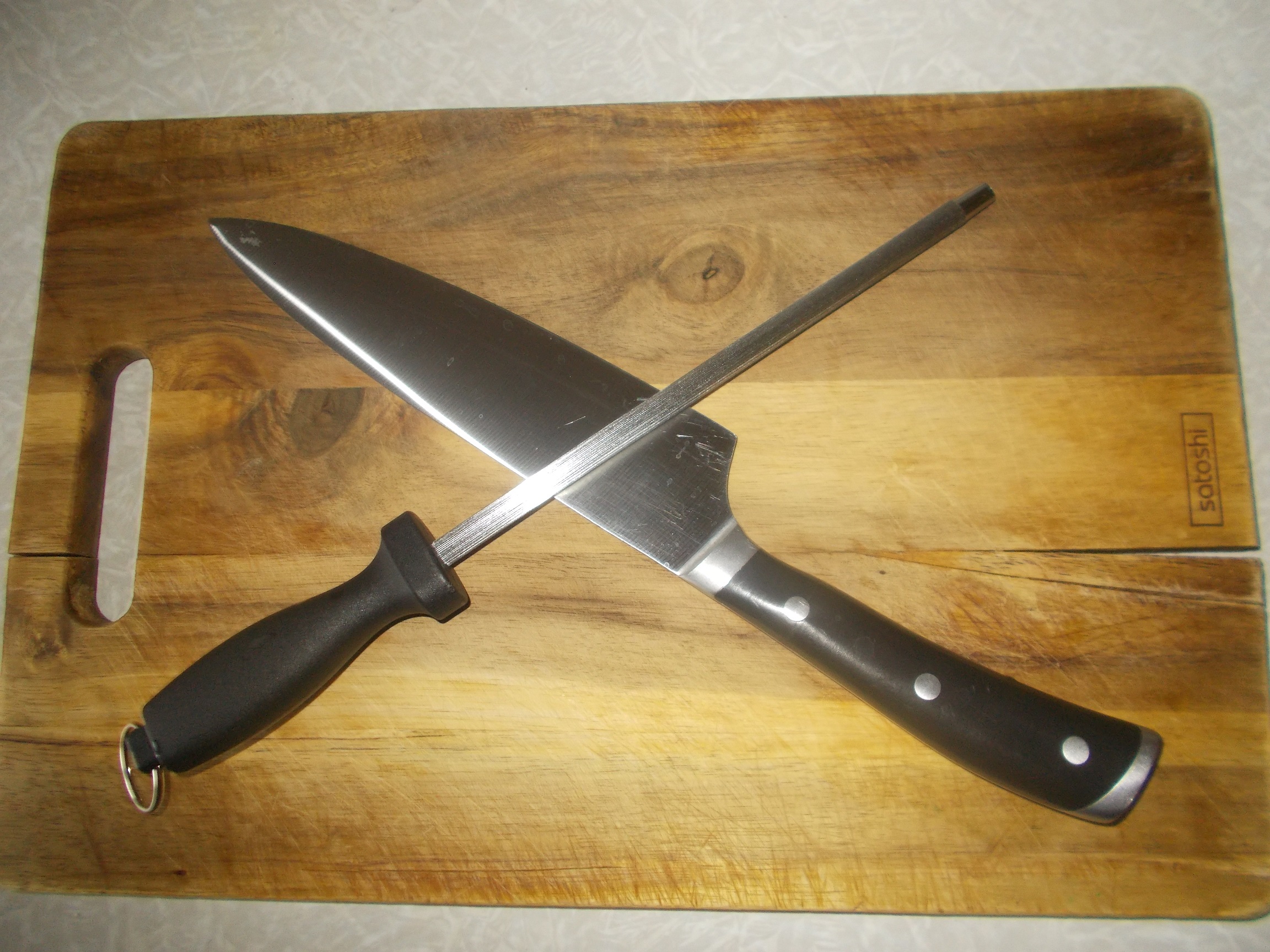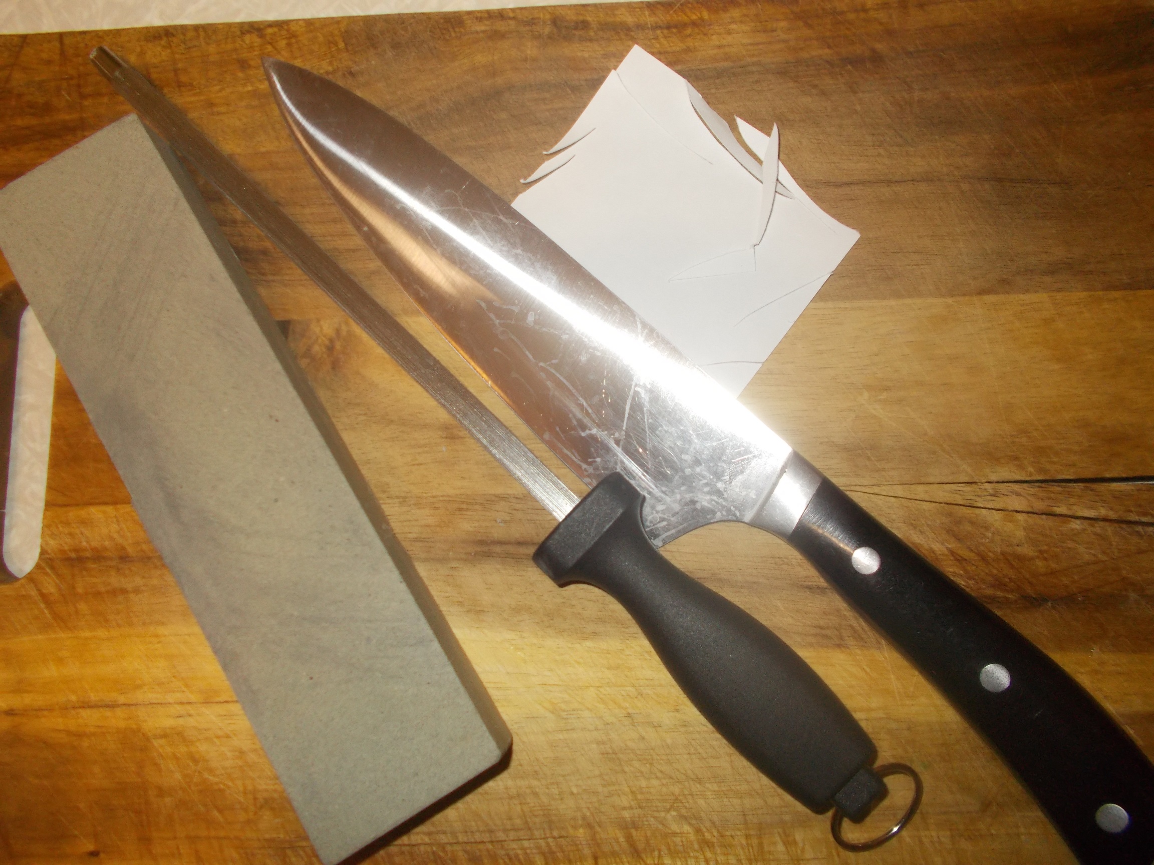 Научился я ножи точить на водяном камне, наконец, ничего сложного. Оказывается, камень мочить надо в ведре, пока пузыри не перестанут из него выходить. И угол с непривычки трудно держать (у японцев, оказывается 15o уго заточки, а европейский угол 30o). И пальцы главное с мусатом не отрезать - но это легко, если только запястьем двигать, то никак не получится. Заточил по европейски, можно было и острей, но бумагу режет и ладно.