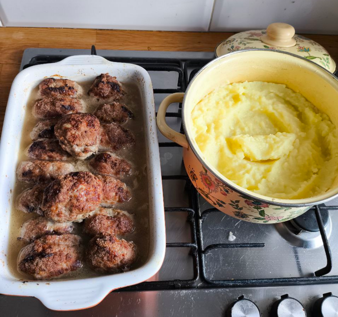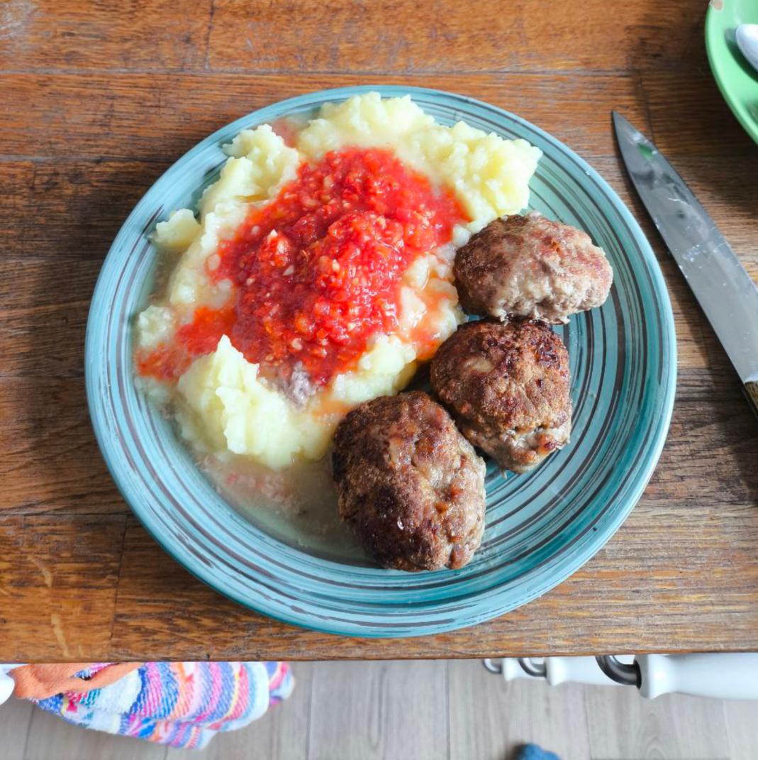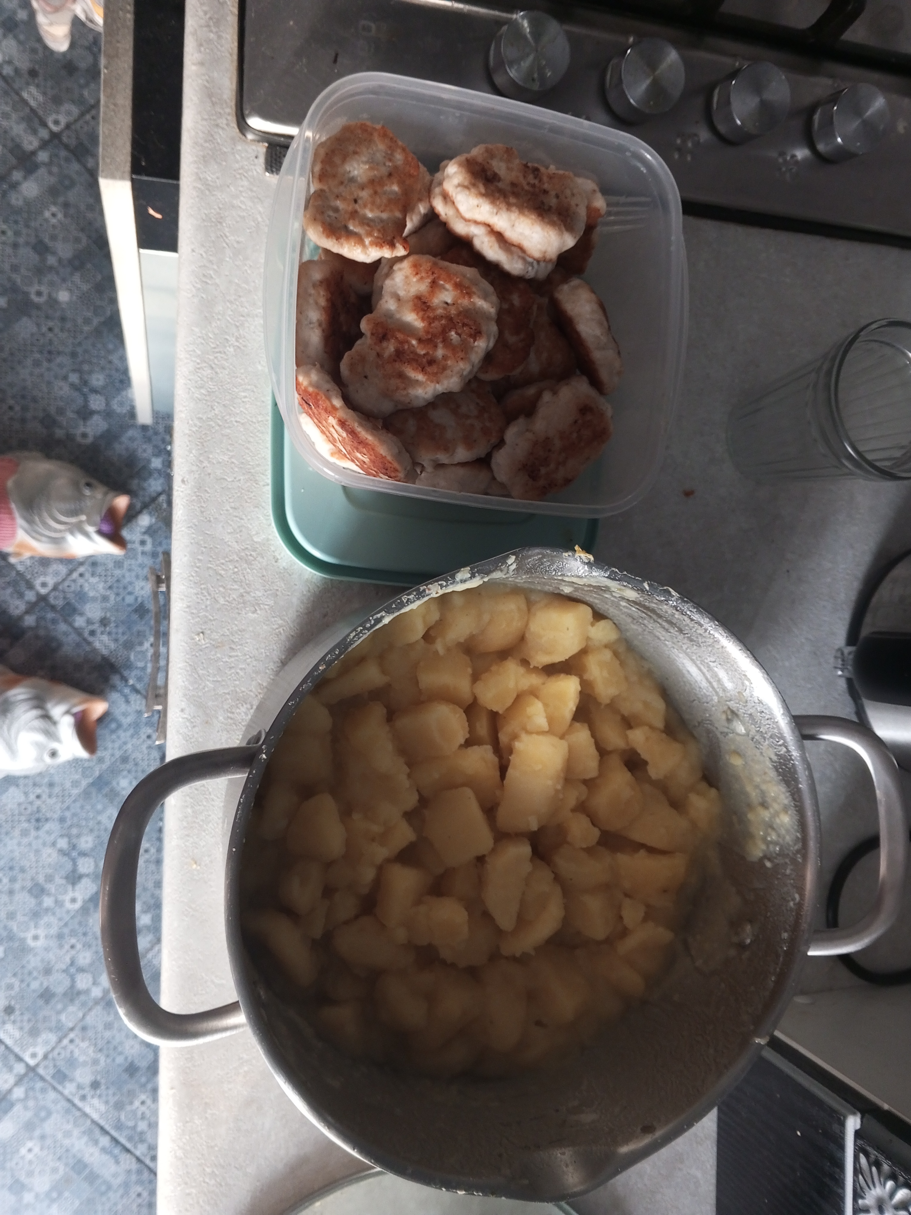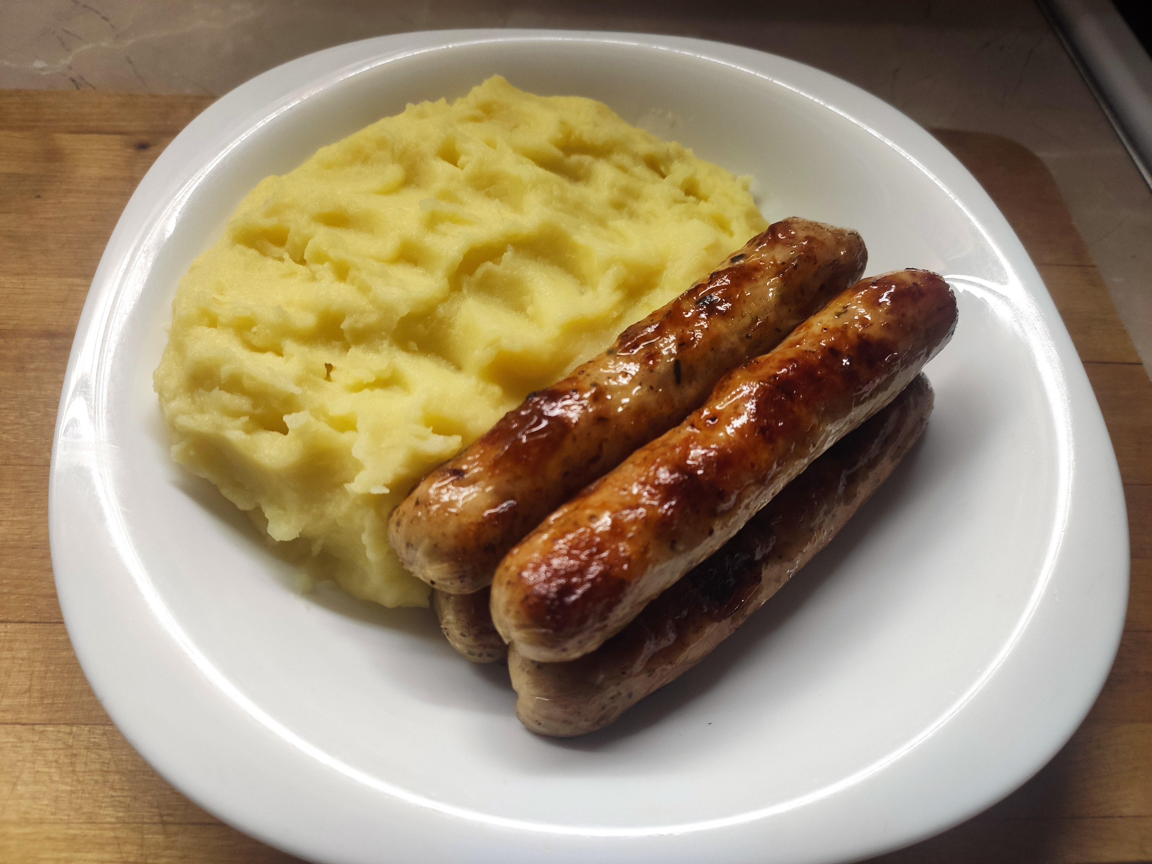 Классическая пюрешка (картошка, лавровый лист, соль, молоко, сливочное масло) и куриные вкусвиловские колбаски для жарки. Алсо, второй пик, что я пюрирую картошку вручную. Все же знают - если пюрировать картошку блендером, - получится неплохой клейстер для наклейки обоев - тихая кулинарная радость тараканов гурманов.