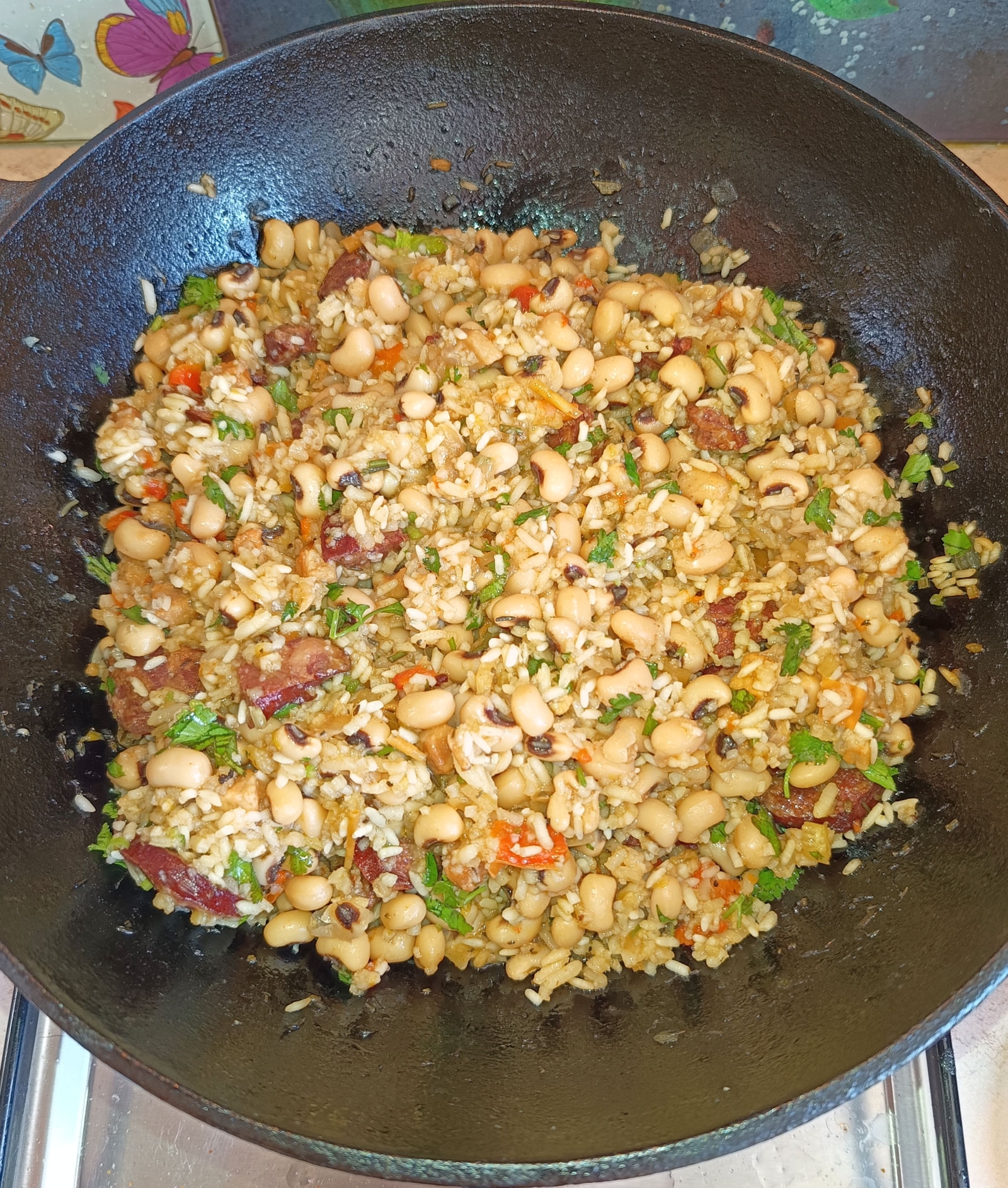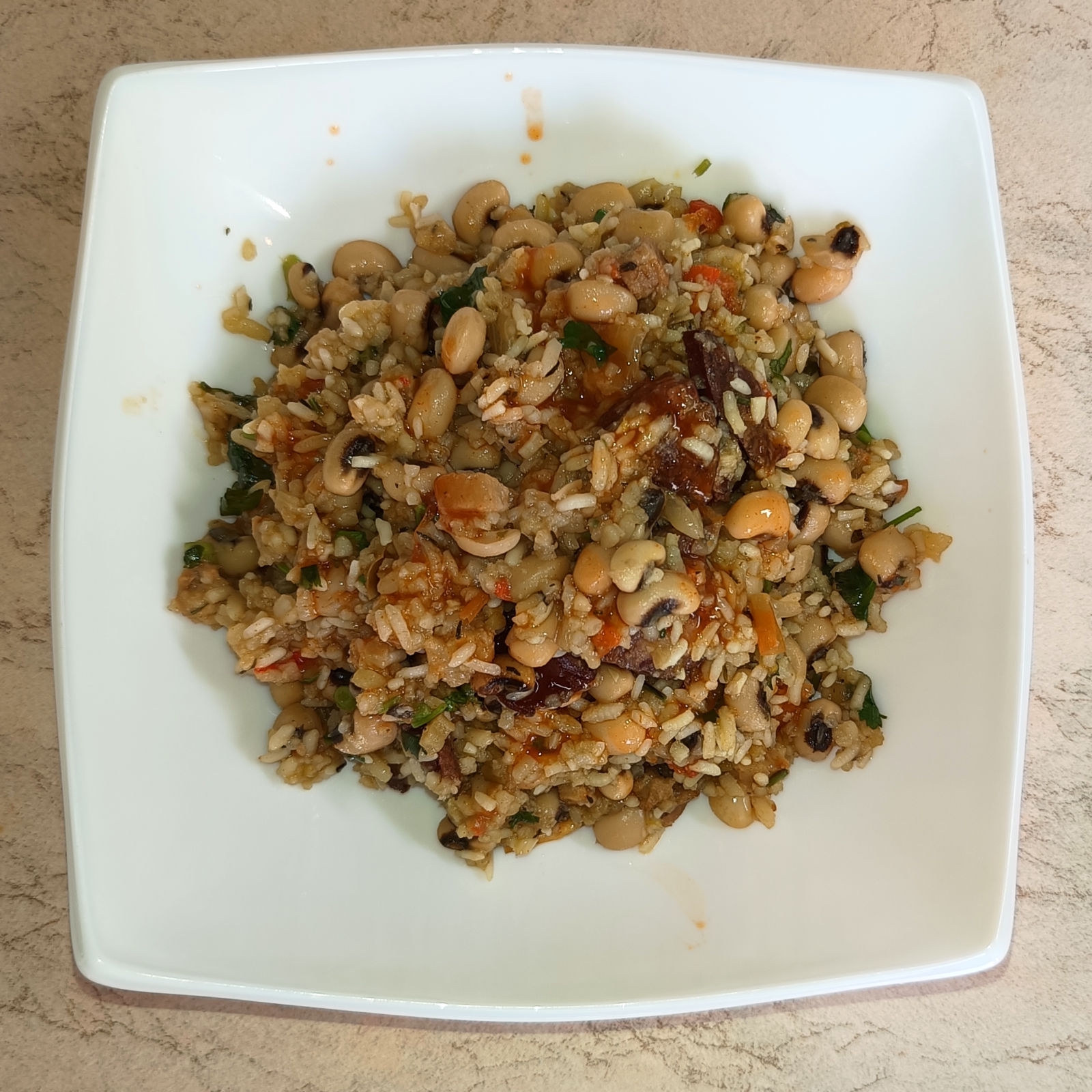 А я приготовил скучно, медленно, но нажористо, всё как обычно. Увидал черноглазые бобы в магазе, захотелося попробовать. Скачущий Тара Джон - традиционное хрючево кухни южных штатов США, приготовляемое из бобов, риса, бекона или другой свинины (у меня солёная грудинка и краковская колбаска).