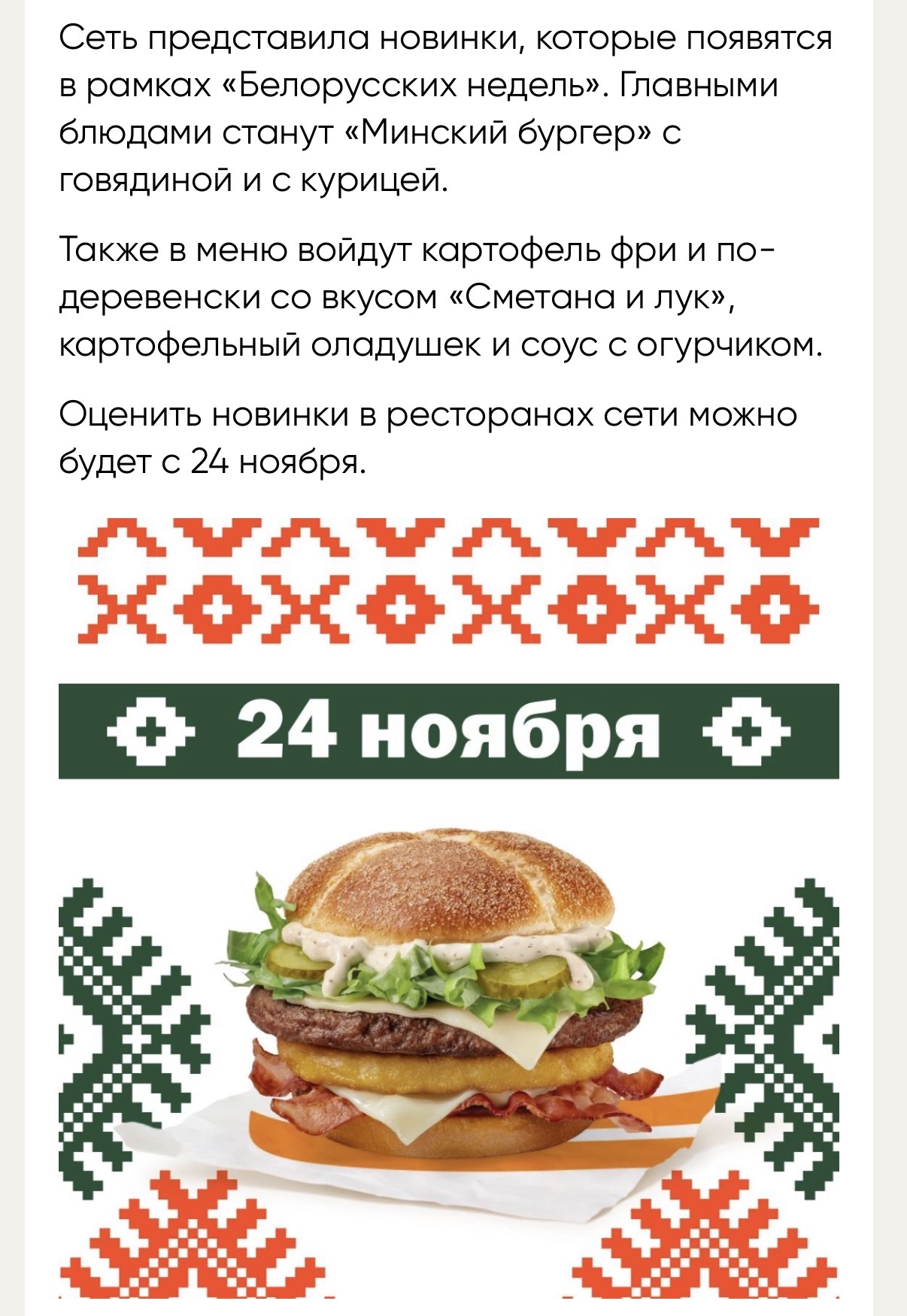 Бля, ну вот почему белорусское меню. У них там из еды никогда ничего интересного не было. Драники да колдуны блять. Бургер со сметаной, пиздец как ново и оригинально. Почему бы не сделать тайское меню или французское.