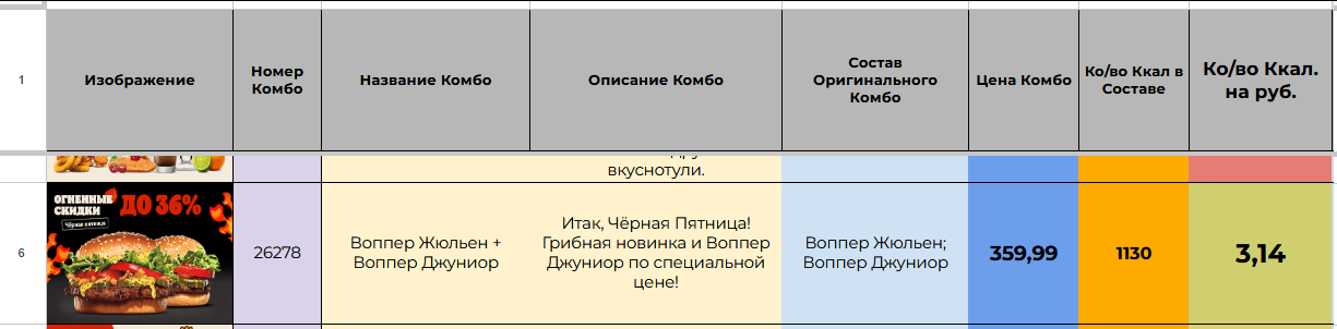 >>751342 Ну то есть 570+412+140 ккал на 723 рубля, это коэффициент 1,55 ккал/руб. Это полное говно, буквально в БК можно покушать на 1350 ккал за 350 руб по пукону, то есть с коэфом 3,86