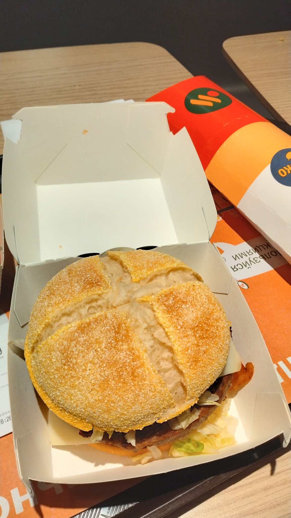 Брал бургер по-мински с курицей, бекон ароматный зажаренный, я охуел от картофельного дранника - я ждал что это будет такое же дерьмо как утренний хашбраун из меню ВиТ, а оказалось это другой по размерам, другой по толщине, более крепкий не разваливается под своим весом на куски как утренний. Прямо крепкая такая картофельная котлета, тот же огуречный соус вроде как и к картошке - все вкусно было, вкус яркий не сухой и не мокрый бургер ничего не течет так как томата нет. Булка приятная на ощупь - шершавая в обсыпке кукурузовой.