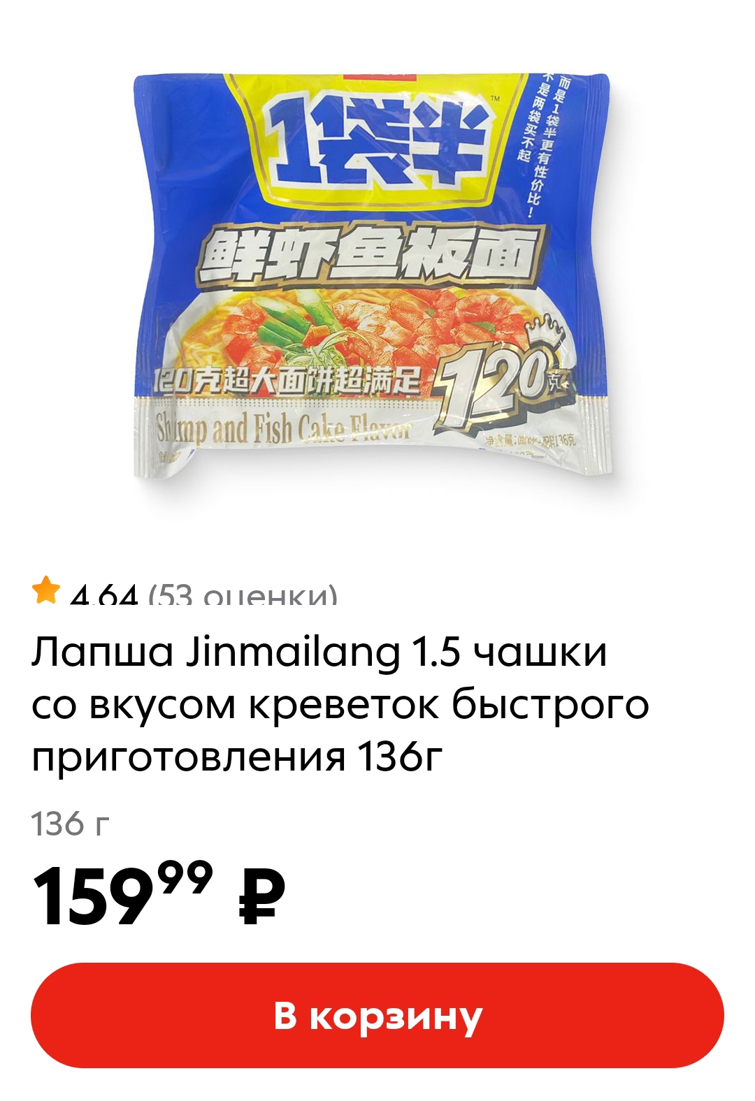 >>757277 >Но это 60 граммов, кто таким наестся? Маловато будет. >(то есть вкусы морепродуктов мы, вероятно, отбрасываем Необязательно. Попробую поискать нонгшимы, ладно. Вроде еще Палдо большую тарелку делает, там по-корейски всё, неясно насчёт мяса, но скорее всего его никогда не бывает и я напрасно вообще акцент сделал на этом. Остаётся вопрос где лучше брать. Мне ещё Мастер Конг понравился, но я у нас не только изобилия не вижу, я в целом его в продаже почти не видел.