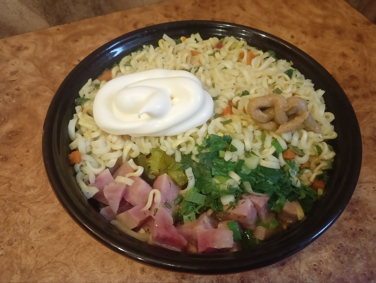 По хрючеву соскучились? Встречайте МАРАМЁН! Марамëн - рамëн по марамойски Ветчину погреть в микроволновке (Заодно прогревается тарелка). Разломать бич-пакет, добавить специи. Залить кипятком на 15-20 минут. ВОДУ НЕ СИЛВАТЬ! Добавить майонез (обязательно). Соусы и допы по вкусу: тут горчица, халапеньо и зелень Перемешать, жрать похрюкивая.