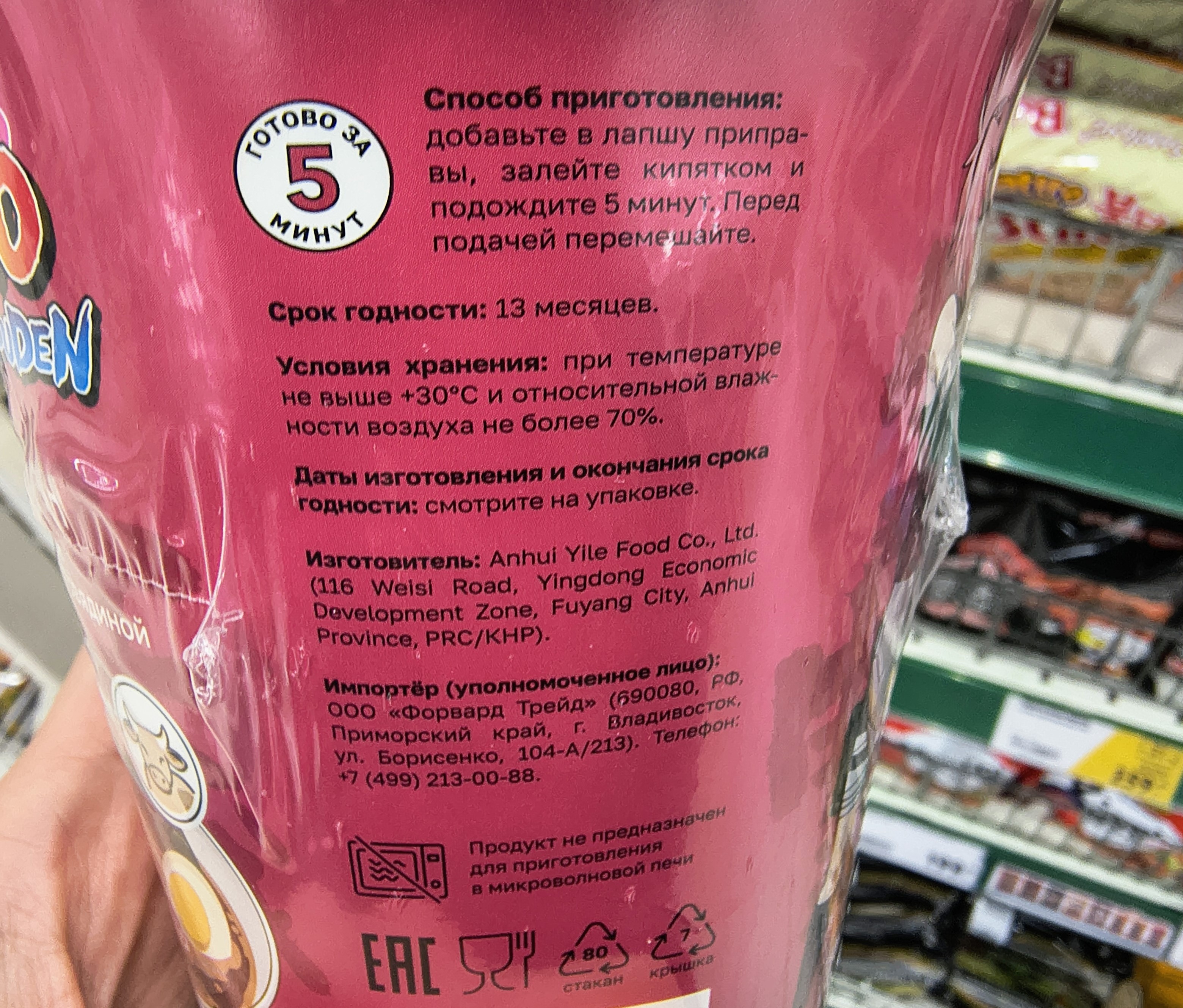 Невероятные приключения тайцев в России продолжаются. Присмотритесь к названию. Да, это стаканчик, на дне которого насыпан порошочек, разводимый 250 миллилитрами воды. А лапши там нет. При этом пустота выше отметки уровня жидкости намекает, что лапша подразумевалась, но как-то не срослось. Некому, видимо, во всей стране сделать её круглой под заказ.