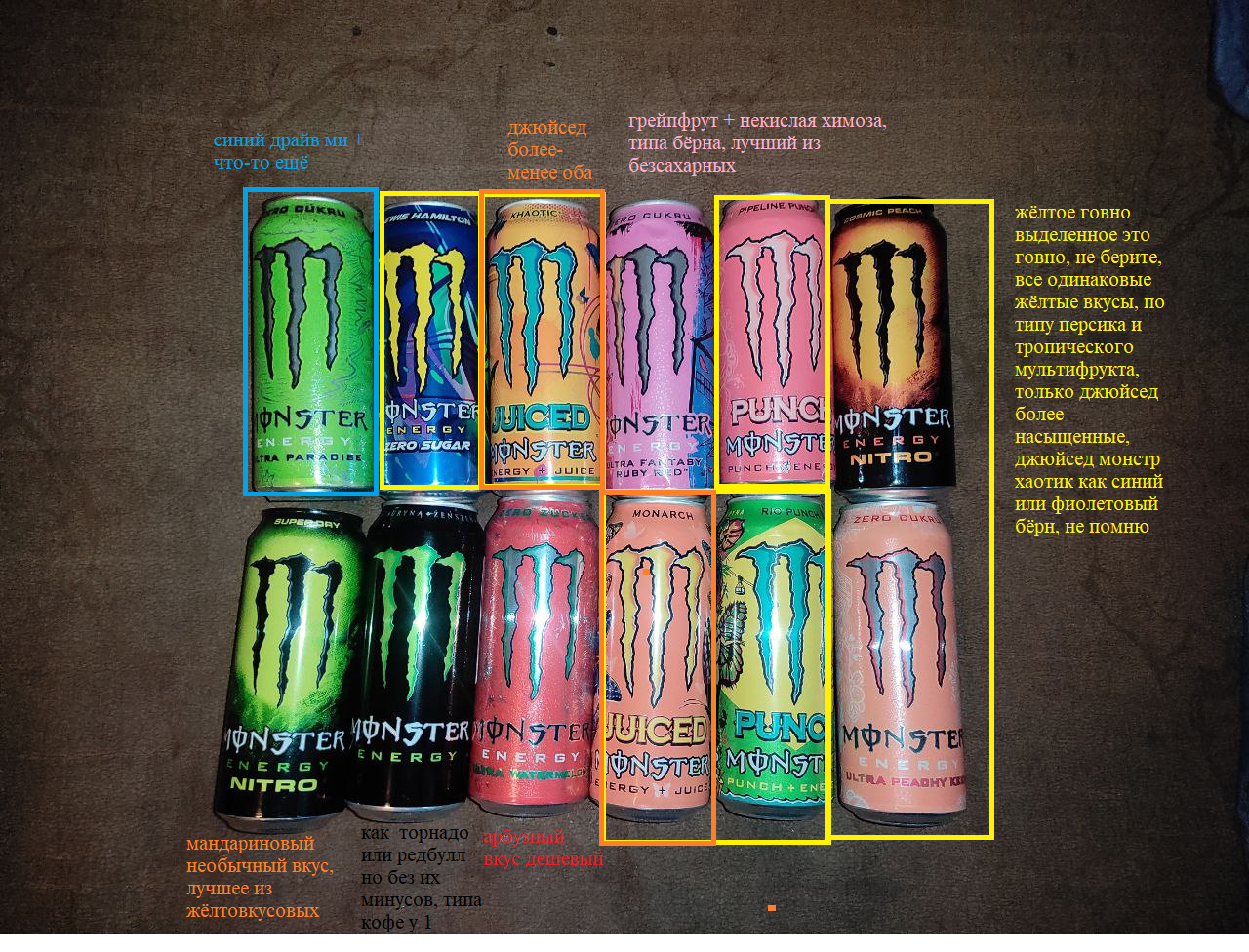 Ревьюзор всех банок из 12 монстров, жёлтое говно не рекомендую брать, лучшие вкусы обычный монстр, розовый без сахара, и всё, мандариновый нитро можно взять чисто для пробы, а джюйсед хайотик тоже норм, но это просто бёрн фиолетовый или синий, не стоит своих денег. Остальные жёлтое мультифруктовое говно тропическое, худший вкус энергосов.