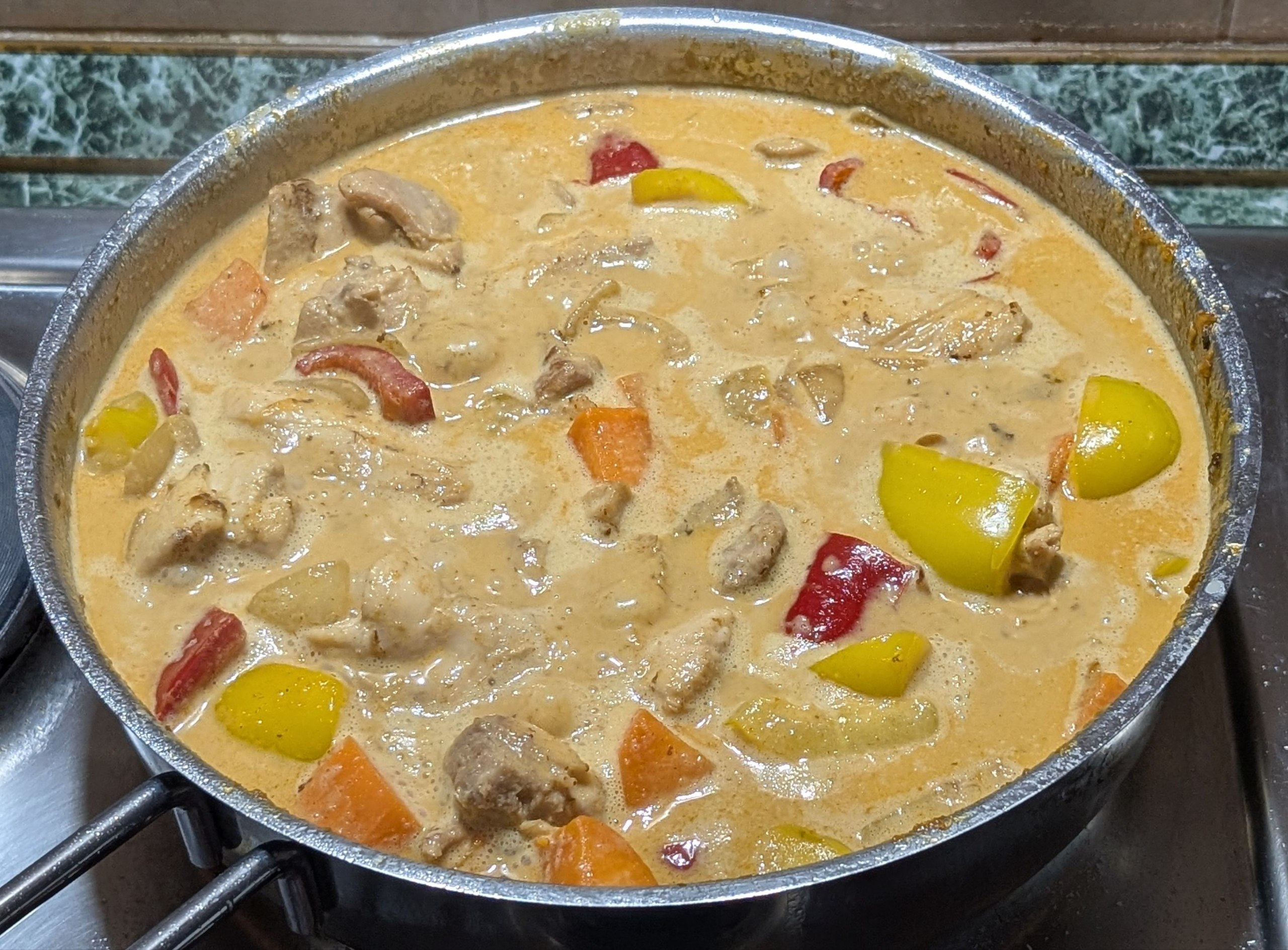 >>756901 >Желтое на втором - это такой длинный не разрезанный кусок перца Это большие КУБИКИ перца >Ну и накладывать в карри морковку и прочее - это вообще рагу какое-то, новояз, а не классические курри Это батат и да, это ближе к японскому варианту карри райсу >Чо так "мало"? Костей же нет, а ты часами... Ну и почему не в кастрюлевиче, видно же, что с боков убегало, а верх сухой, не погружен в соус. Томится не из-за костей, а чтобы мясо можно было есть ГУБАМИ. Кастрюлевич нужен для того, чтобы была меньше площадь выпаривания и жижа не убегала. А моём случае это не нужно - жидкость уварилась на 3/4, в оставшейся подливе я тушил обжаренные овощи и нут, потом всё смешал с мясом.
