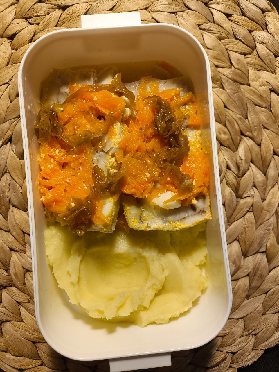 Буженина в горчично-мёдовом маринаде+сметана,2 дня в холодильнике лежала,вчера в аэрогриле запёк за 30 минут. Суховатая т.к. это свиная вырезка,но маринад мне понравился. Сегодня обед на работу: пюрешка и минтай томлёный в сметане с морковкой.