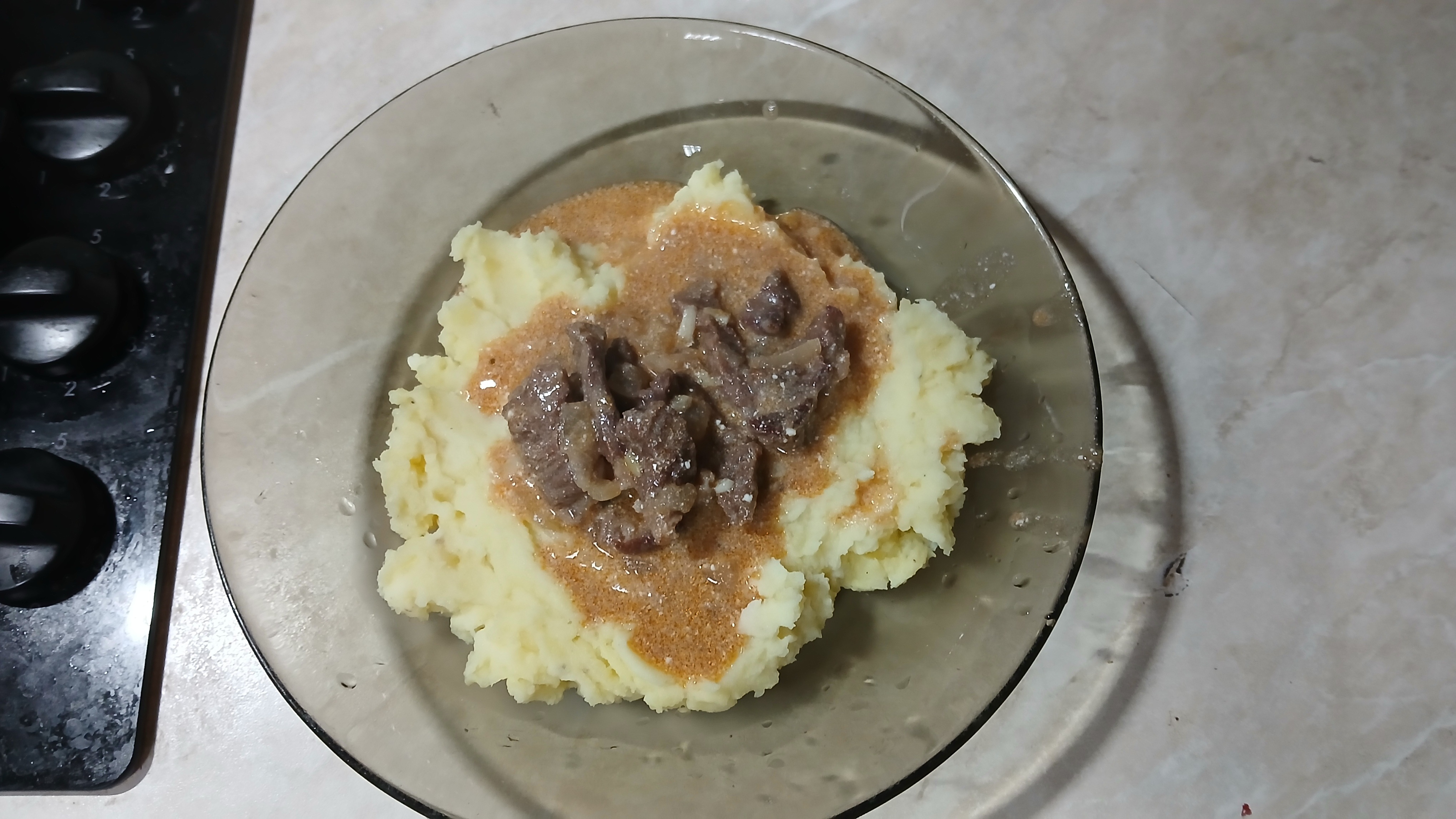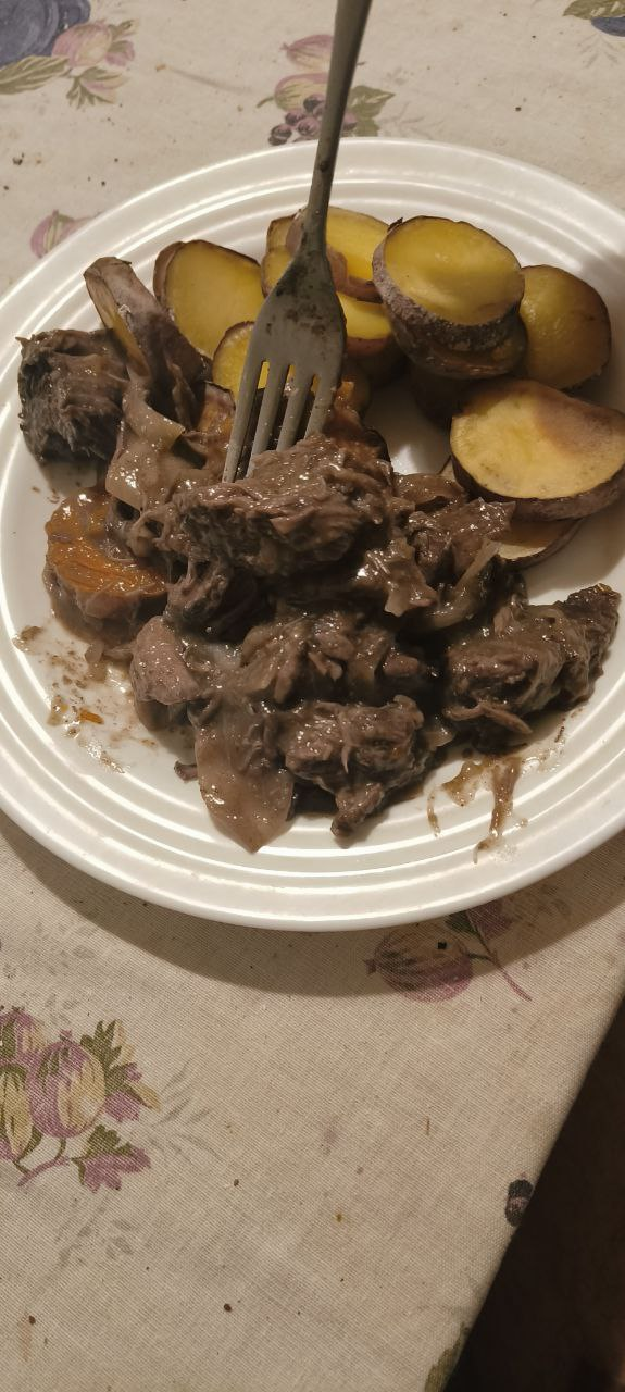 Охрененно вкусное хрючево! Рваная говядина. Томил 2.5 часа в вине и приправах. Потом крахмалом соус загустил, порвал всё и оставил без крышки томиться ещё час, чтобы всё загустело и пропиталось