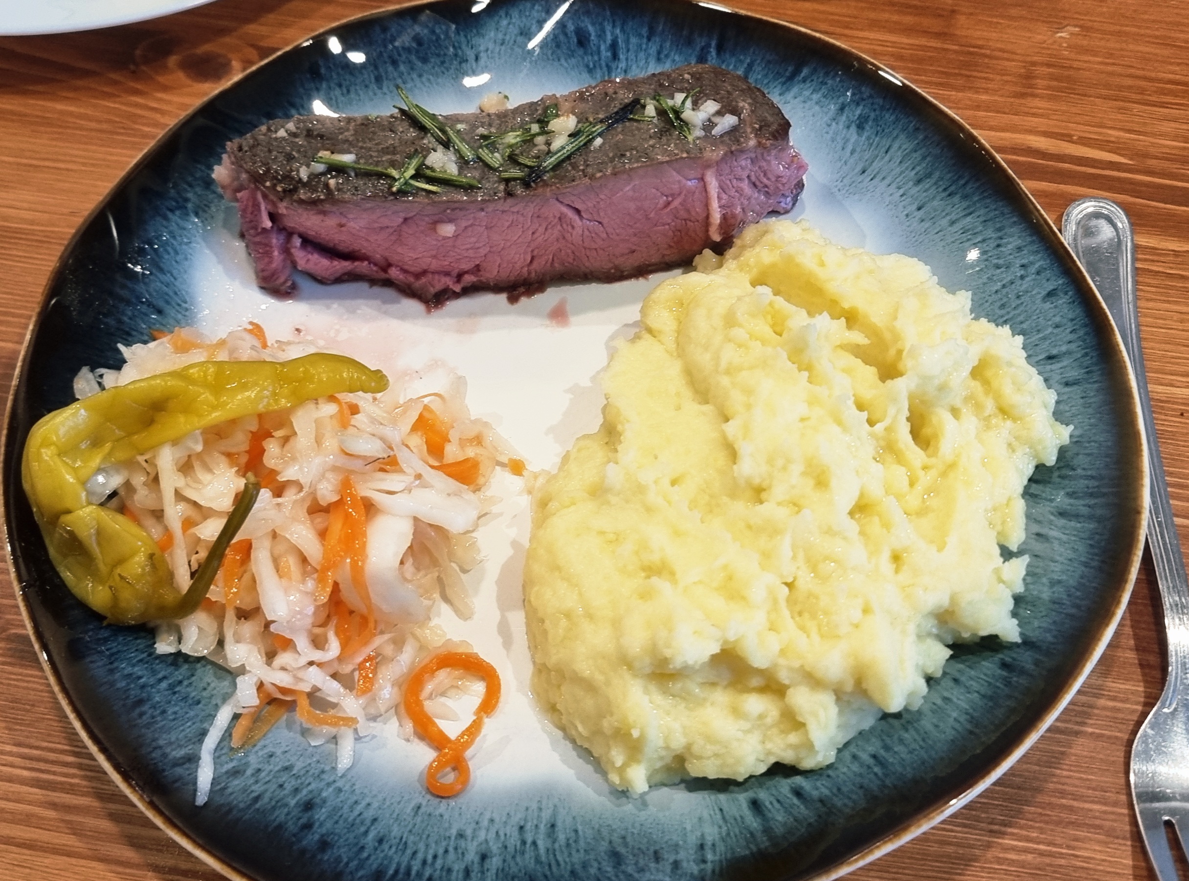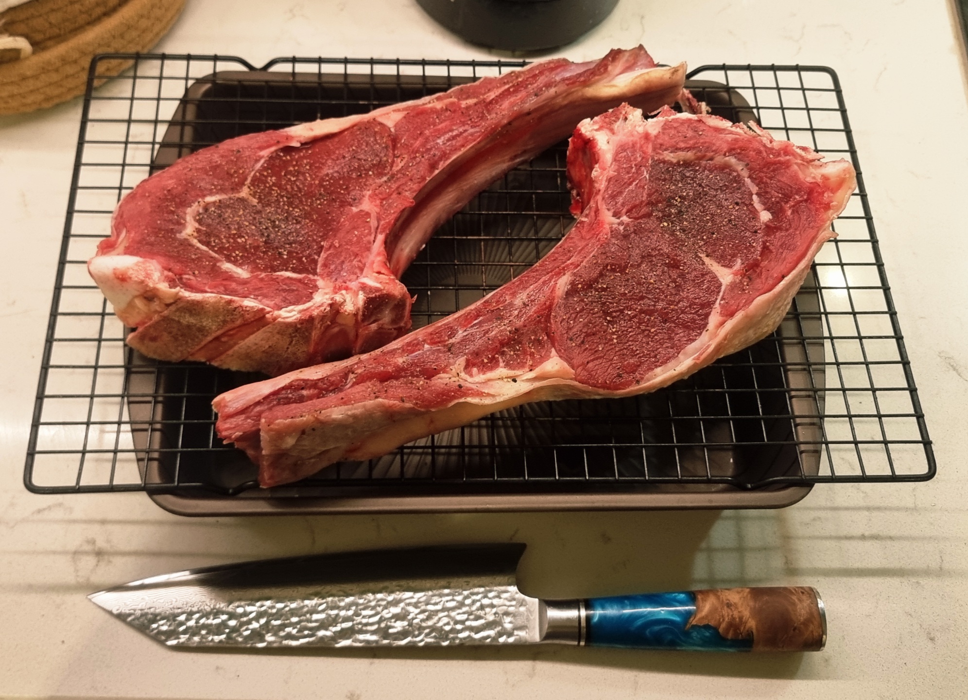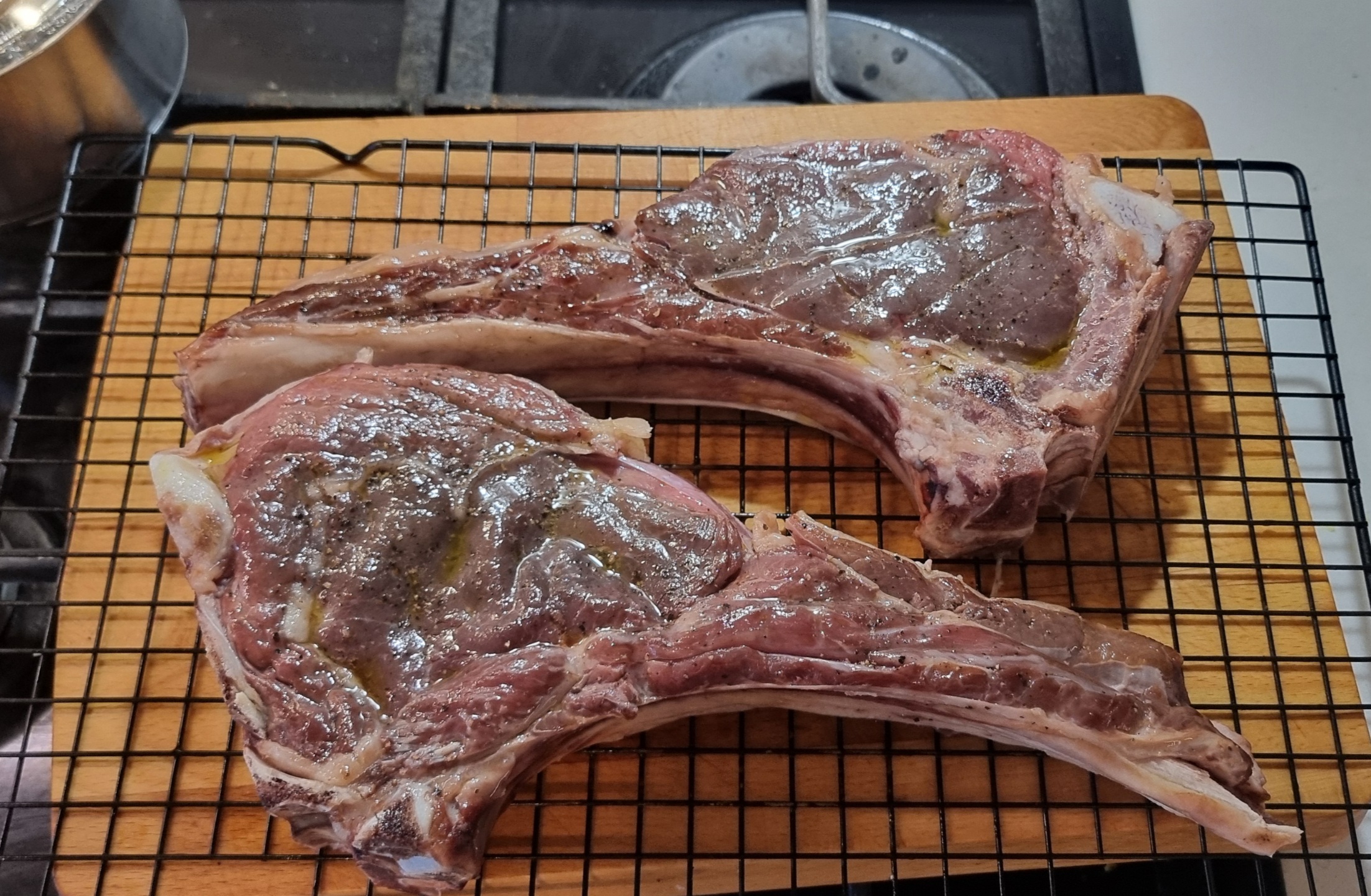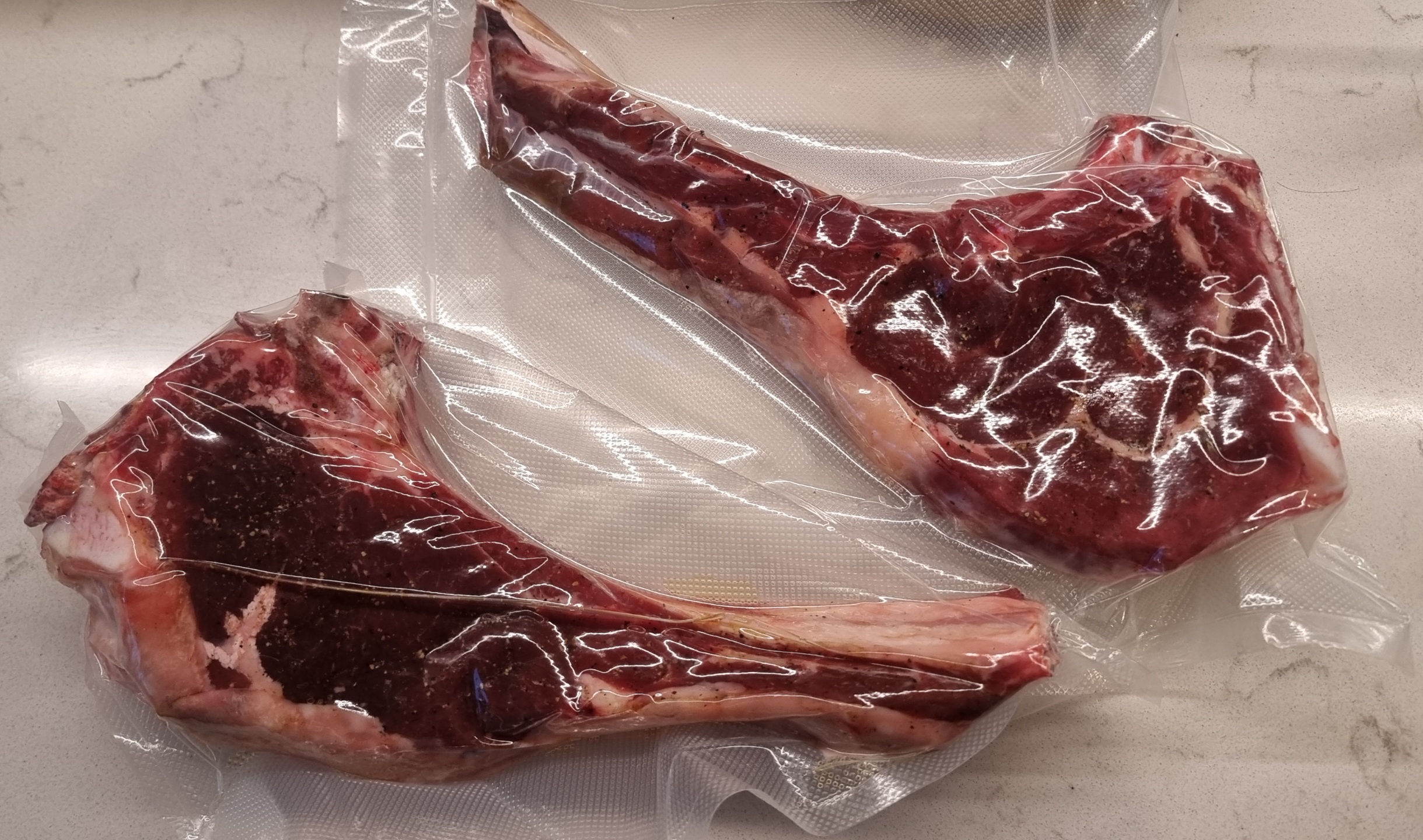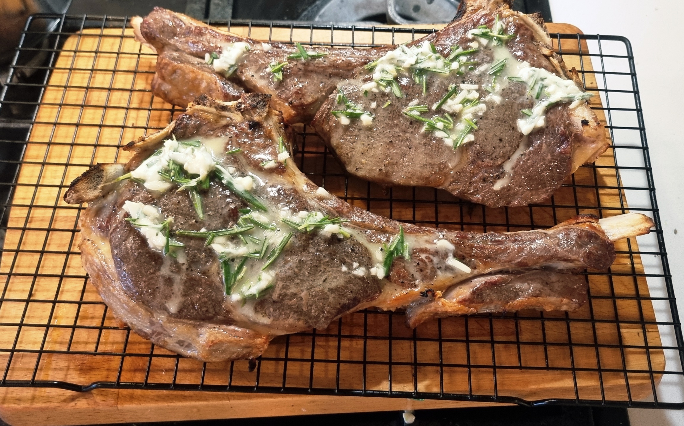 Купил на рынке говядину. Обычно выходила жестковатой, потому сувид. Кремниевый друган посоветовал сначала посолить и на решеточке на ночь оставить в прохладном месте. Потом сувид 4 часа при 56С. Так как в сковородку не лезло, то корочку в духовке делал: непосредственно под гриль, 300С + вентилятор на три минуты сторону. В конце сверху сливочное масло, чеснок и розмарин.