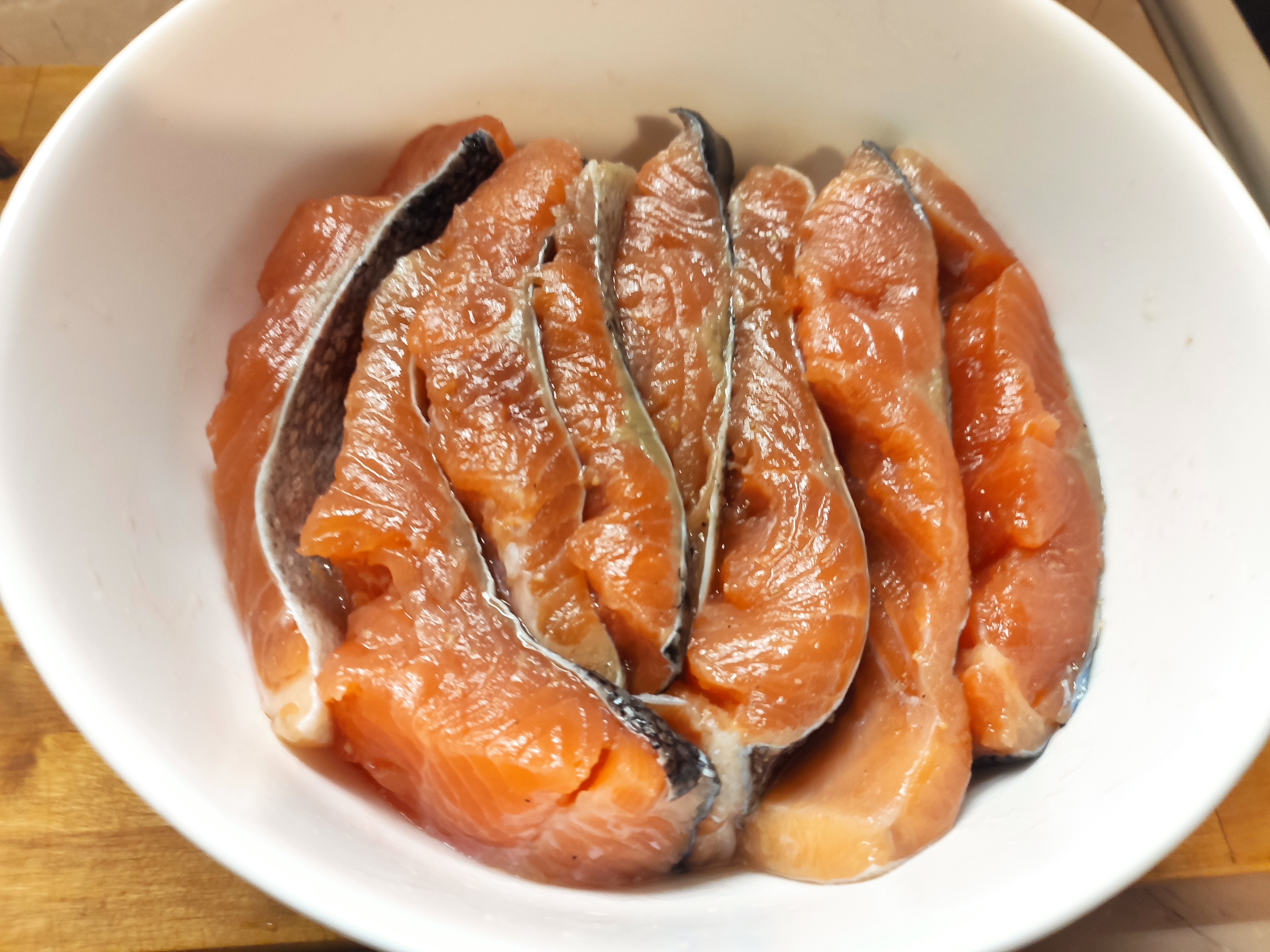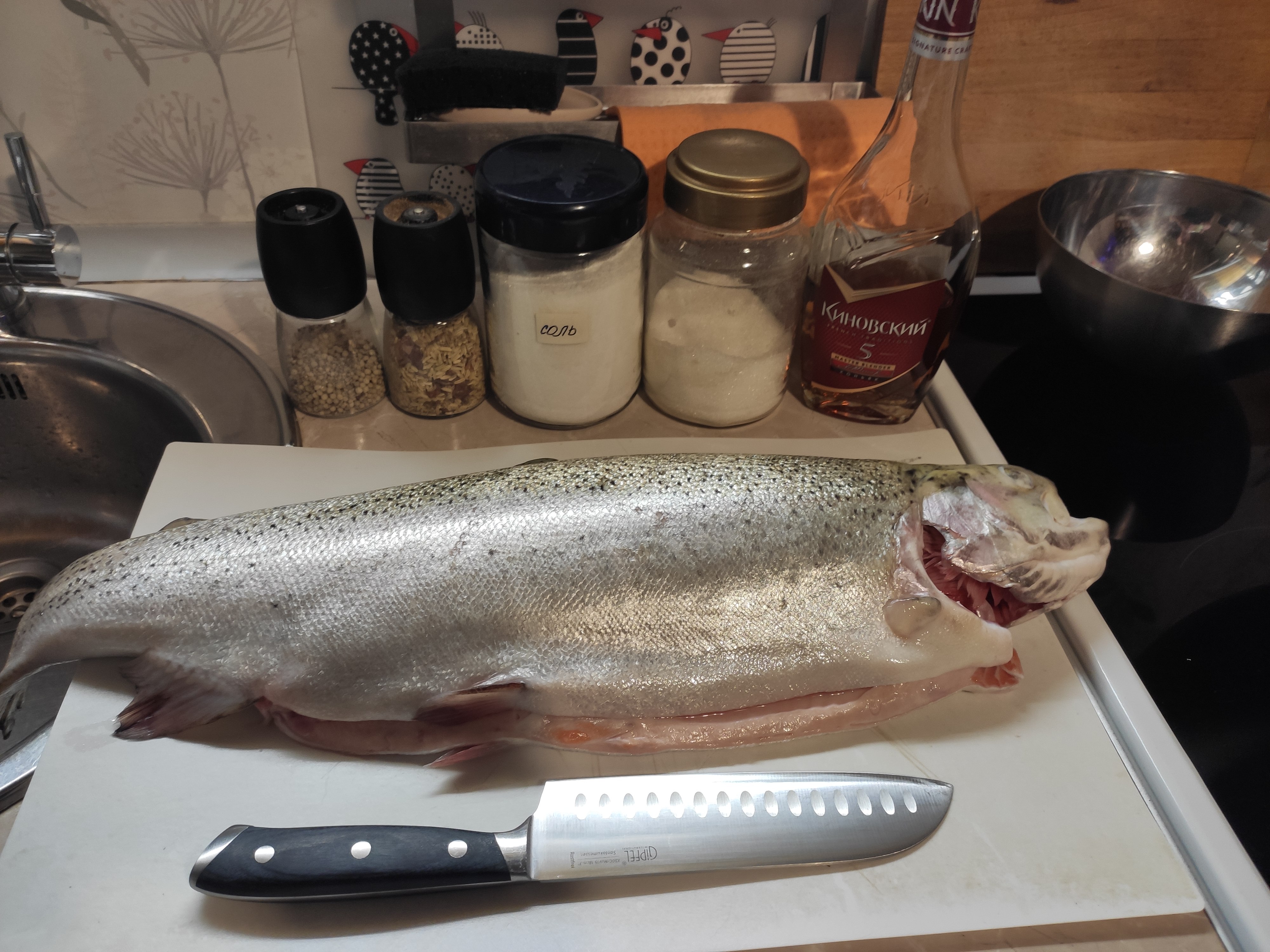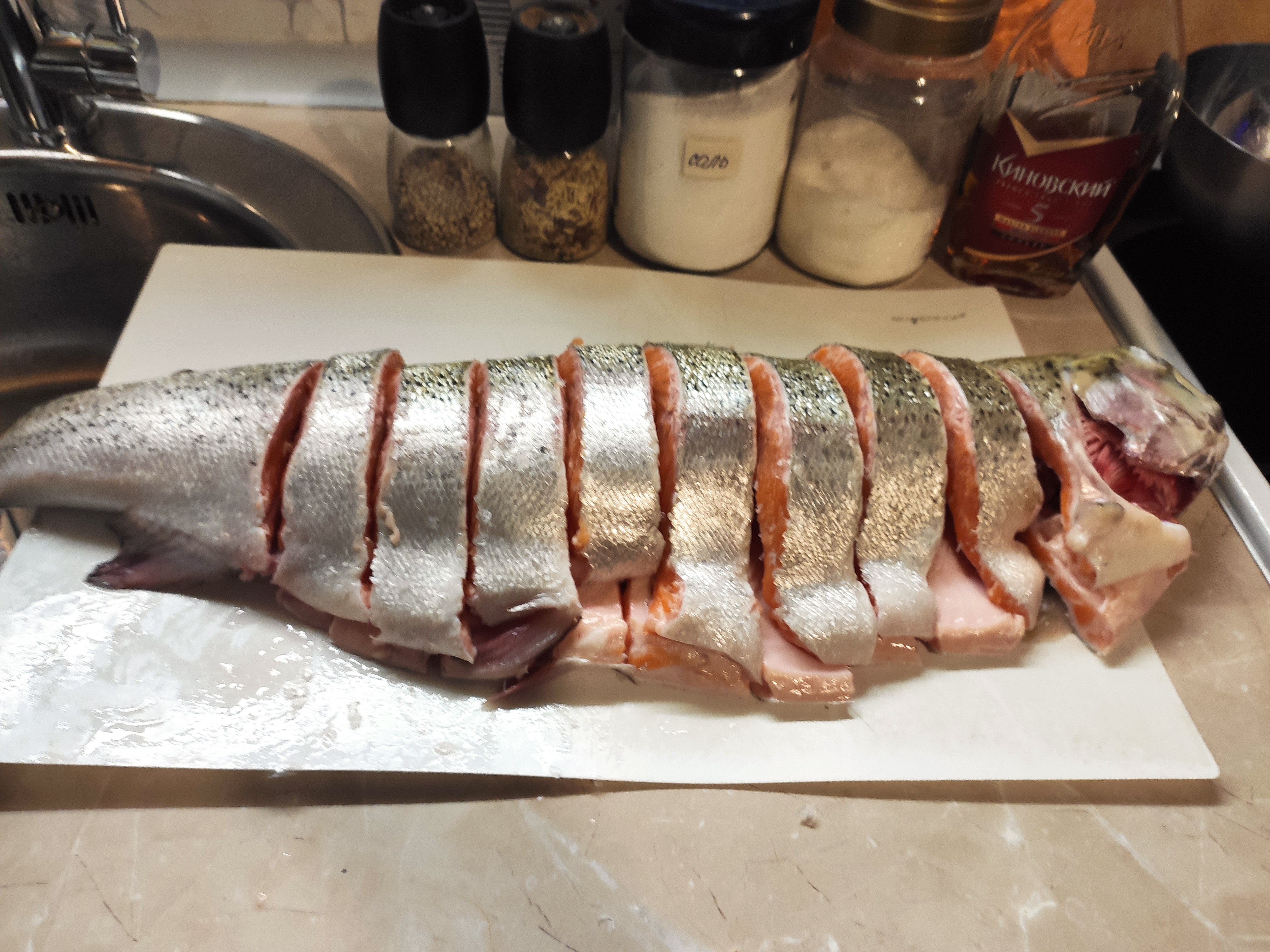 >>759916 >Куски толстоваты всё-же как мне кажется. Нужны раза в полтора тоньше - не просолится, не промаринуется. Либо понадрезать. Не первый раз делаю - нормально просаливается, в моём случае что-то между мало и средне-солом для моего вкуса. Мясо форели менее плотное чем свинина и говядина.