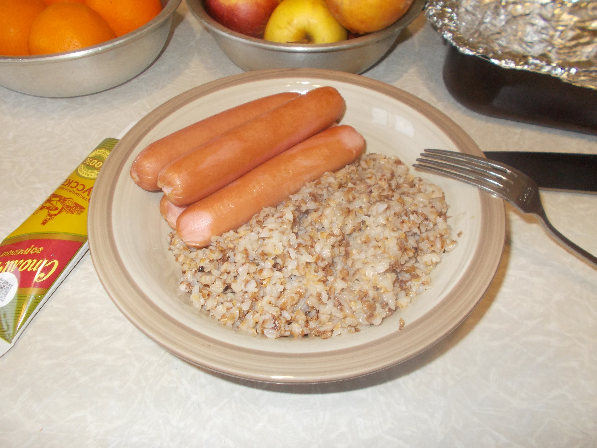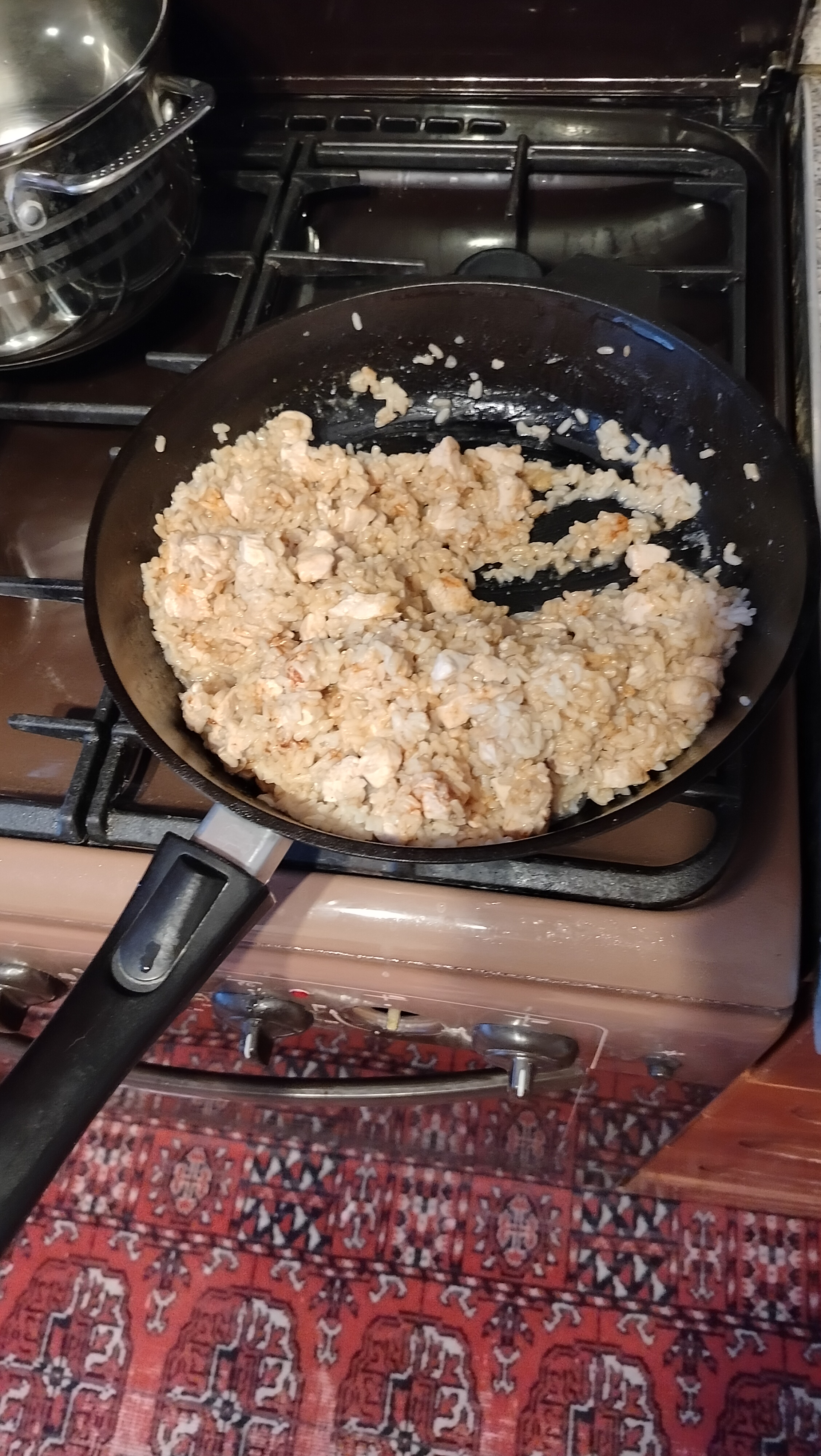 Снова рис с курочкой. На этот раз взял не самый дешёвый (бурый Маркет Перекрёсток Selection), хорошо промыл (рука уже начала онемевать от холодной воды) и даже положил солидный кусок сливочного масла в конце, но всё равно не рассыпчато...