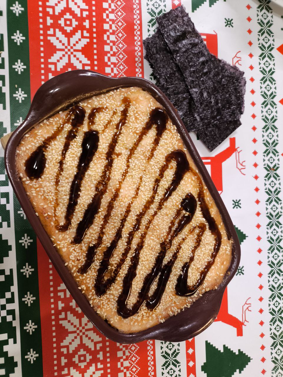 Сегодня на ужин карательная кулинария : запечённый суши-торт. На вид и состав не очень, но на вкус великолепно, нажористо и горячо! Ложкой подцепляешь все слои + нори -> ешь.