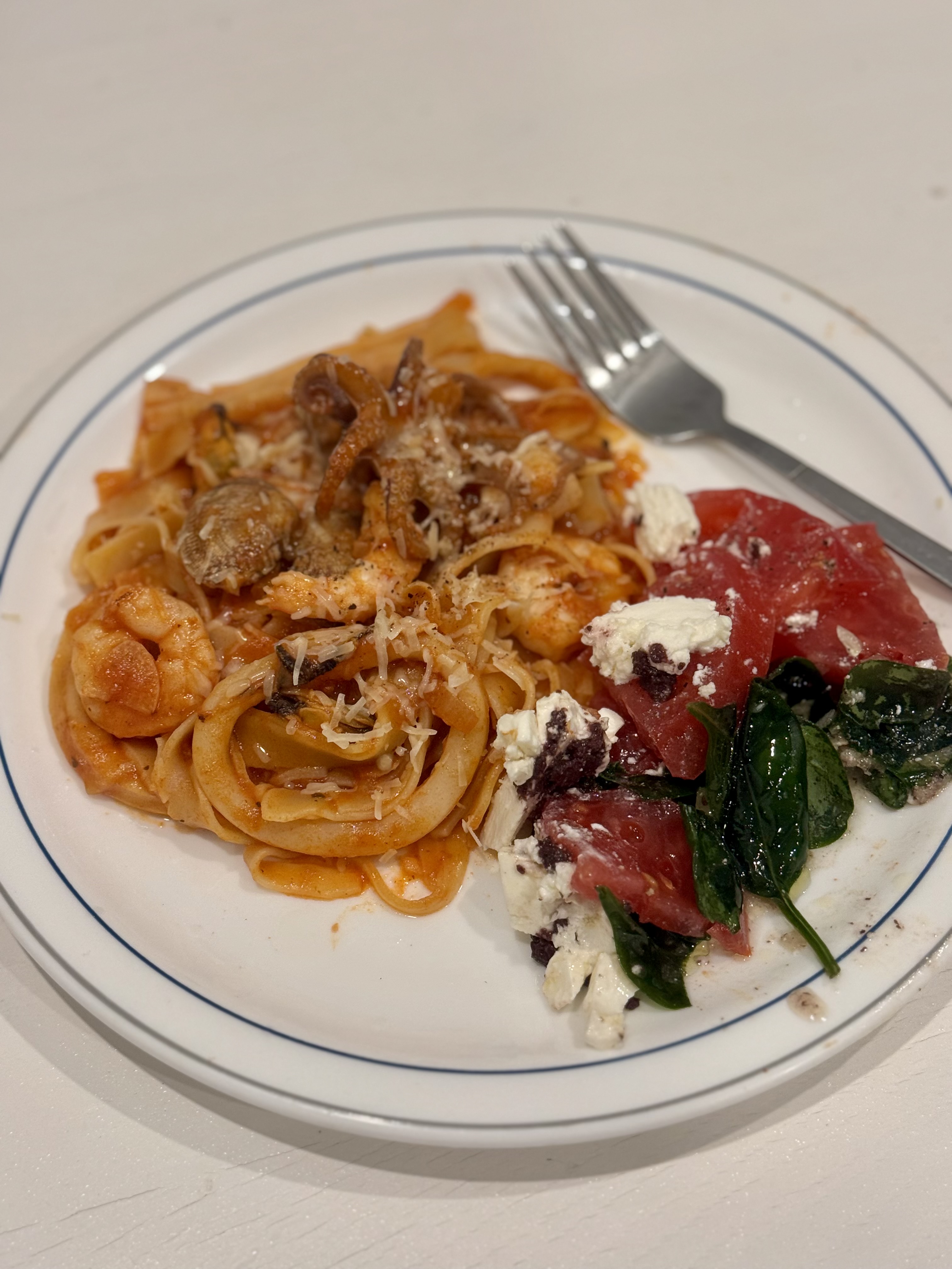 Ко мне давеча гость приезжал долгожданный. Гость до приезда все говорил, что как хочца морепродуктов. Мной был куплен дорогой морской коктейль, мидии на створках…Как гость приехал, говорит - идем в ресторан и «давай мясо, давай мясо». Морепродукты двое суток стояли в холодосе, пока мы шпилились. Правда мидии на створках таки были приготовлены и съедены. Но вчера, уже одиноким вечером, чтобы добро не пропадало пришлось сготовить пасту с морскими гадами. Я ваще такое не люблю, давится в одно рыло придется.