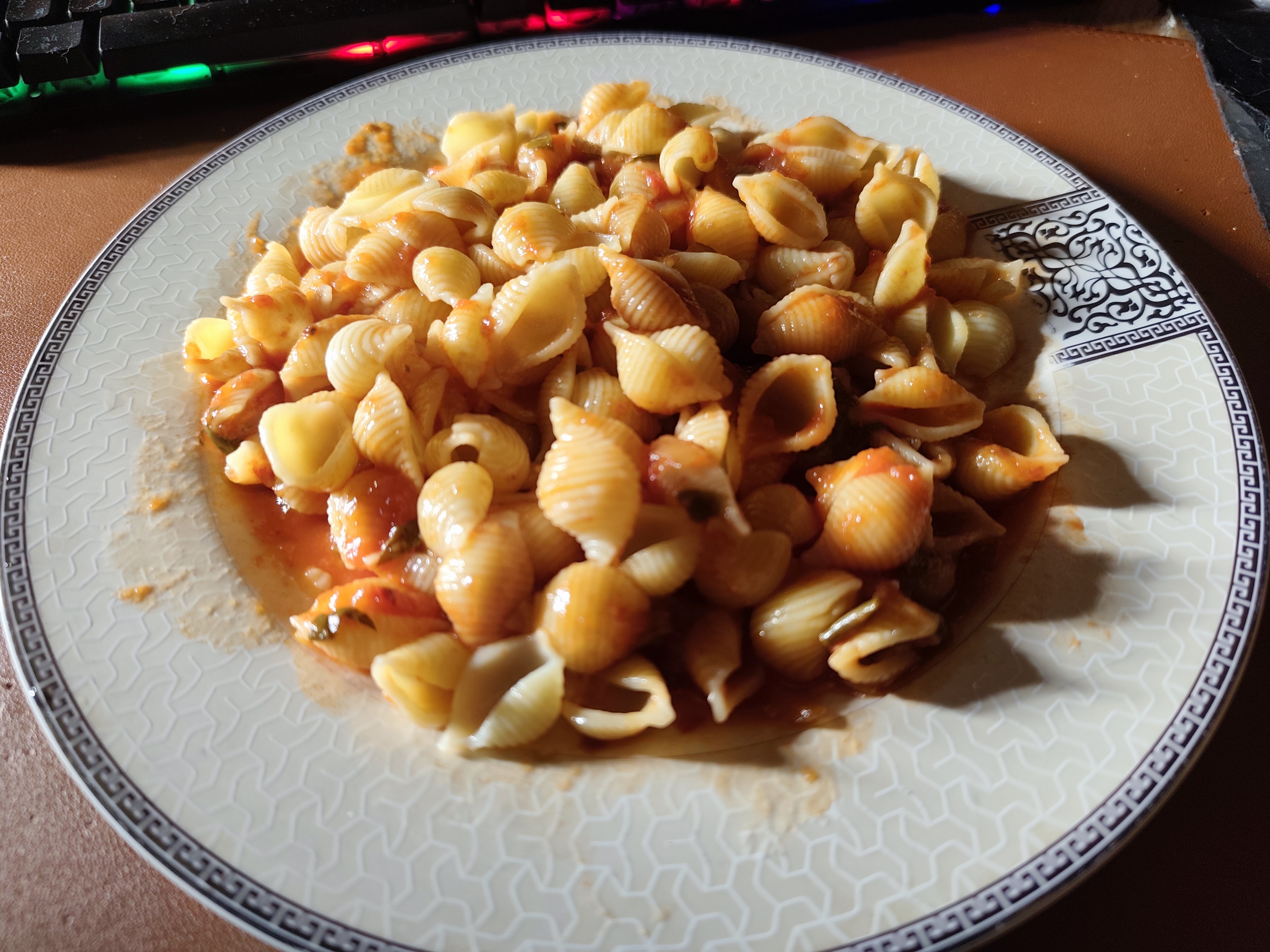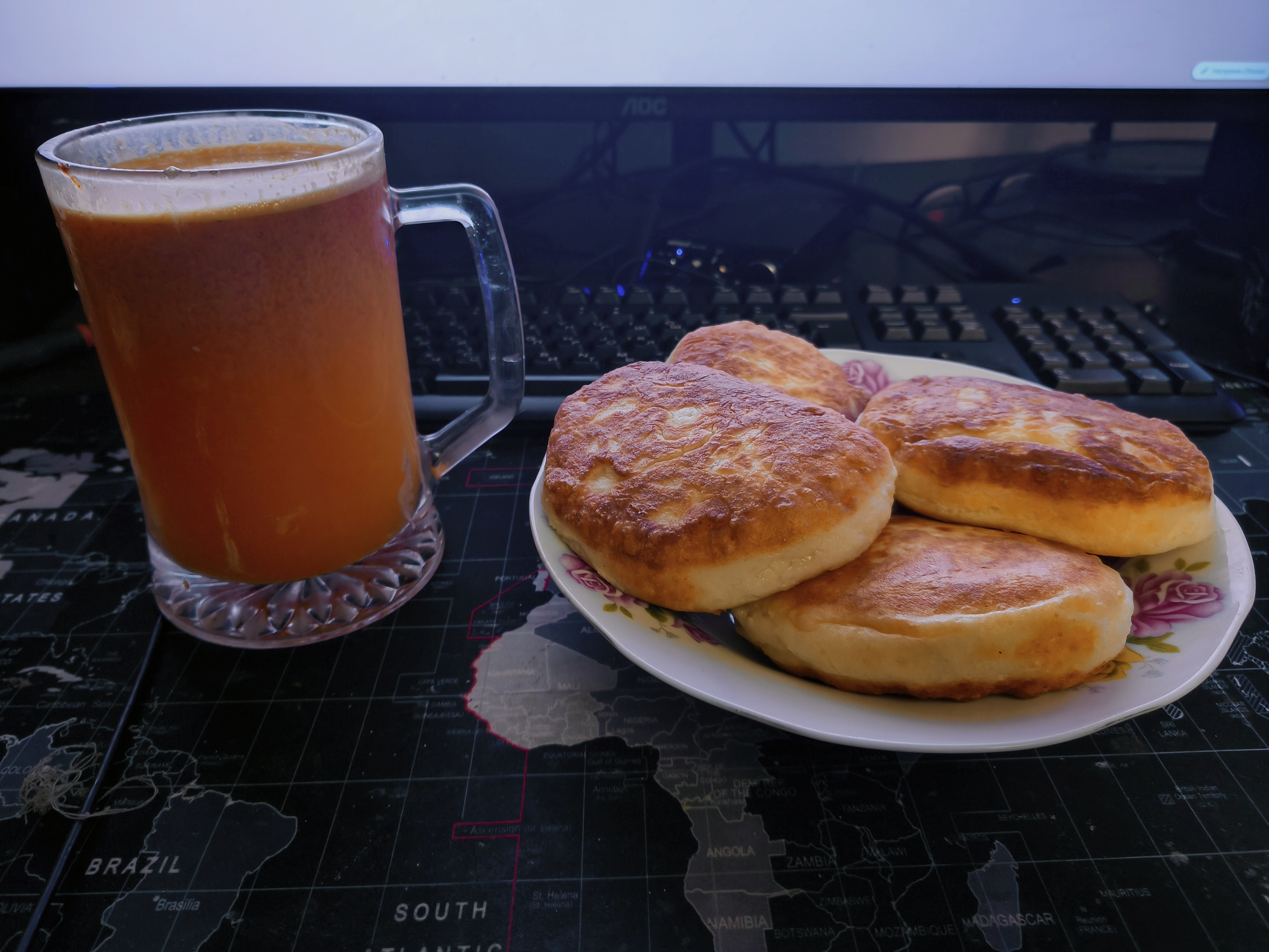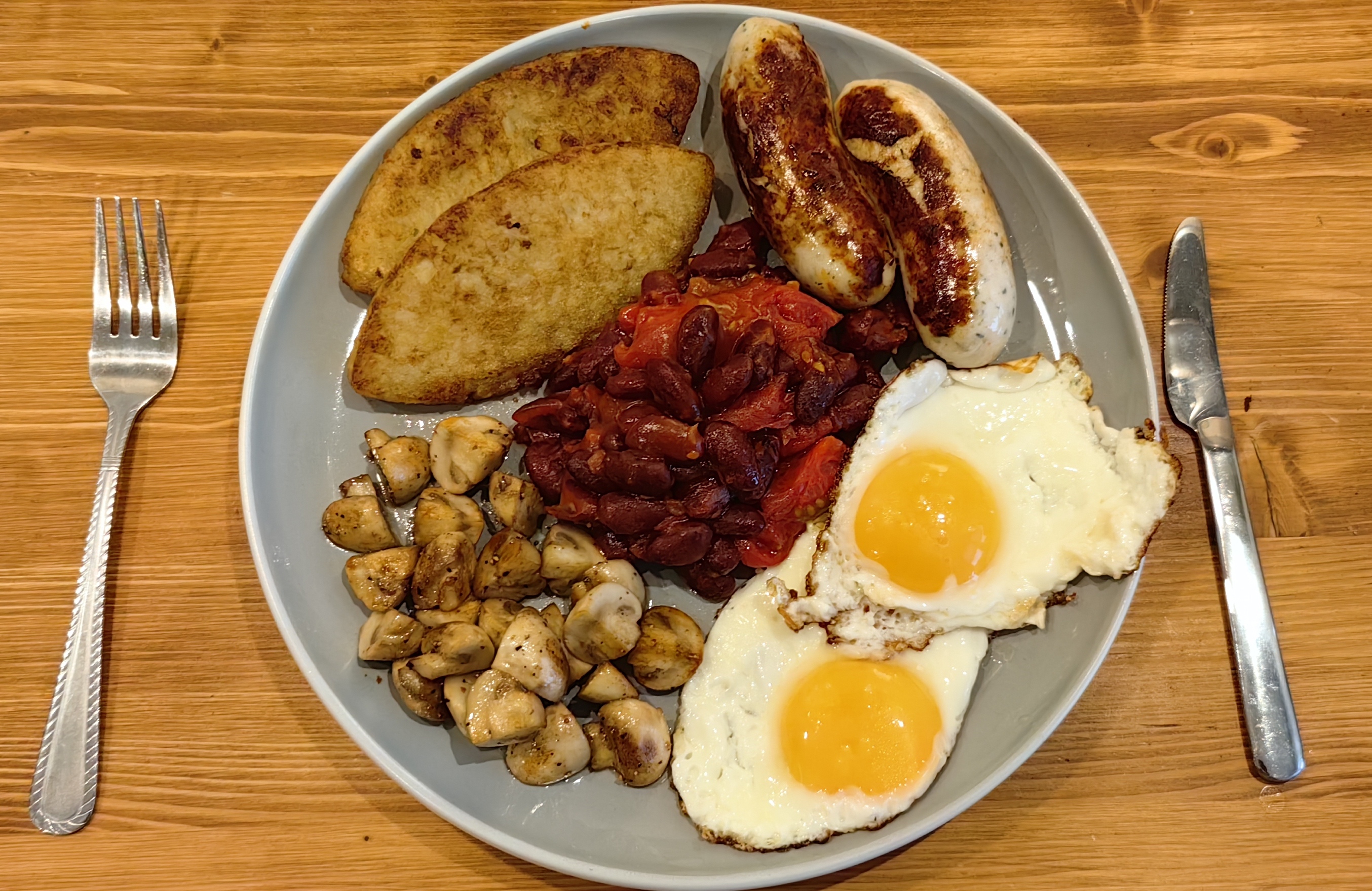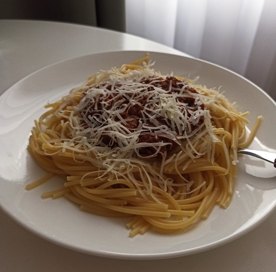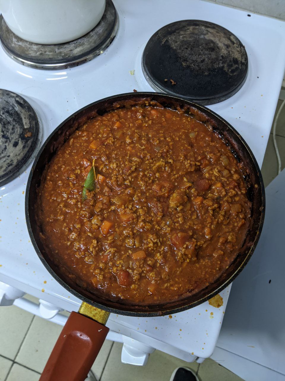 На обед жареная картошка с фасолью, фаршем, луком, в томатном соусе с копченой паприкой, черным перцем, хлопьями чили и шрирачей. Жирно, остро, вкусно.