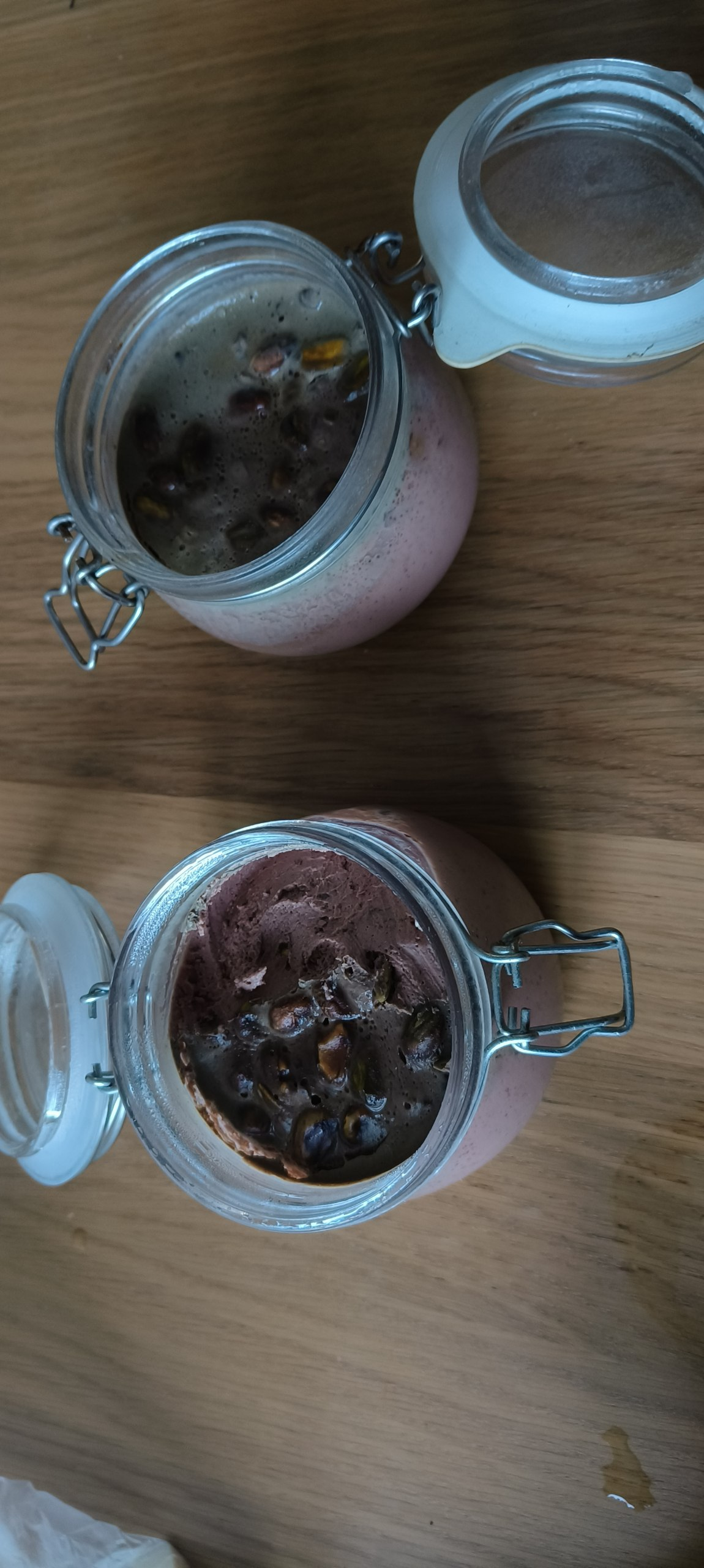 В блендер добавляем содержимое сковороды, сливочное масло, сливки, печень куриную, яйца, чуть мускатного ореха. Всё пробиваем В ПЫЛЬ. Массу пропускаем через сито, чтобы сделать парфе. Соль (просто поваренная даст серый цвет, а 1/2 с нитритной даст розовый и ветчинный вкус). Разливаем пл банкам, в банки вмешиваем фисташки и жаренные кусочки утки. Прикрываем (не до конца) и ставим в сувид на 68 градусов. Готовить так 2 часа. ВАЖНО: дать настояться 12-24 часа в холодильнике. После сувида содержимое будет слегка жидким, эмульгация завершится в конце.