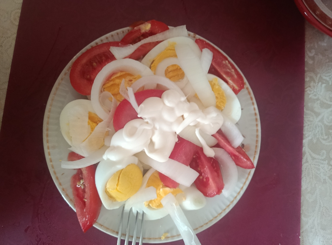 Палю салат: солёные огурцы мелким кубиком, зелёные яблоки мелким кубиком, лук получается режется вдоль (от полюса к полюсу) на тонкие одинаковые части, начинается почти горизонтально и учитывая изгиб лука они одинаково режутся ориентируясь на центр луковицы. Потом лук мариновать, манез смешать с острой горчицей и чёрным перцем, соединить с маринованым луком и хрючить. Непитательный, но пздц вкусный.