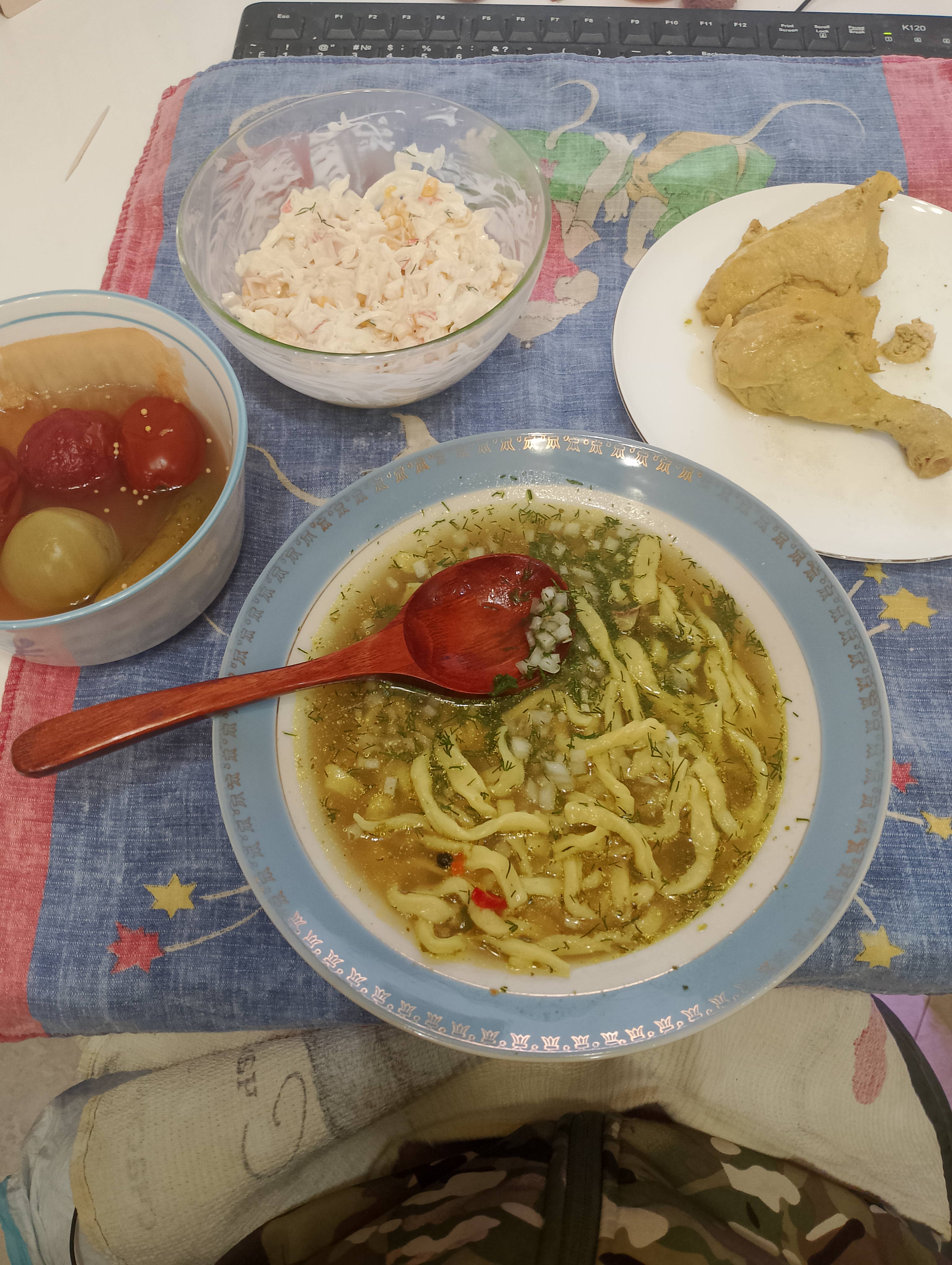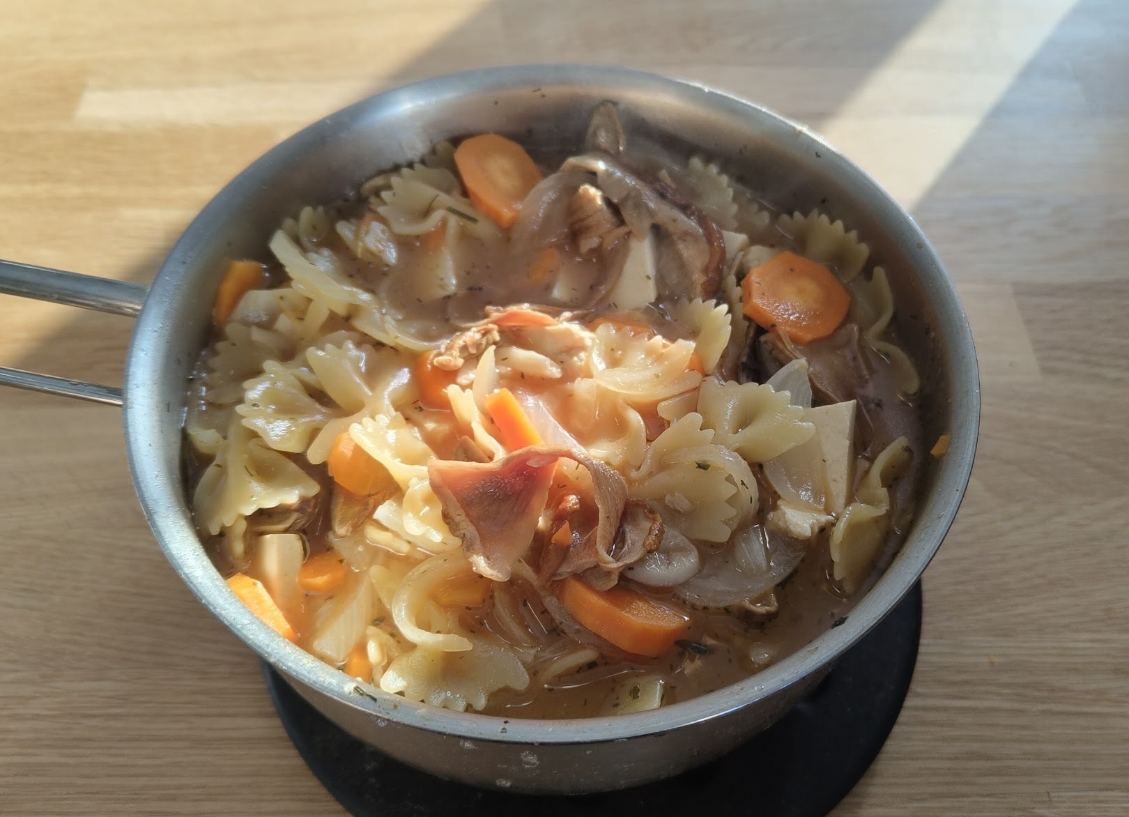 Простой рабоцкий ланч за 15 минут. Обжарил морковку с луком и чесноком в ковшике с паприкой, влил воды, макарошки, бульон говяжий порошковый, посолили поперчили, смесь сухих трав (базилик сельдерей и петрушка), тофу да сушеные белые грибы. Выглядит так себе, на вкус прям хорошо, еще бы сутки постоять бульону.