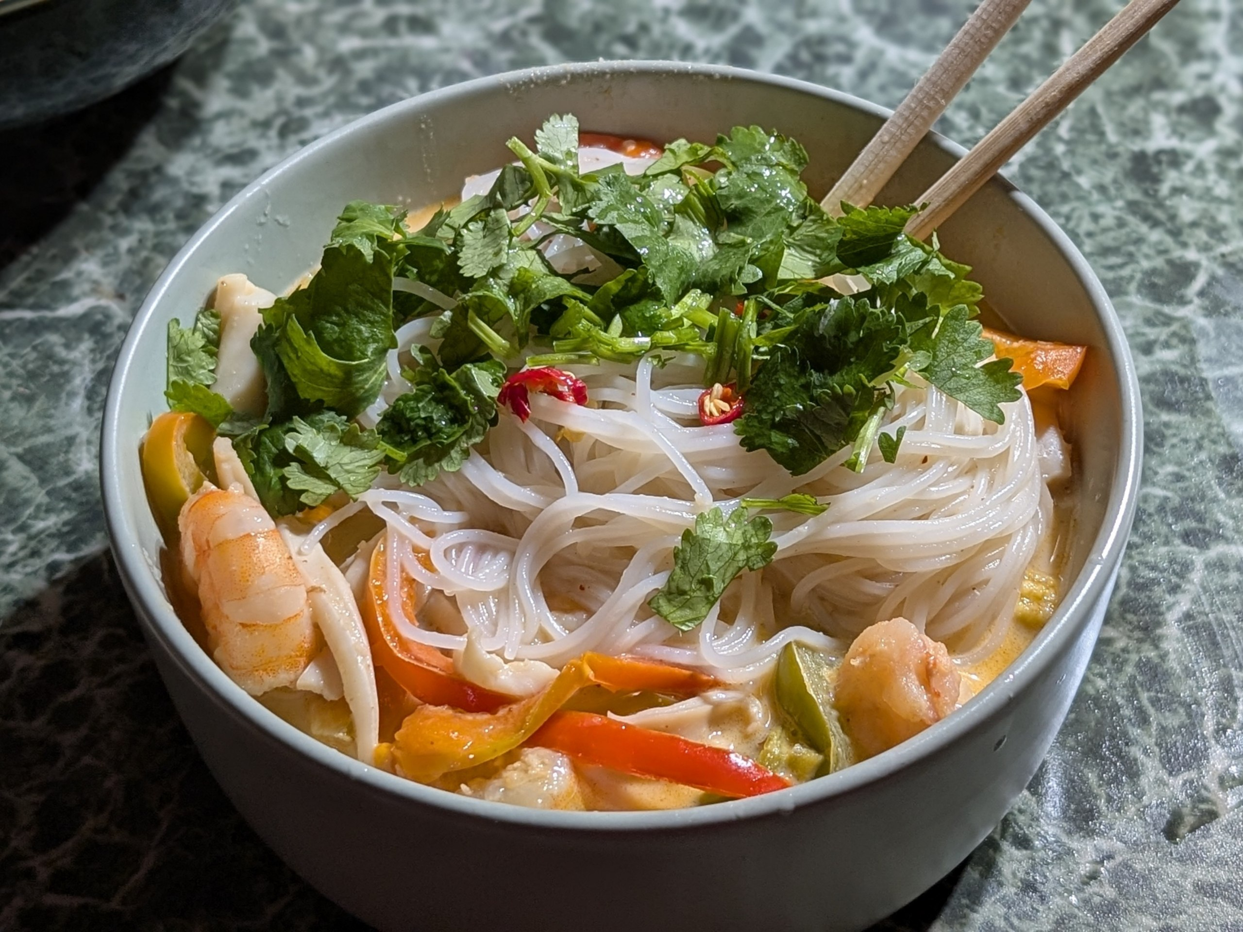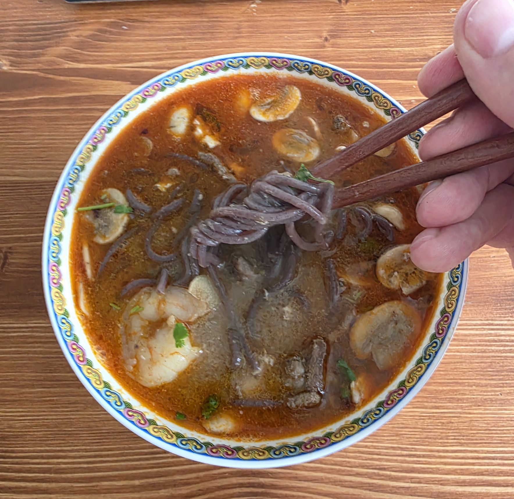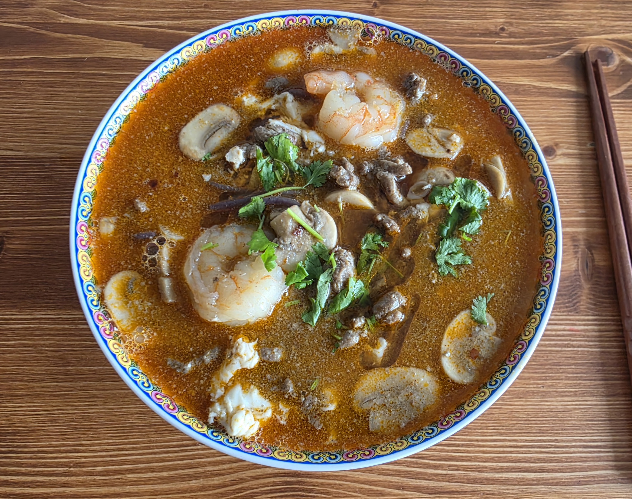 Мисо суп с креветками и говяжьим фаршем, шампиньонами и безглютеновой лапшой из чёрного риса, а также яйцом. Бульон хондаши, паста мисо. Чутка соевого соуса.