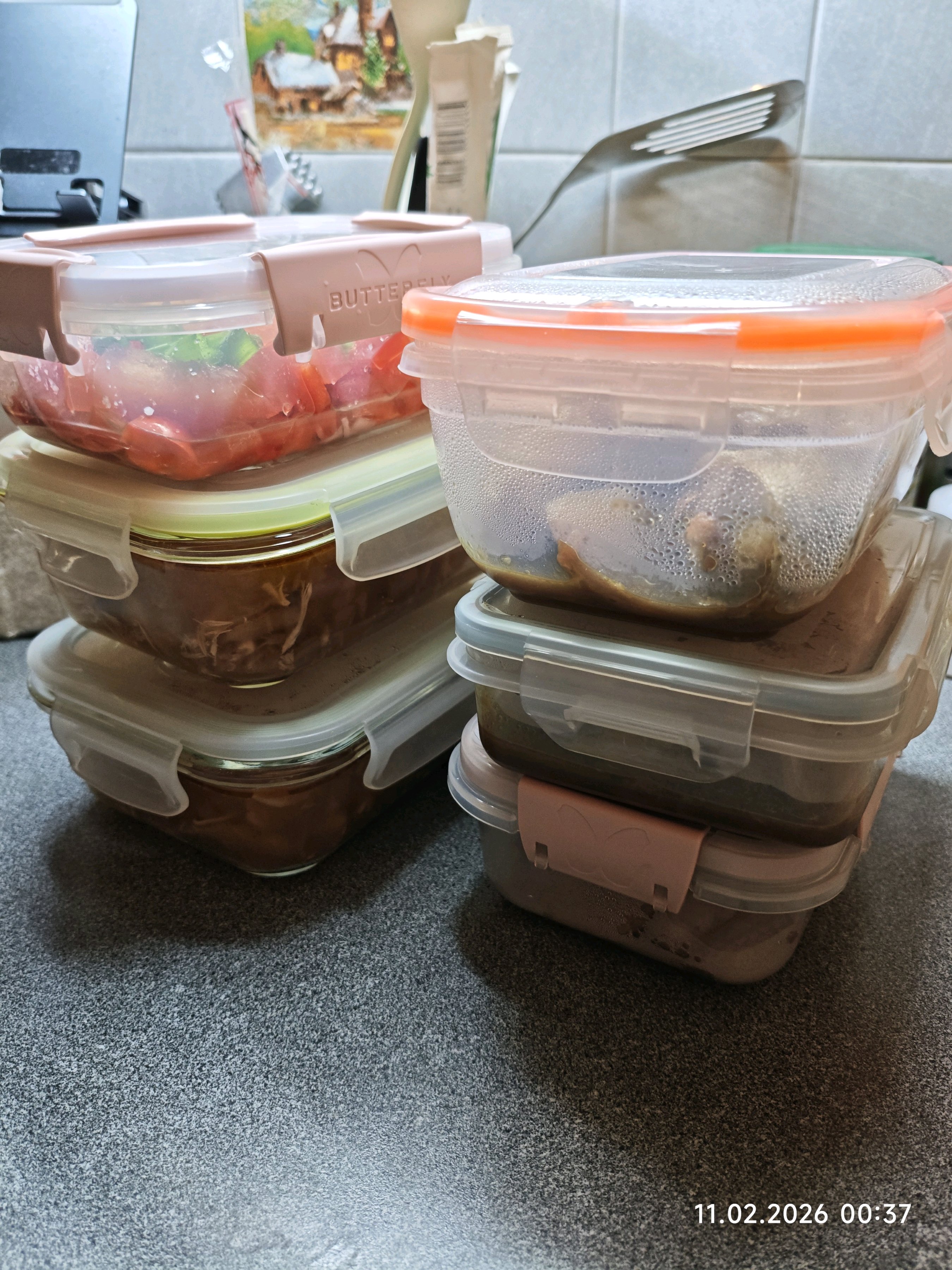 Ссобойка раковая - каклетки покупные говкур, без хрящей и птичьих клювов, дотушил после обжарки, в томатпасте и остатках аджики. На завтра с рисом и на понедельник с макарошками. В выходные такой нажор не ем, ибо нагрузок физических нет - в выходные куриный супчик да гречка с грибочками будет