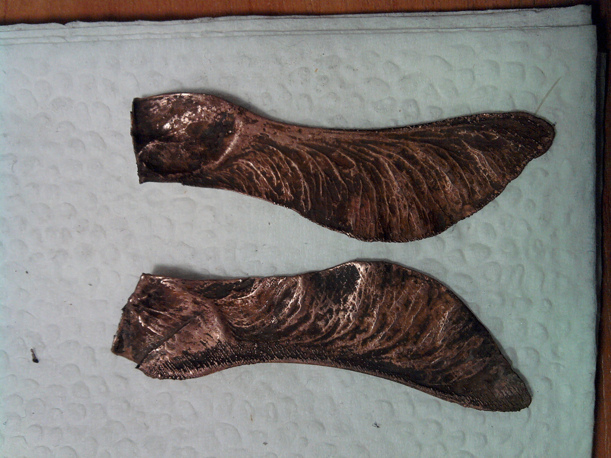 Посмотрел https://www.youtube.com/watch?v=wTutAqnQJsQ и решил попробовать тоже. Отправился в парк и набрал листиков. На литр воды взял грамм 200 медного купороса, добавил около 50 мл серной кислоты 44% ("корректирующий электролит" в автомагазине), 10мл изопропиолвого спирта. Гайды в интернетах говорят, это может улучшить качество покрытия. В качестве источника электричества - зарядное устройство для автомобильных аккумуляторов. Анодом - жила толстого провода. Самый дорогой компонент - графитный клей в аэрозольном баллончике. Графитовая смазка не подходит - она не застывает и совсем плохо проводит электричество. Попшикал на листик с обеих сторон, много и толсто наносить не надо, разгладил кисточкой, опустил на зажиме-крокодиле в электролит. Долго ничего не происходило, затем листочек плавно покрылся медью. Покрыл медью сережки от клёна, затем патинировал в растворе марганцевки и медного же купороса. Медь потемнела. Прошелся мелкой наждачкой, выпуклости заблестели. Тогда покрыл сережки несколько раз цапон-лаком, затем купил дешманских швенз (так называются застежки на серьгах, оказывается) и сделал бижутерию. Теперь медью покрывается другая пара кленовых серёжек. Хочу залудить их химически, затем натереть войлоком и посмотреть, что из этого выйдет. Было бы интересно изготовить что-нибудь методом гальванопластики, жетон на метро, например. Медненными монетами с автоматами расплачивался, это не вызвало проблем.