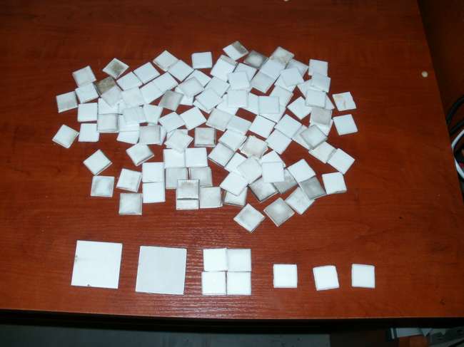 Аноны, все еще стоит вопрос, что из легкодоступного говна из магазов можно использовать для мозаики. Критерии: 1. одинаковость кусочков 2. квадратики стороной 1см 3. возможность покраски