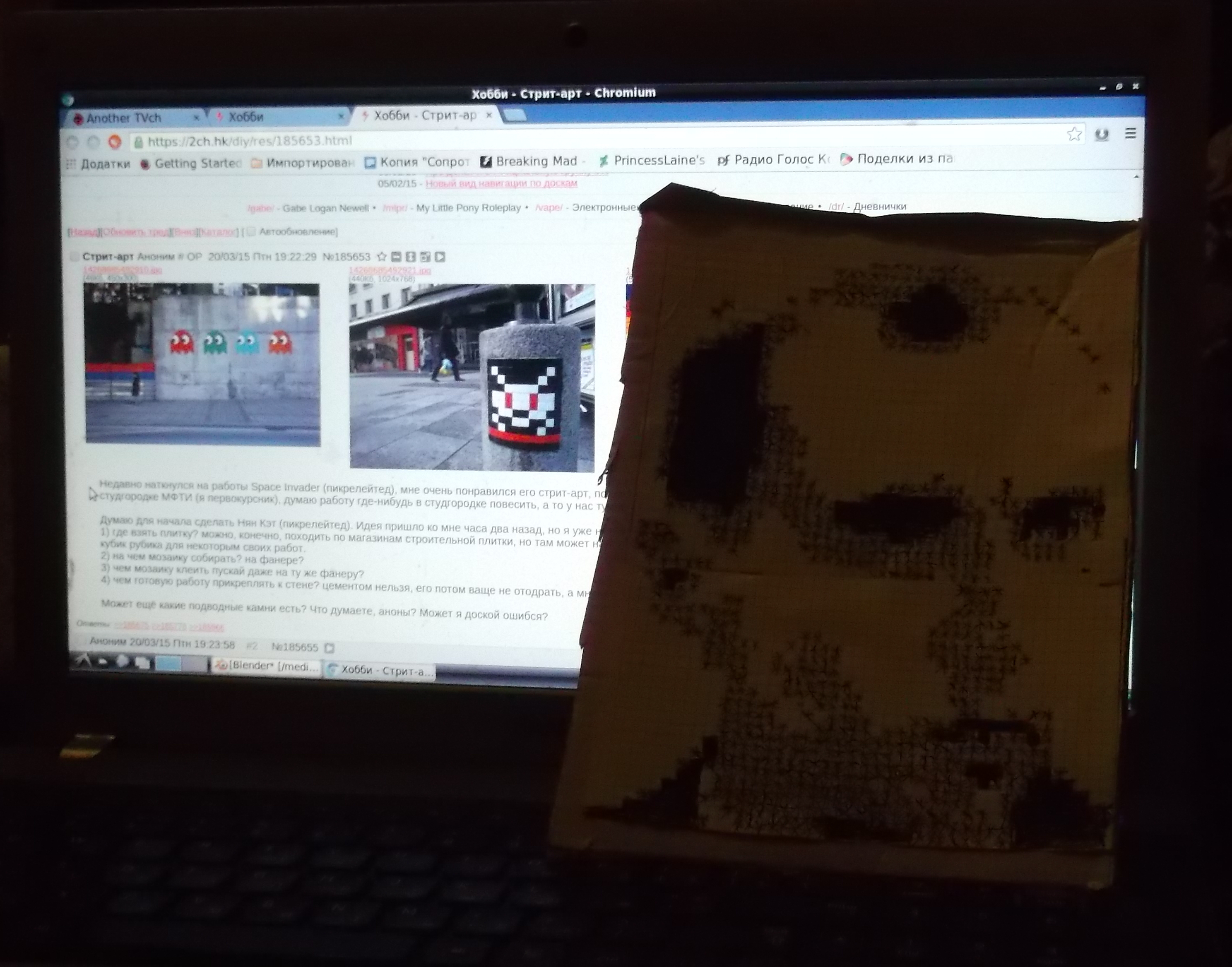 Думаю для начала сделать Нян Кэт (пикрелейтед). Идея пришло ко мне часа два назад, но я уже напоролся на некоторые подводные камни. 1) где взять плитку? можно, конечно, походить по магазинам строительной плитки, но там может на найти ярких цветов. в одном месте прочитал, что сам Space Invader использовал кубик рубика для некоторым своих работ. 2) на чем мозаику собирать? на фанере? 3) чем мозаику клеить пускай даже на ту же фанеру? 4) чем готовую работу прикреплять к стене? цементом нельзя, его потом ваще не отодрать, а мне нужно в случае крайне необходимости иметь возможность отодрать со стены работу
