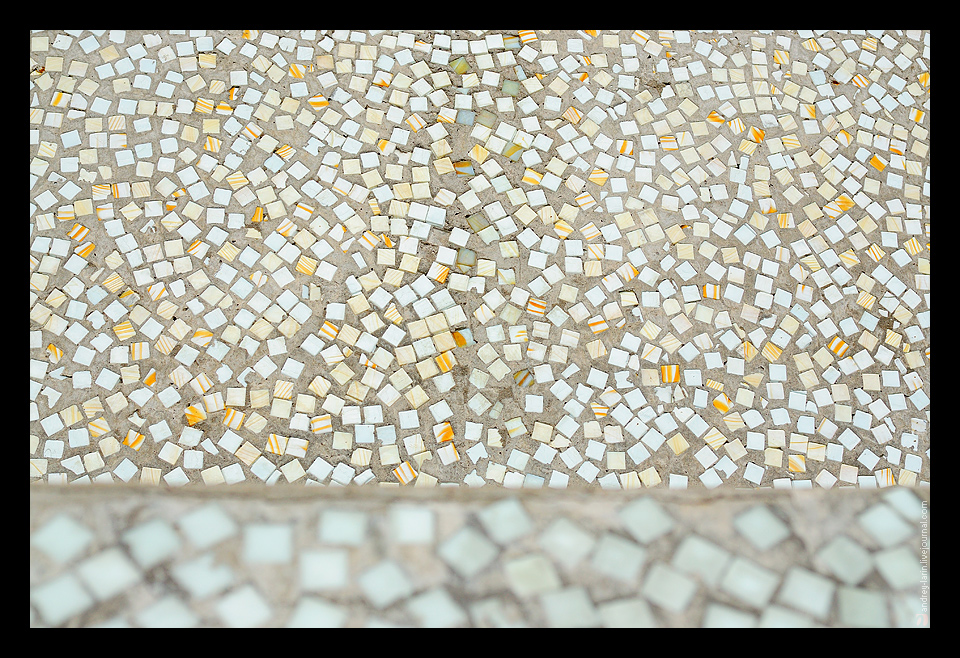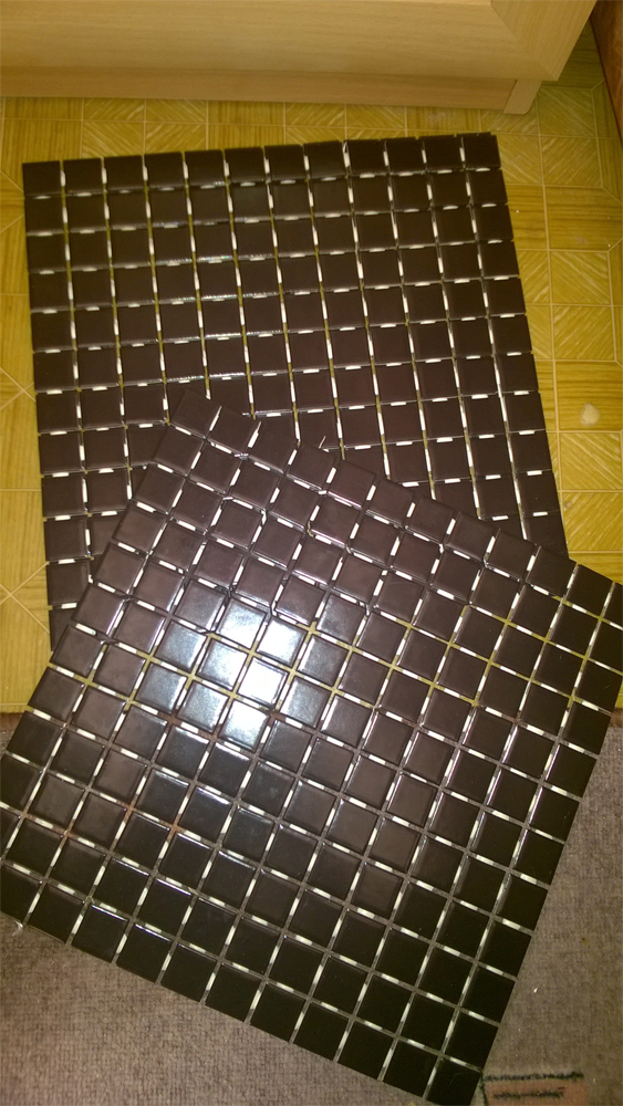 Вместо плитки использовать обычное стекло нарезанное на квадратики (скоблим ровно, отламываем), крашеное с другой стороны, но на что вы предложите клеить его?