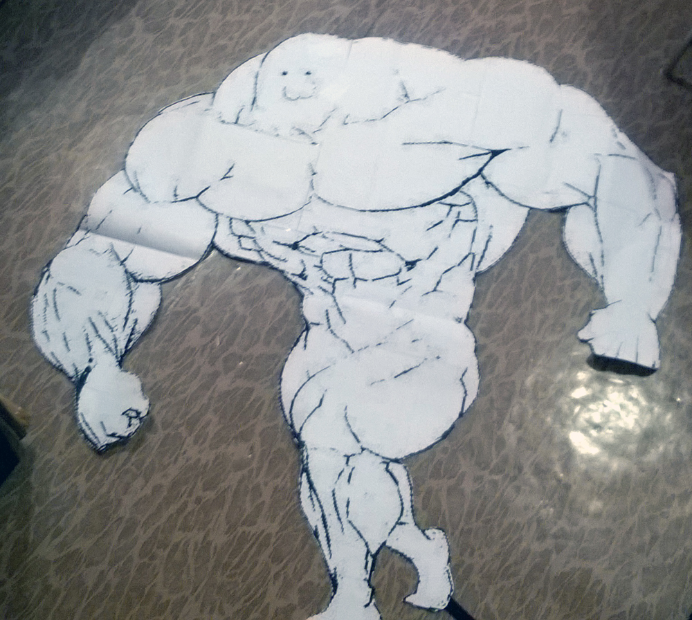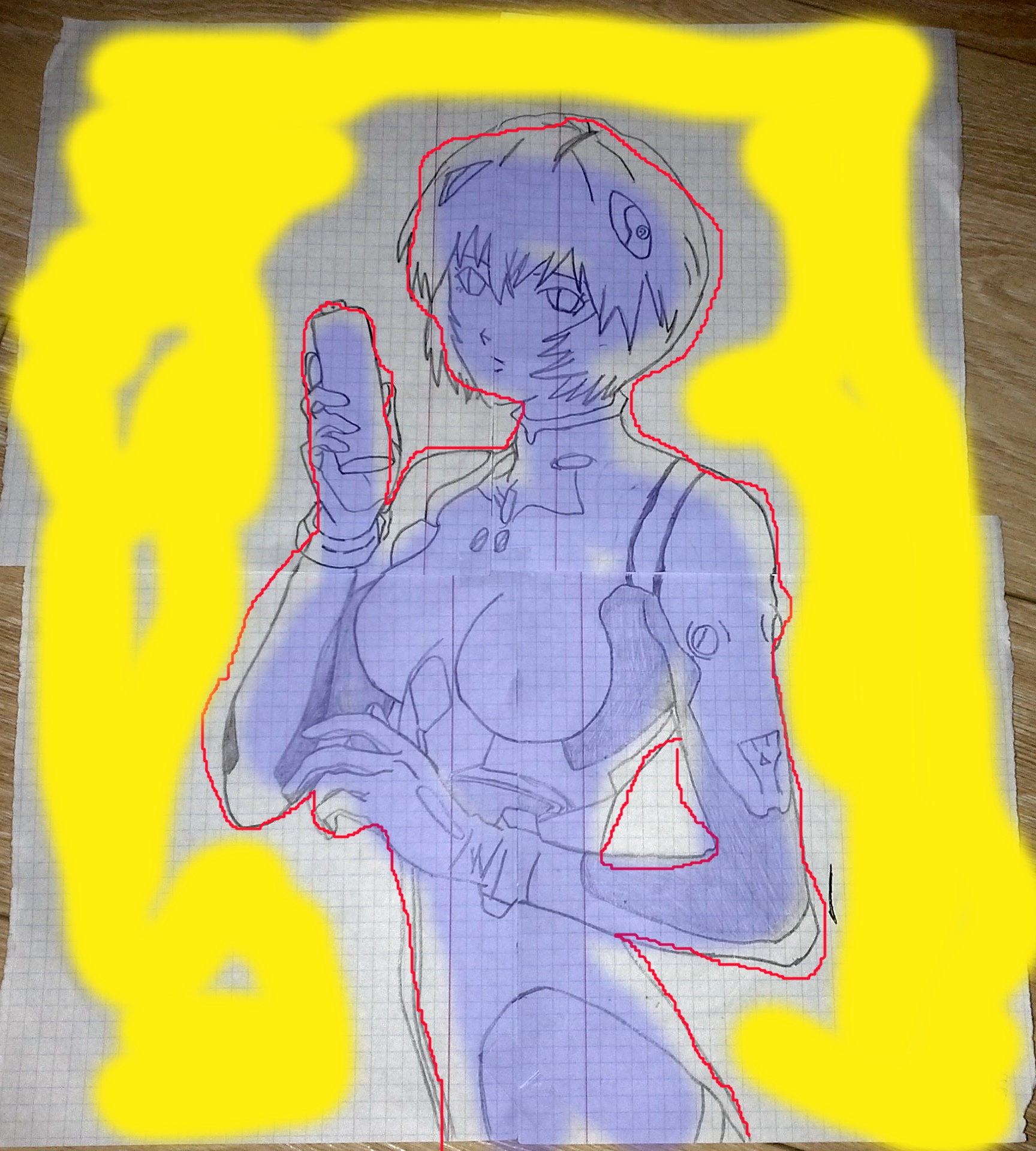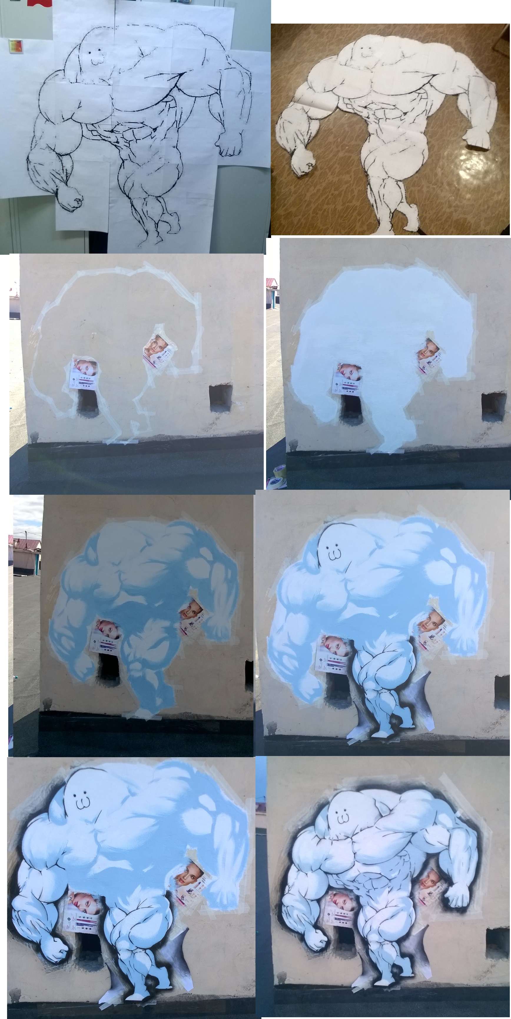 >>319994 Сложноватый рисунок, советую напечатать (можно в ч/б, для контрастности) его в масштабе и склеить. Затем вырезать аккуратно по контуру (красный на пике), затем приклеить к стене шаблон (синий) малярным скотчем по всему контуру, затем по контуру рисунка вырезать ножом канцелярским и внутри закрасить базовыми цветами (синие волосы, кожа, костюм белый и т.д.), а затем разрезать синий шаблон на части (руки, например, сиськи, лол), прикладывать, обводить и закрашивать, тут уже придется применять какие-никакие творческие навыки. Желтый шаблон желательно оставить до того момента, пока рисунок не будет готов, вдруг пригодится. По такому принципу я нарисовал белого болванчика.