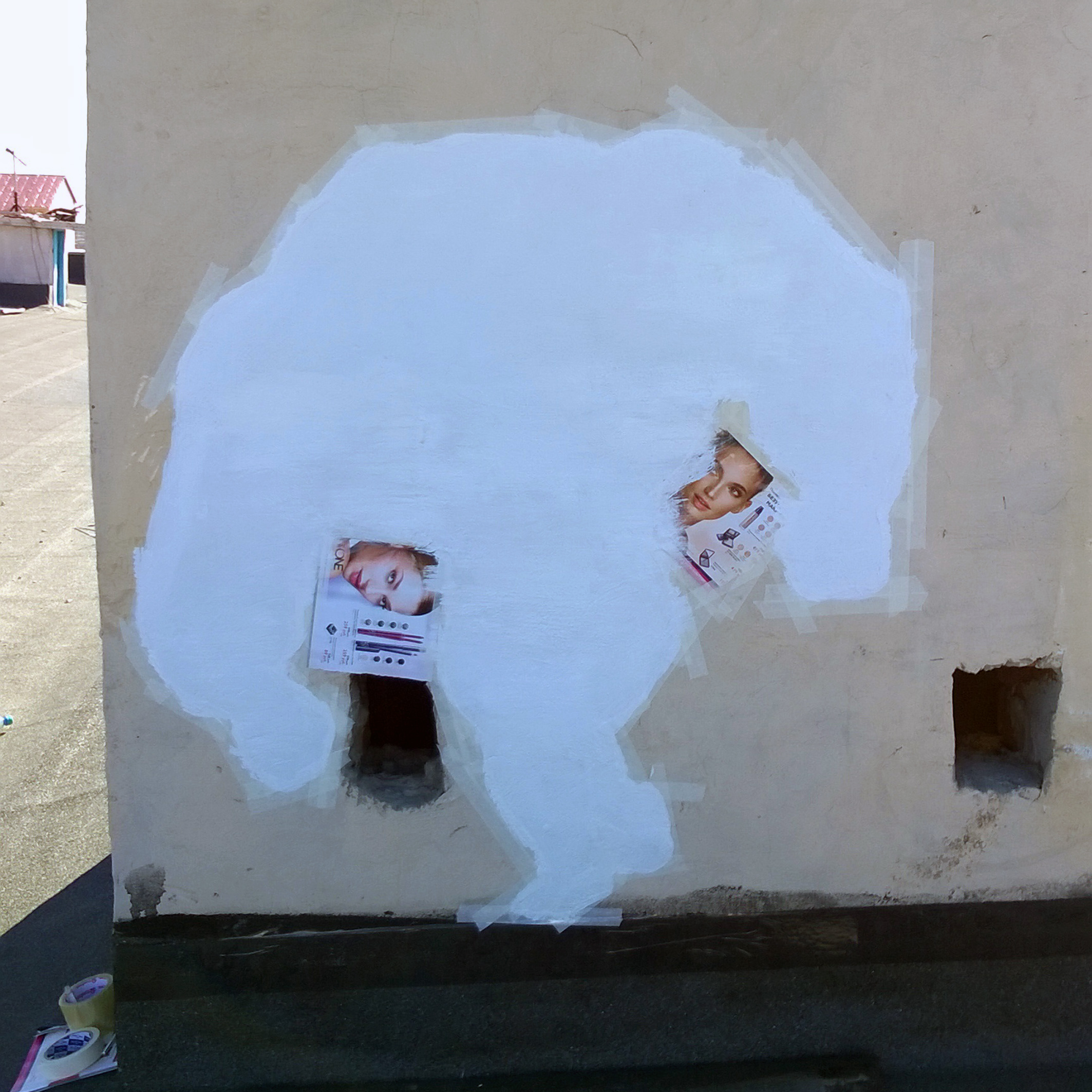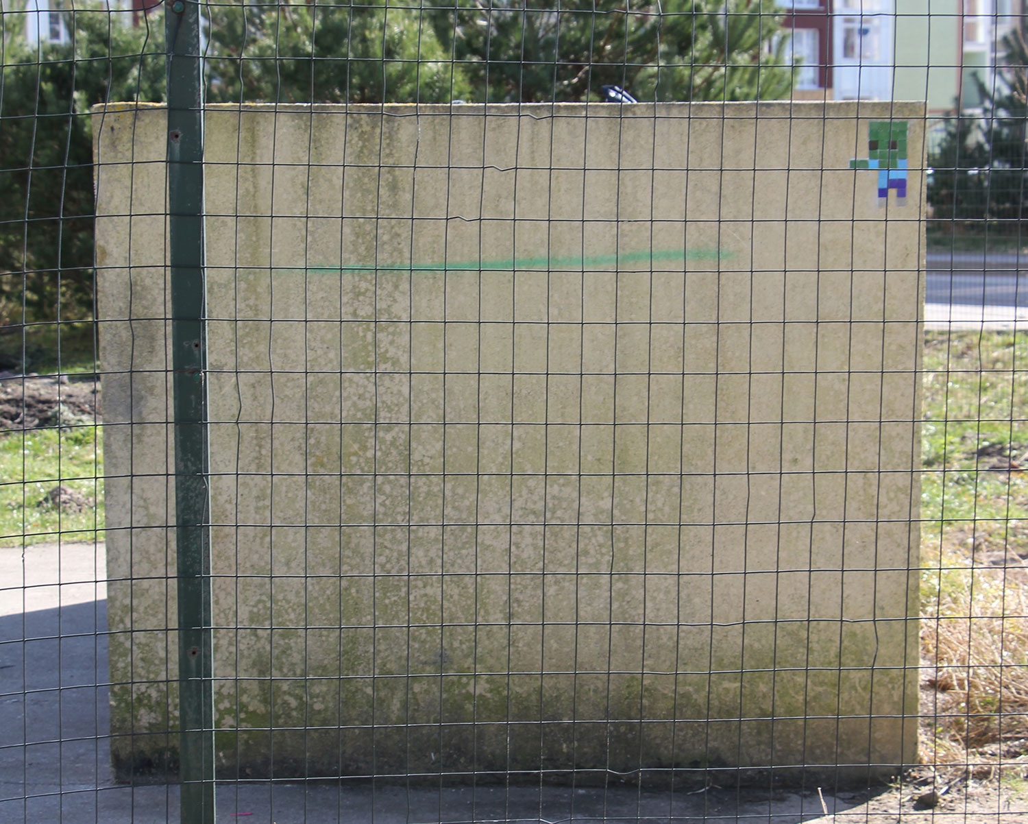 Место для мозаики выбрал во дворе на кирпичном ограждении вокруг мусорных контейнеров. Приклеивал плиточным колеем церезит см14 (клей класса с2). Приклеил к стене шаблон, нанёс шпателем клей, убрал лишнее гребенчатым шпателем 4мм, убрал шаблон, приклеил мозаику прямо вместе с малярной лентой, пальцем разгладил клей по периметру фигуры. Малярную ленту отклеил на следующий день когда клей схватился.