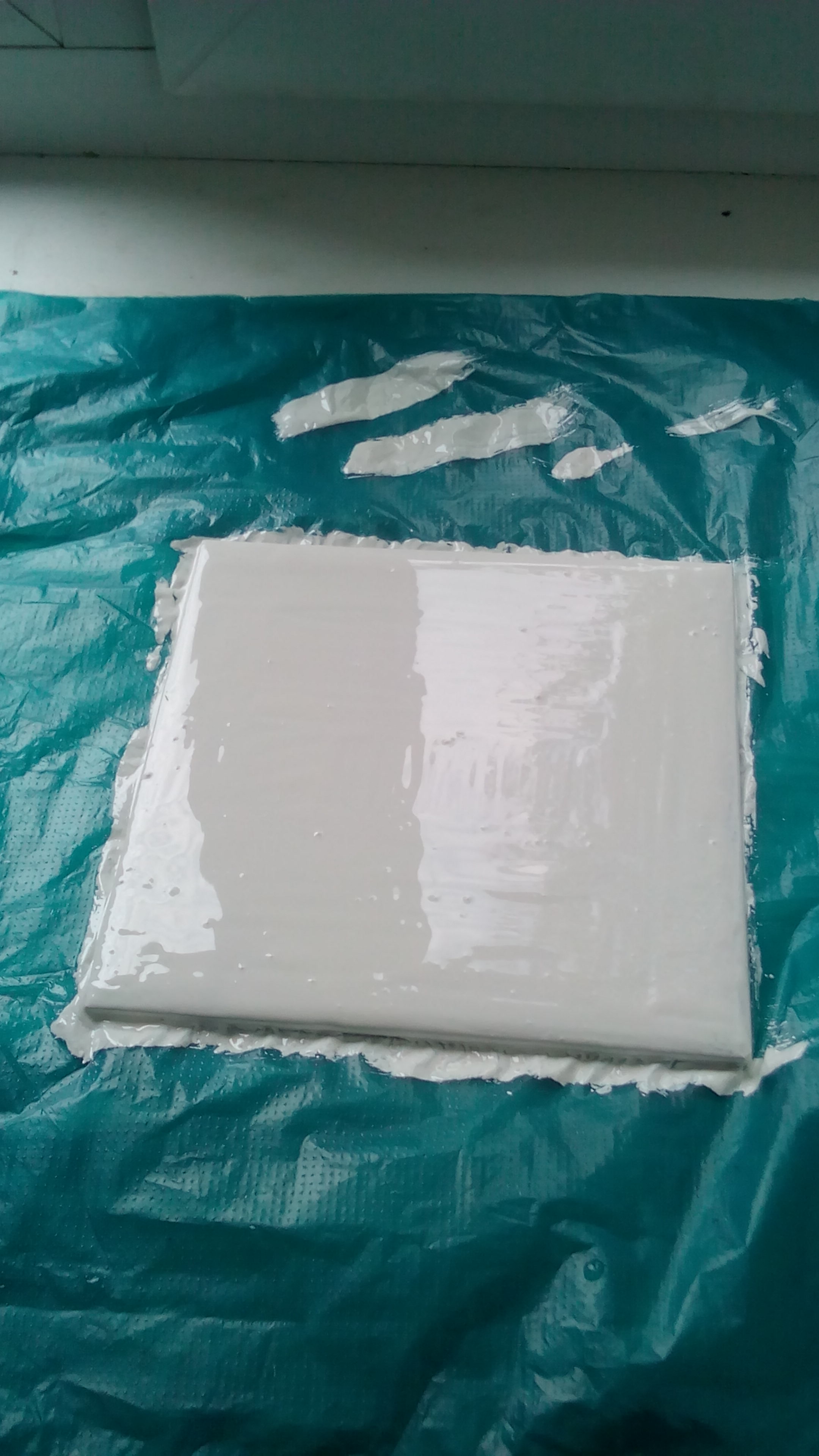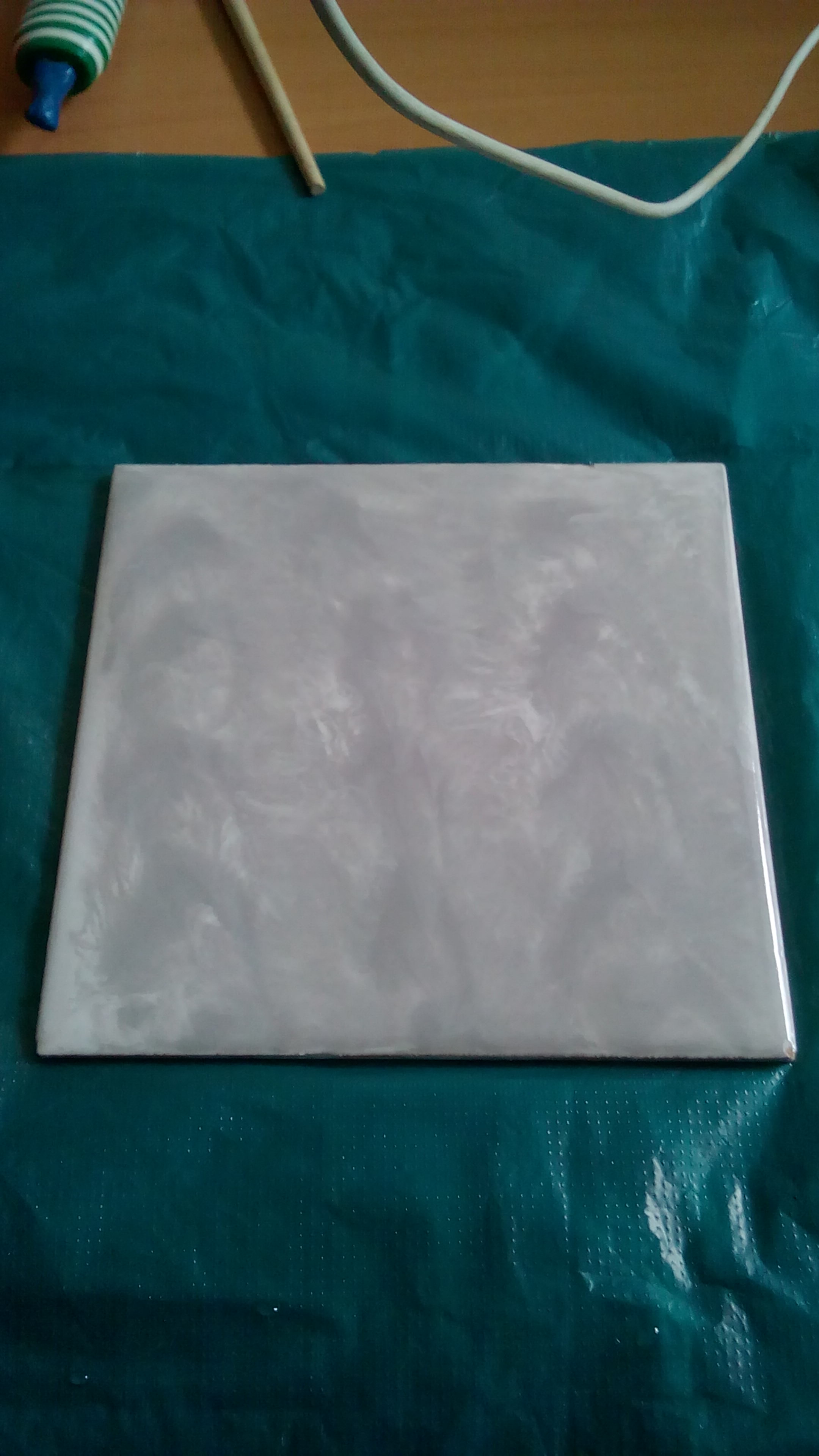 Нашёл на балконе плитку десятилетней давности и эмаль по дереву и металлу, покрасил одну плитку в белый, сегодня сохнет, завтра подумаю, чем её можно покрасить сверху, чтобы был рисунок.